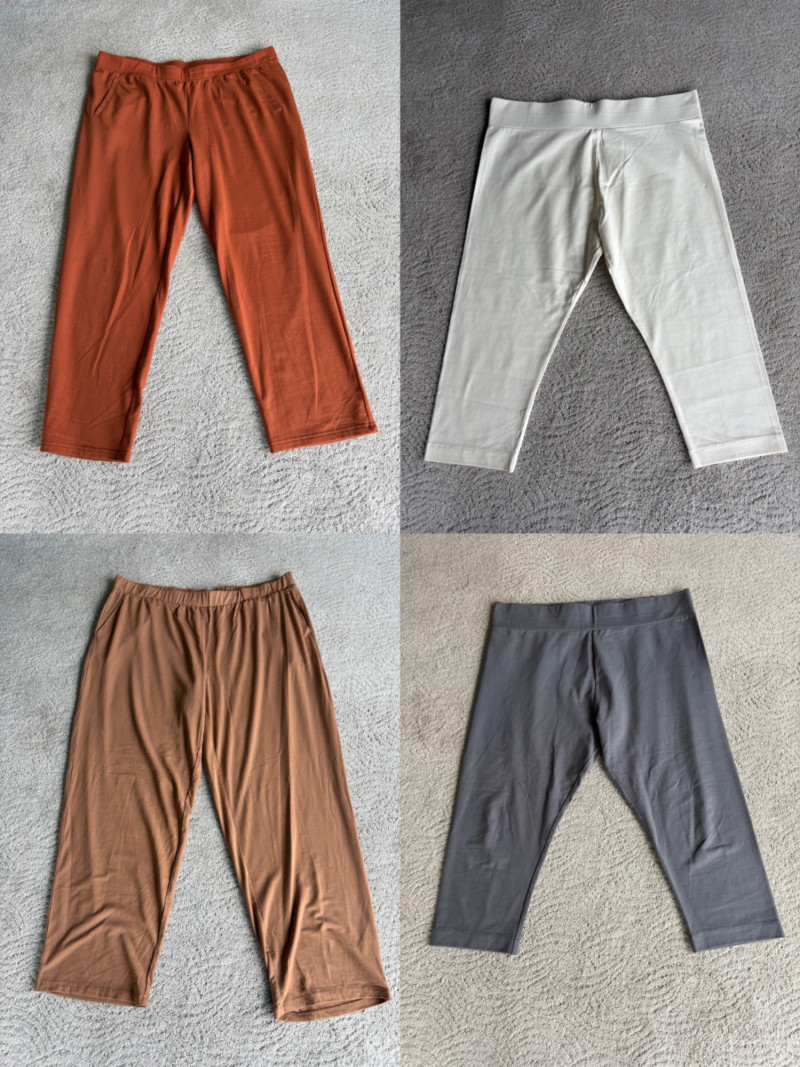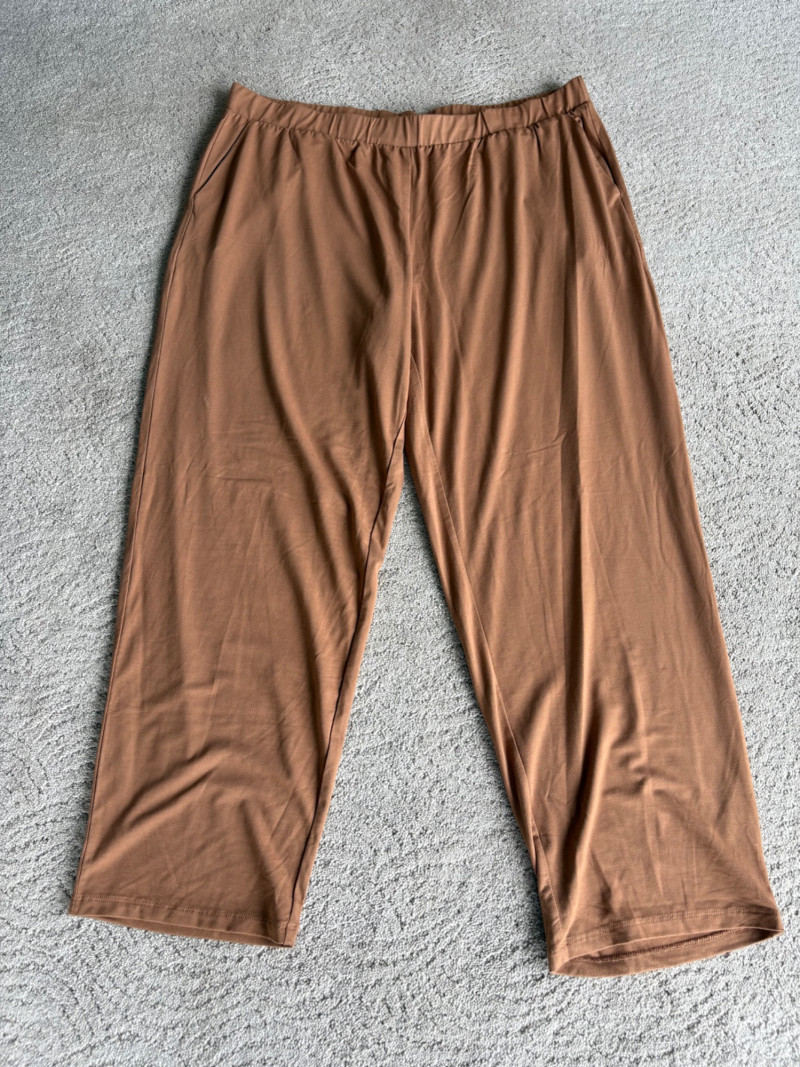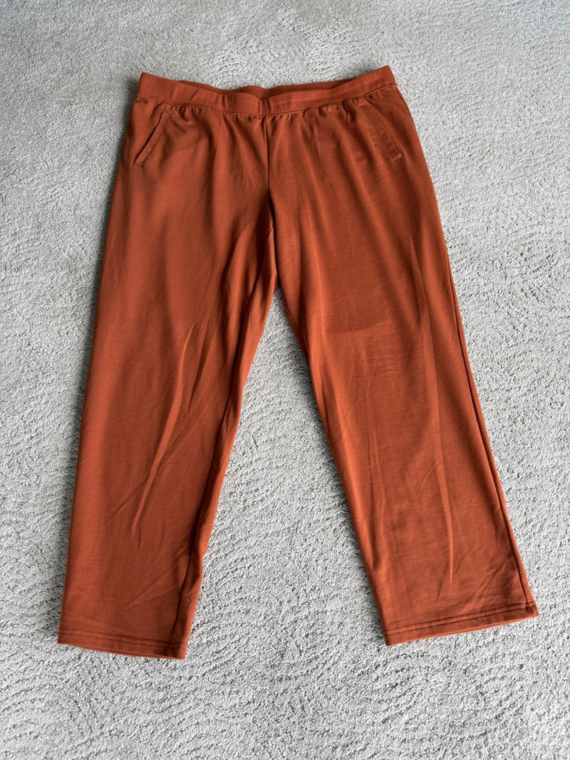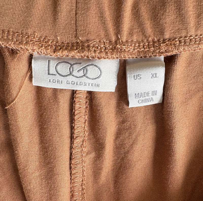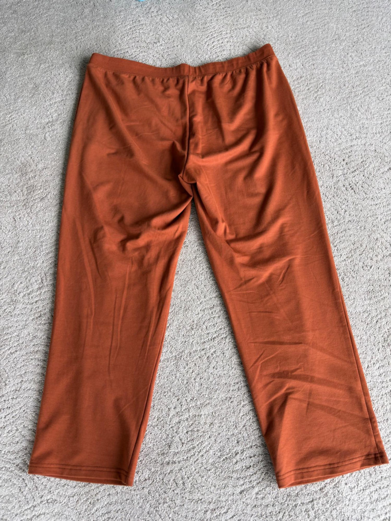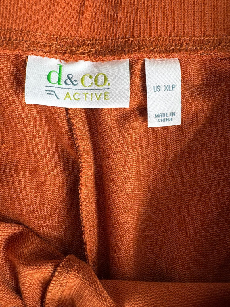 4 pairs of comfy knit pants from LOGO and D&Co. All measure 20" side to side at waist. DG2 rusty orange knit pants have ribbed waistband and front welted slash pockets. Cotton/polyester/spandex blend. Size tag says XLP. LOGO white knit pants have wide flat elasticated waistband and appear to be cropped. Cotton/spandex blend. Size tag says XL. LOGO grey knit pants have wide flat elasticated waistband and appear to be cropped. Cotton/spandex blend. Size tag says XL. LOGO brown/tan knit pants have flat elasticated waistband and set-in side pockets in flowing fabric. Rayon/spandex blend. Size tag says XL.