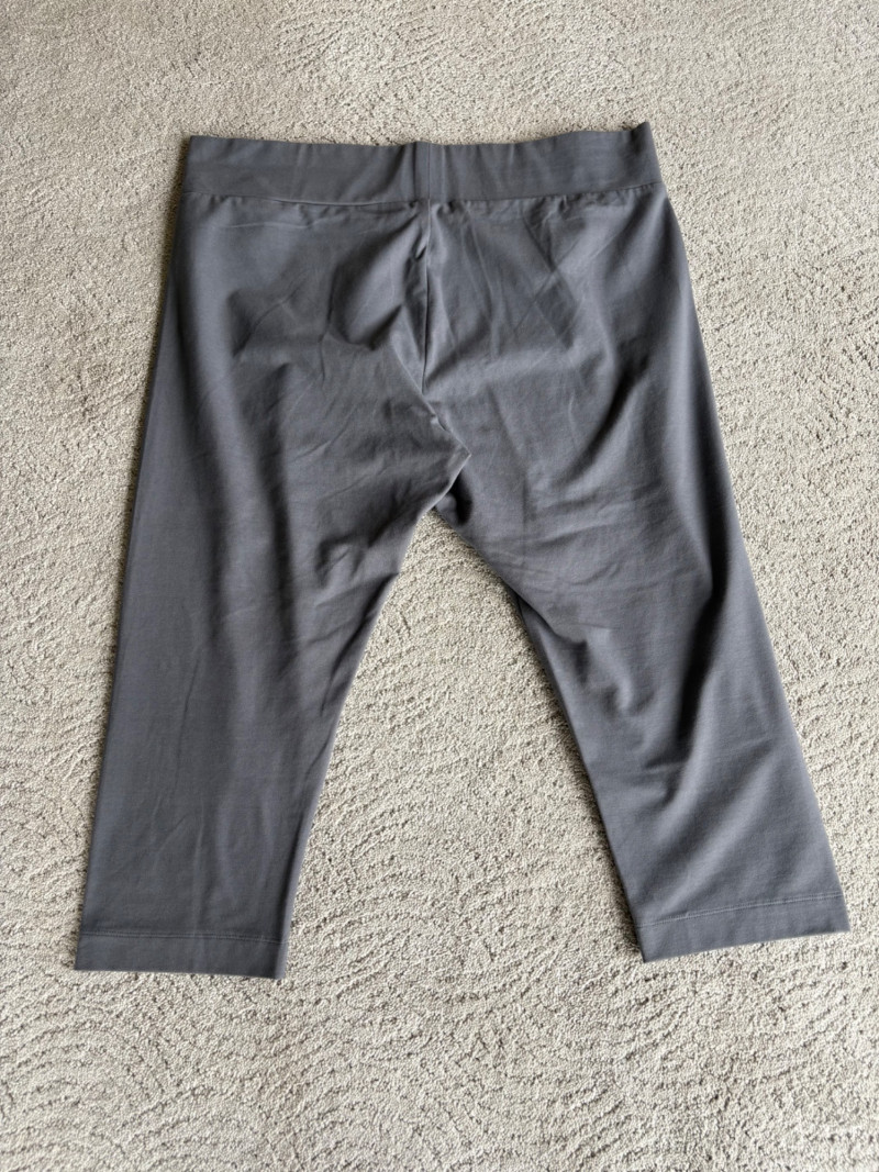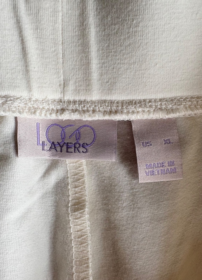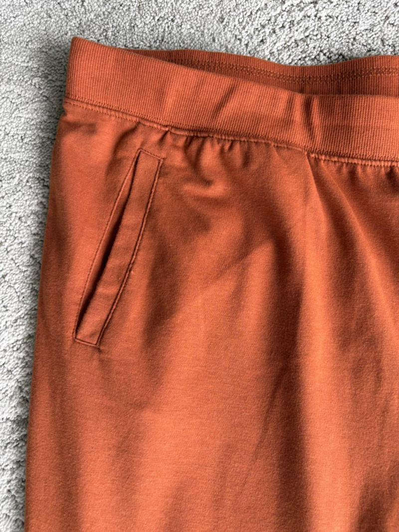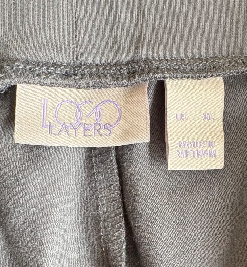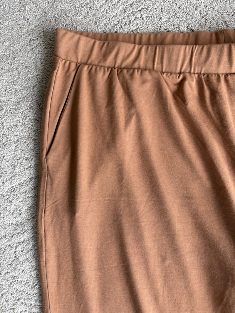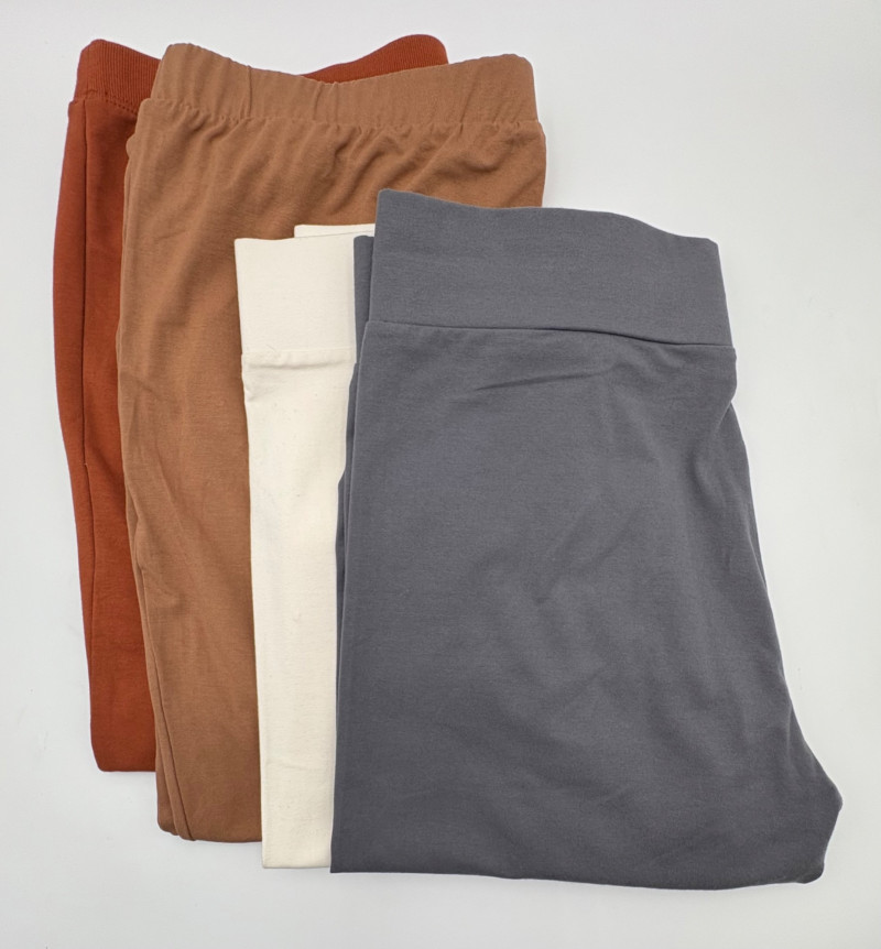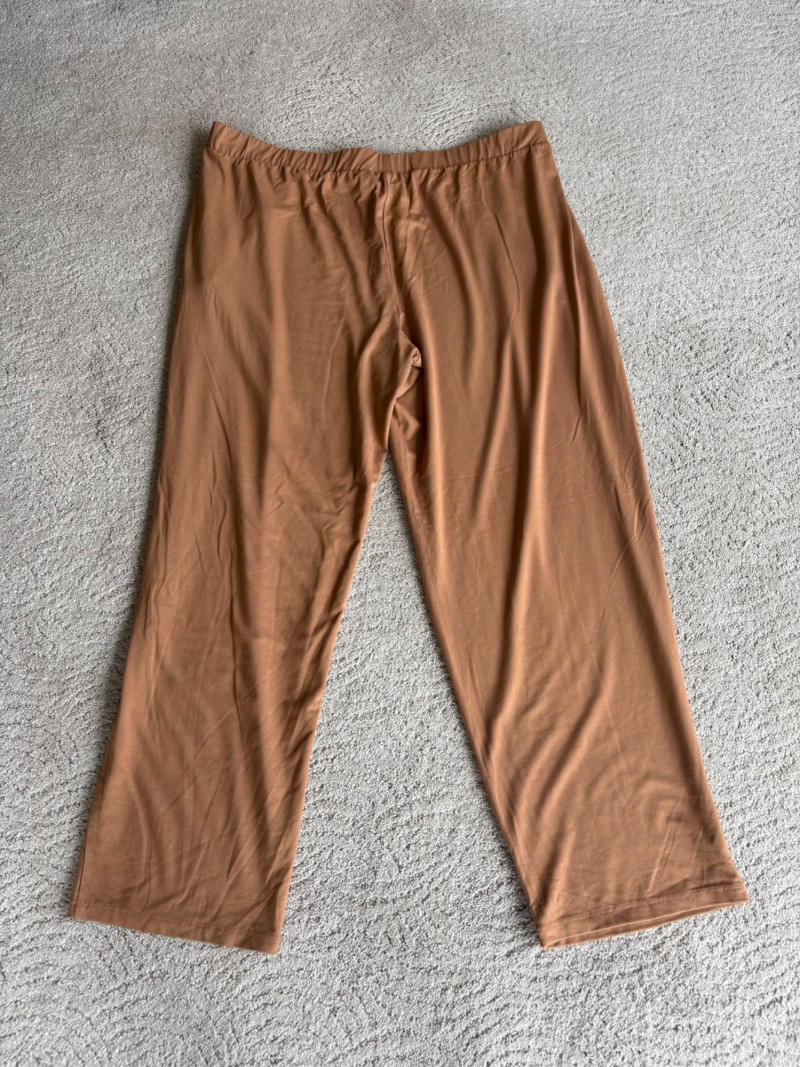 4 pairs of comfy knit pants from LOGO and D&Co. All measure 20" side to side at waist. DG2 rusty orange knit pants have ribbed waistband and front welted slash pockets. Cotton/polyester/spandex blend. Size tag says XLP. LOGO white knit pants have wide flat elasticated waistband and appear to be cropped. Cotton/spandex blend. Size tag says XL. LOGO grey knit pants have wide flat elasticated waistband and appear to be cropped. Cotton/spandex blend. Size tag says XL. LOGO brown/tan knit pants have flat elasticated waistband and set-in side pockets in flowing fabric. Rayon/spandex blend. Size tag says XL.