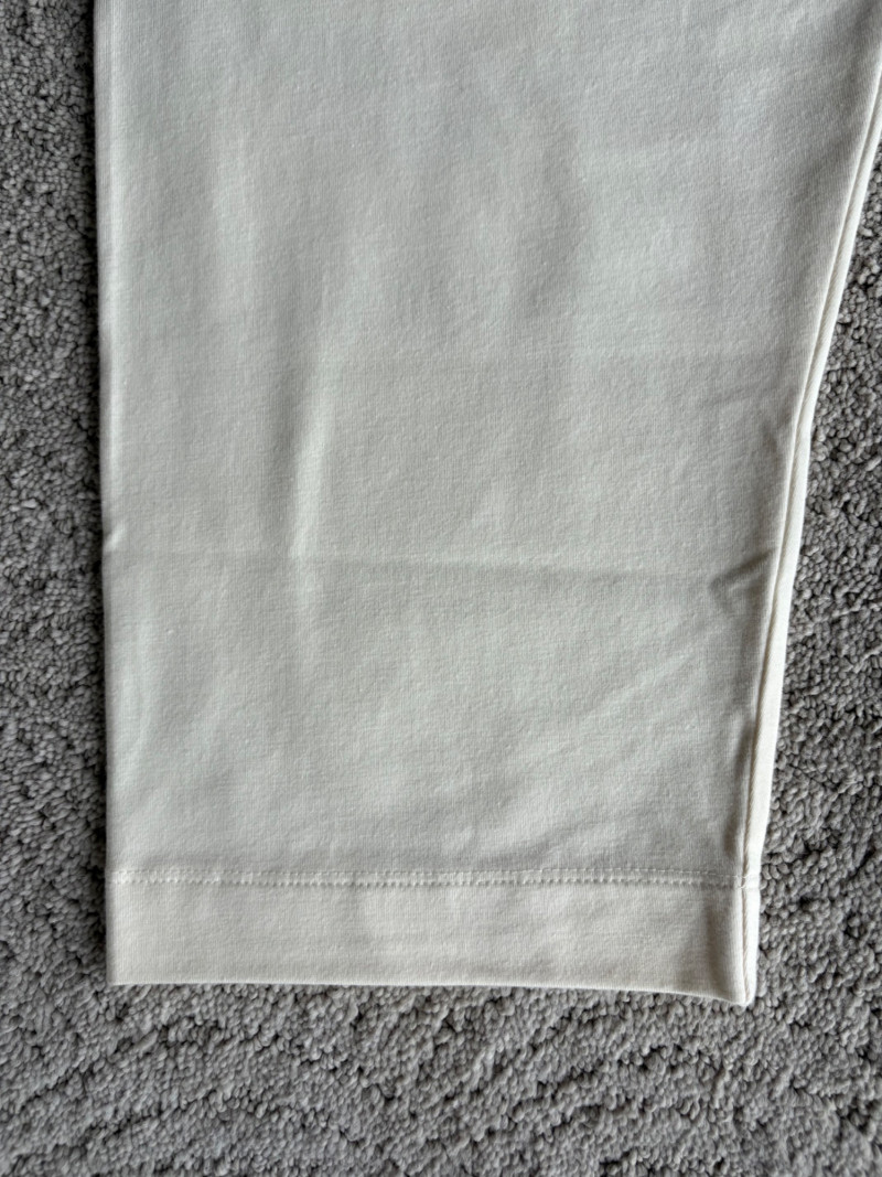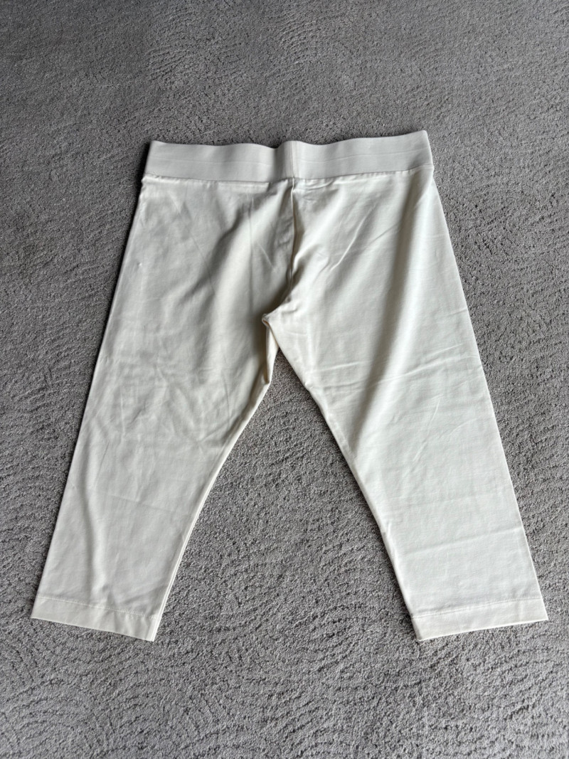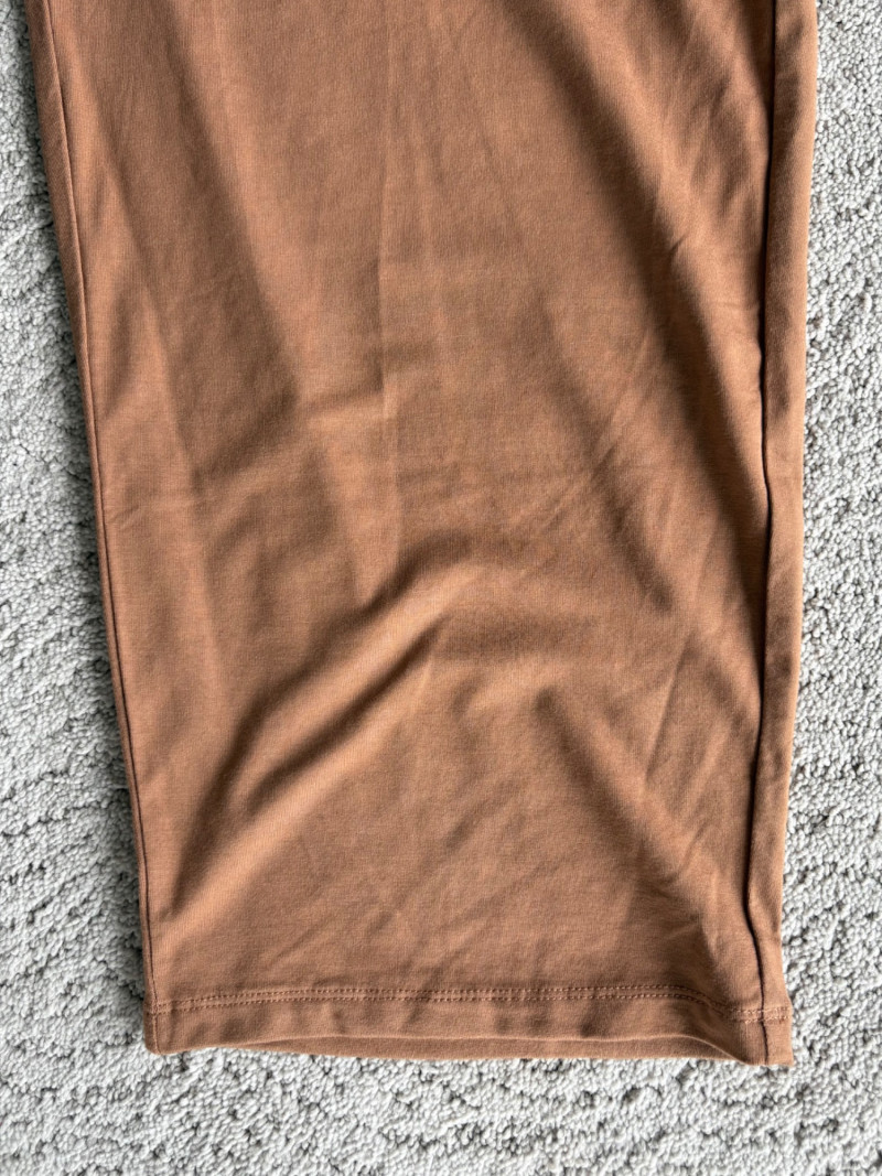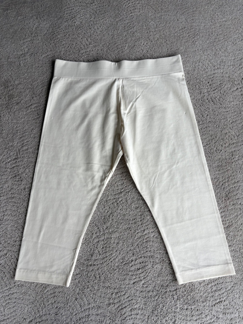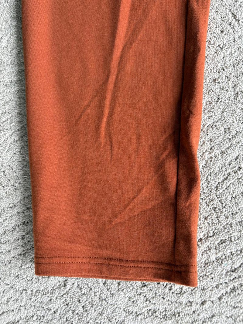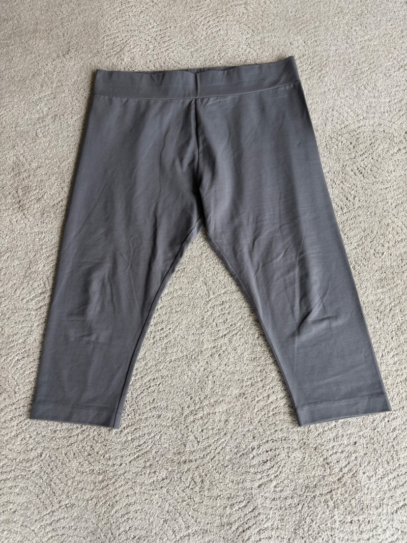4 pairs of comfy knit pants from LOGO and D&Co. All measure 20" side to side at waist. DG2 rusty orange knit pants have ribbed waistband and front welted slash pockets. Cotton/polyester/spandex blend. Size tag says XLP. LOGO white knit pants have wide flat elasticated waistband and appear to be cropped. Cotton/spandex blend. Size tag says XL. LOGO grey knit pants have wide flat elasticated waistband and appear to be cropped. Cotton/spandex blend. Size tag says XL. LOGO brown/tan knit pants have flat elasticated waistband and set-in side pockets in flowing fabric. Rayon/spandex blend. Size tag says XL.