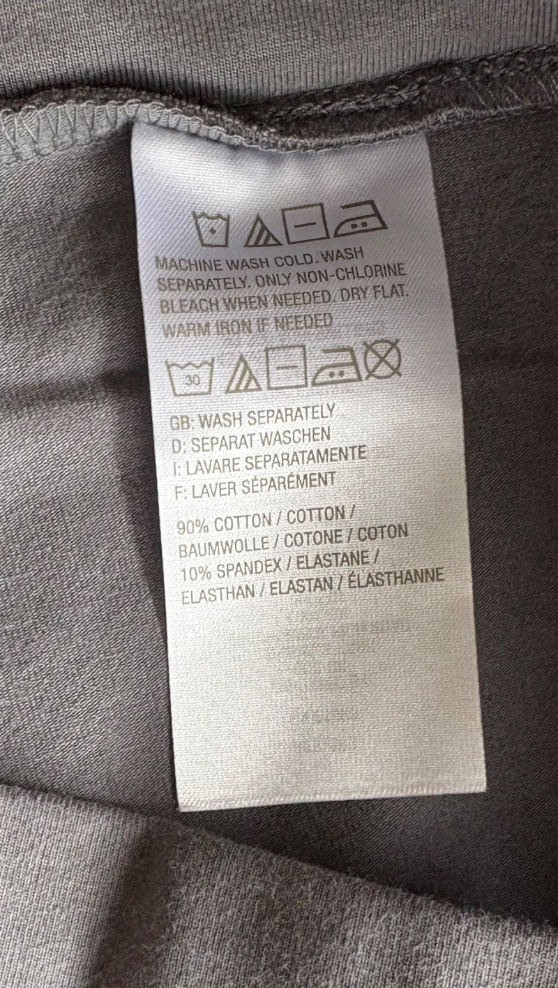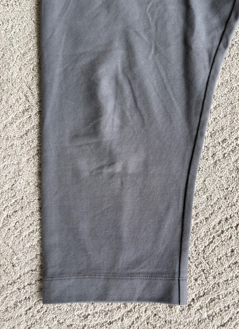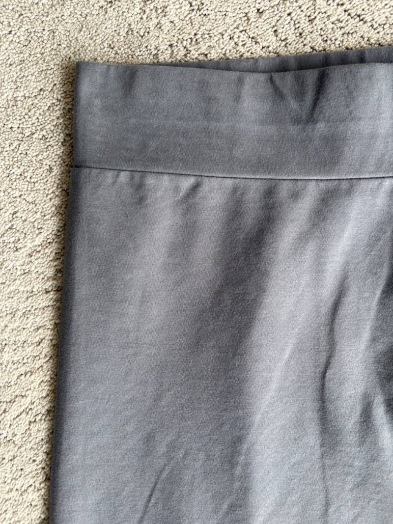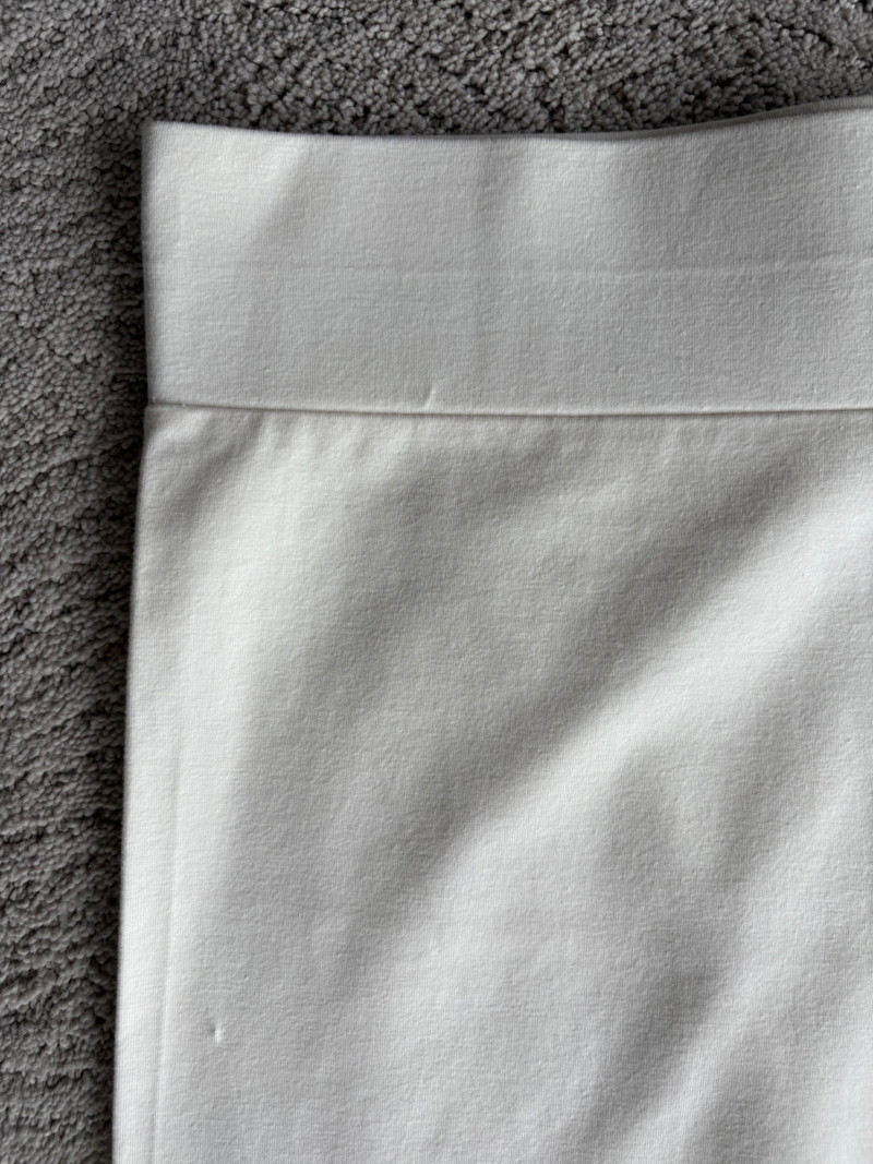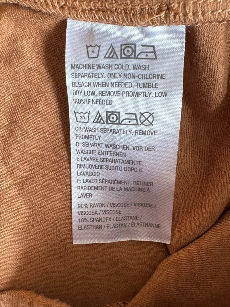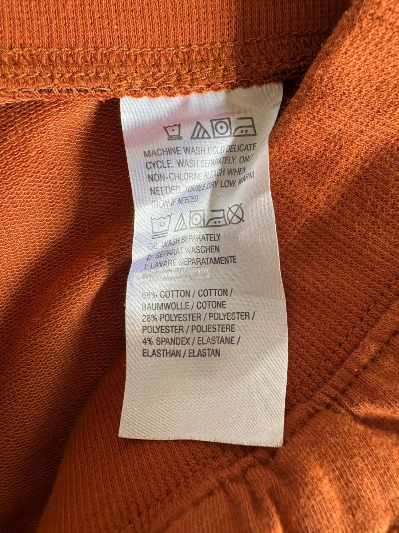 4 pairs of comfy knit pants from LOGO and D&Co. All measure 20" side to side at waist. DG2 rusty orange knit pants have ribbed waistband and front welted slash pockets. Cotton/polyester/spandex blend. Size tag says XLP. LOGO white knit pants have wide flat elasticated waistband and appear to be cropped. Cotton/spandex blend. Size tag says XL. LOGO grey knit pants have wide flat elasticated waistband and appear to be cropped. Cotton/spandex blend. Size tag says XL. LOGO brown/tan knit pants have flat elasticated waistband and set-in side pockets in flowing fabric. Rayon/spandex blend. Size tag says XL.
