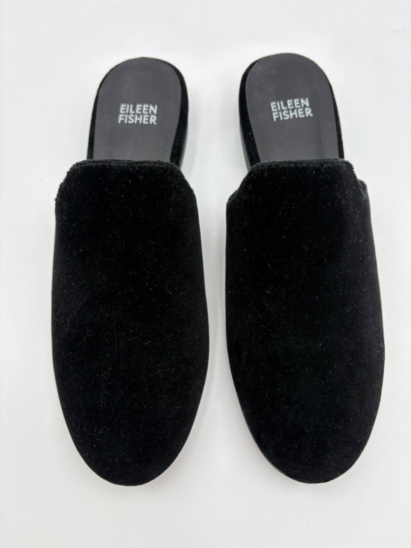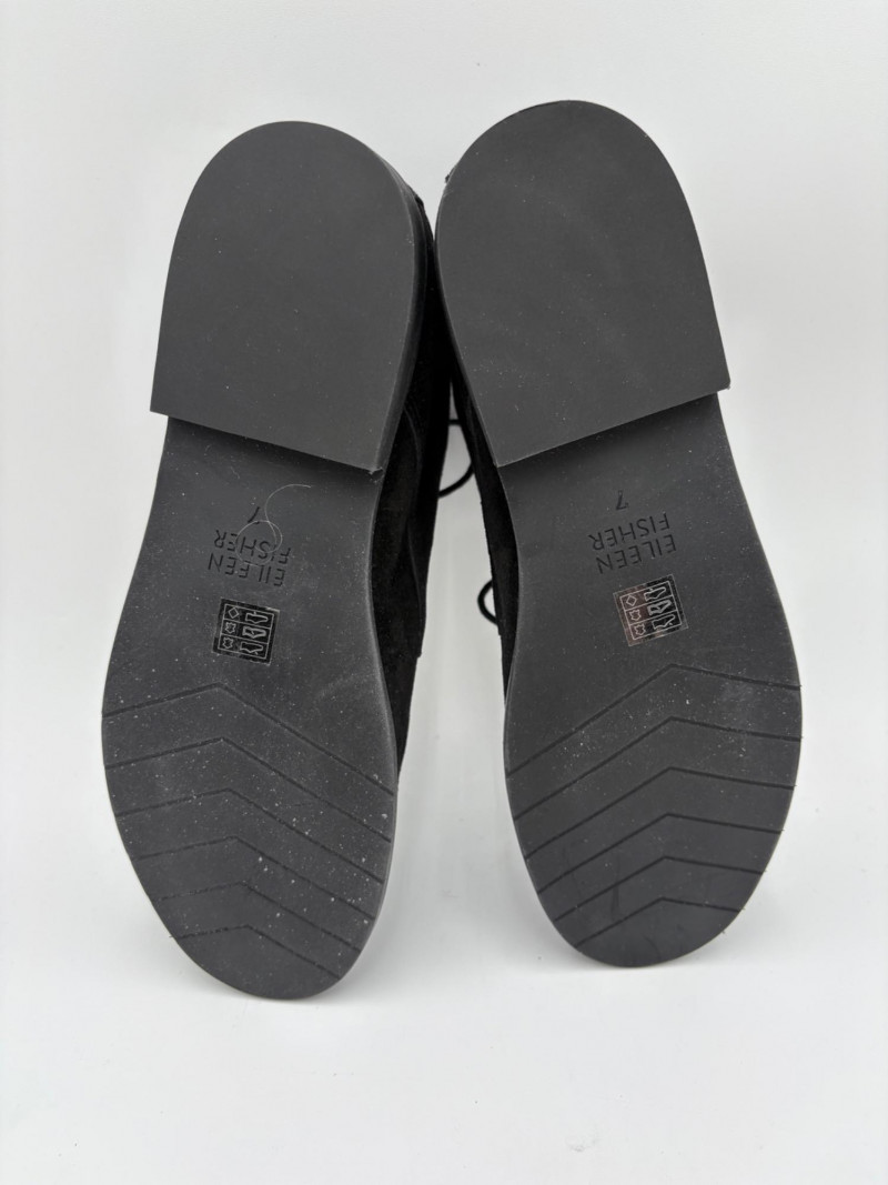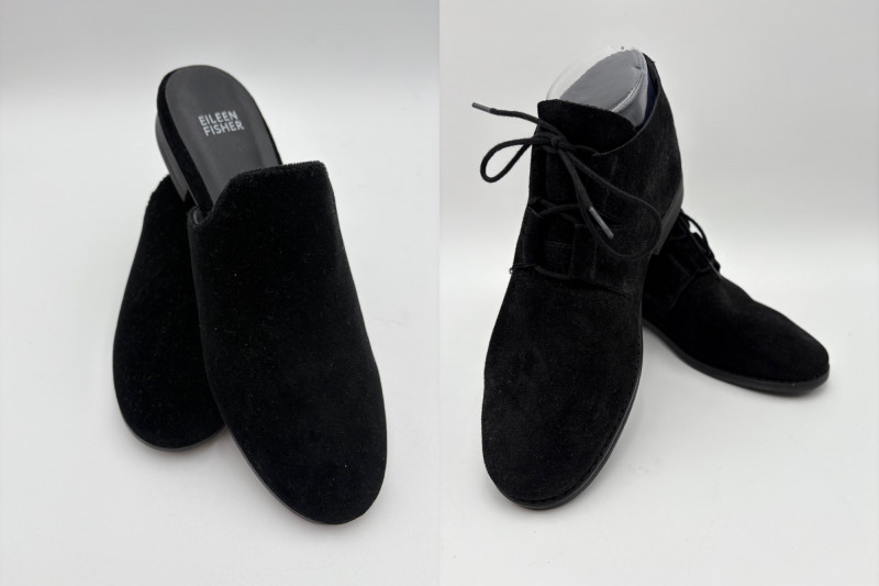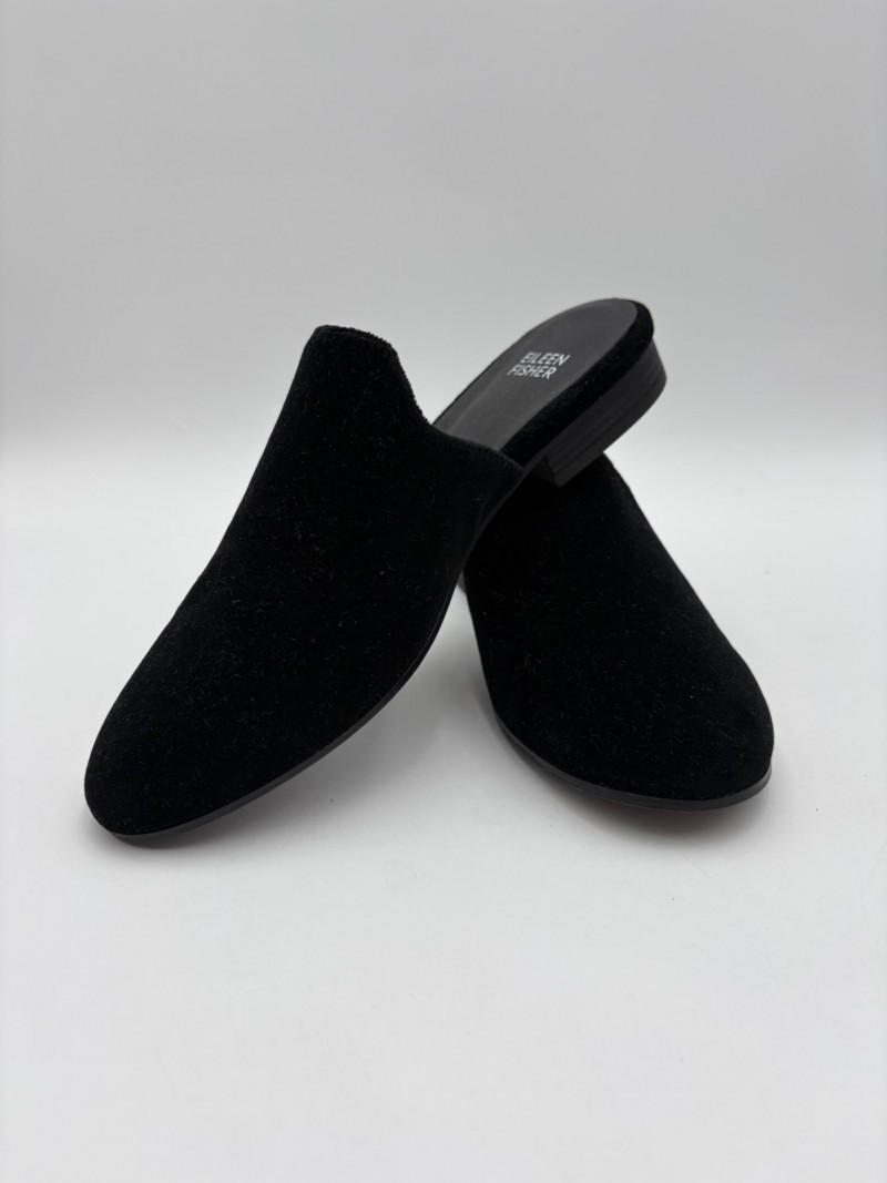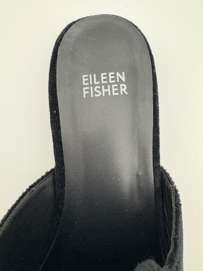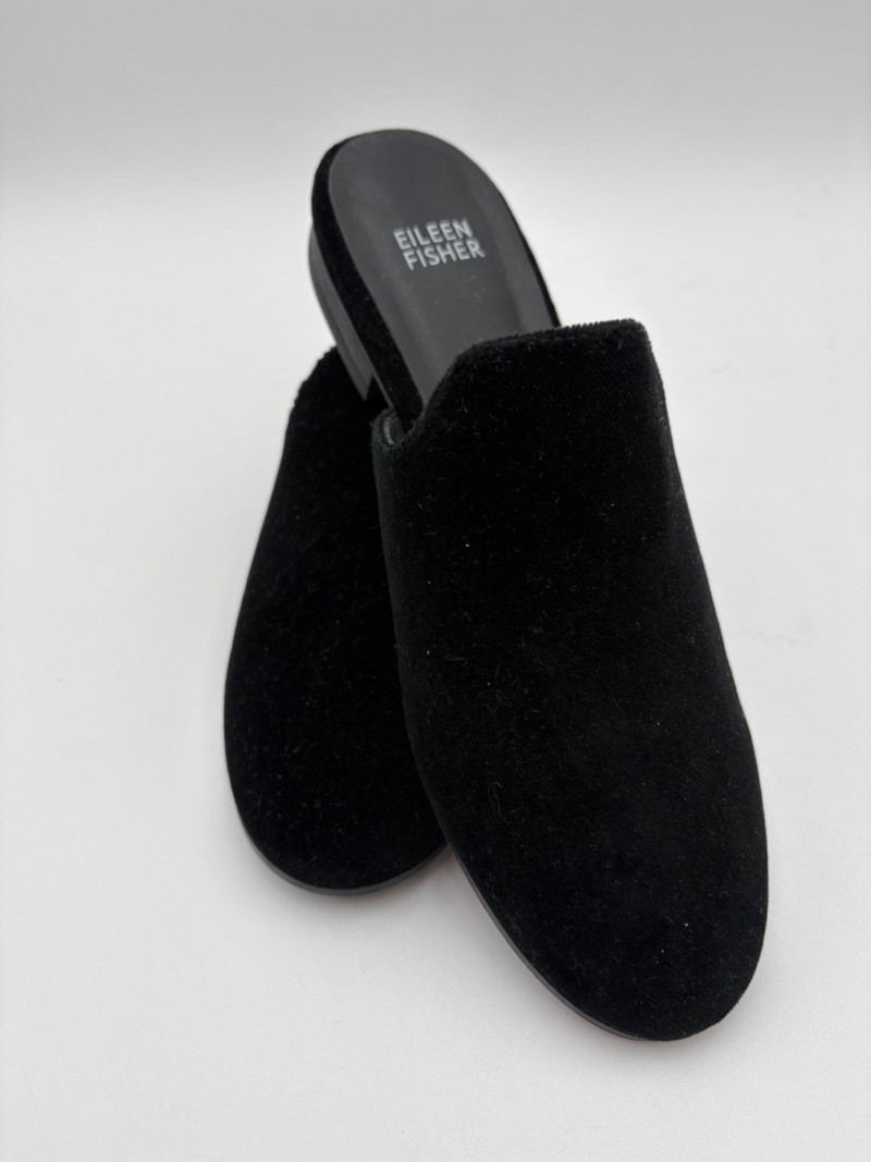 Eileen Fisher black velvet minimalist mules with stacked heel & leather sole. Appear to be new. Size 7. Eileen Fisher black suede ankle boots have unique tie over vamp and a stacked leather sole. Appear to be new. Size 7.