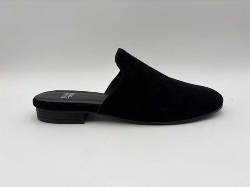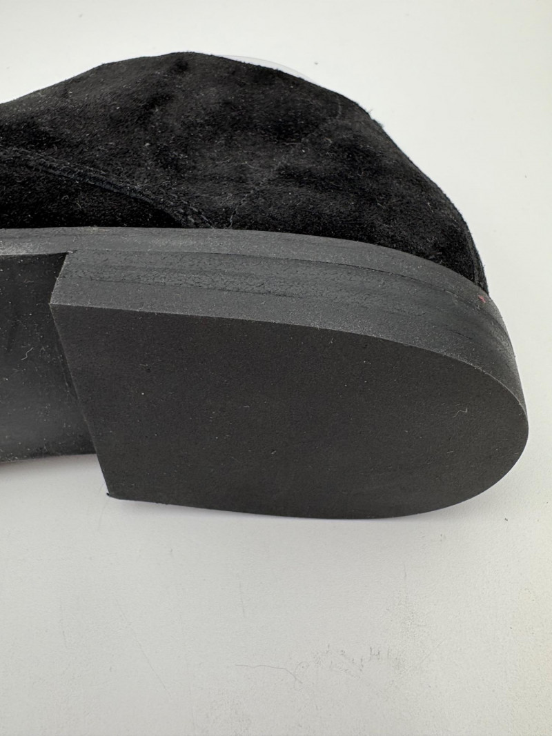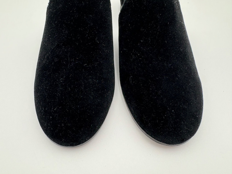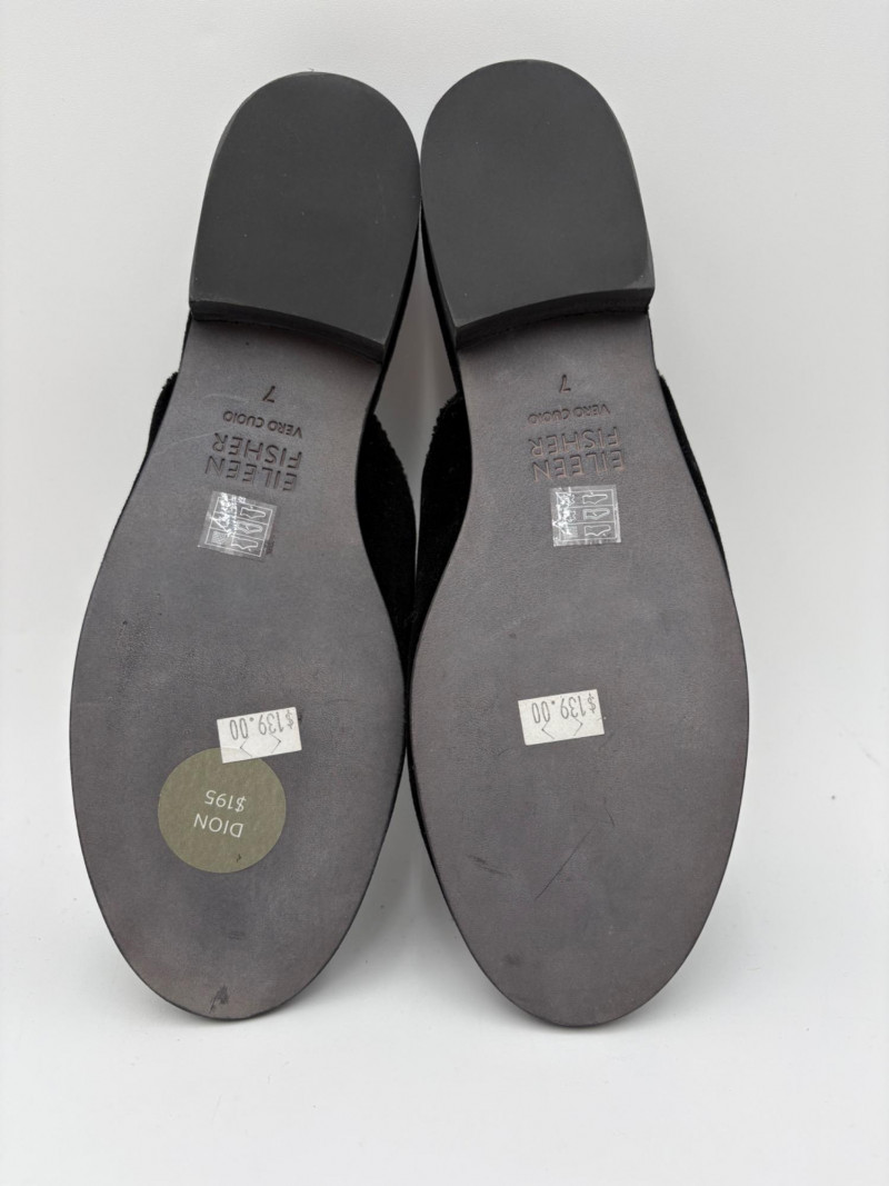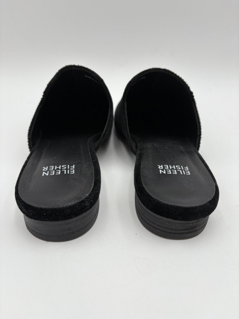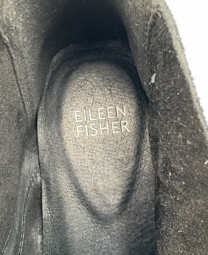 Eileen Fisher black velvet minimalist mules with stacked heel & leather sole. Appear to be new. Size 7. Eileen Fisher black suede ankle boots have unique tie over vamp and a stacked leather sole. Appear to be new. Size 7.
