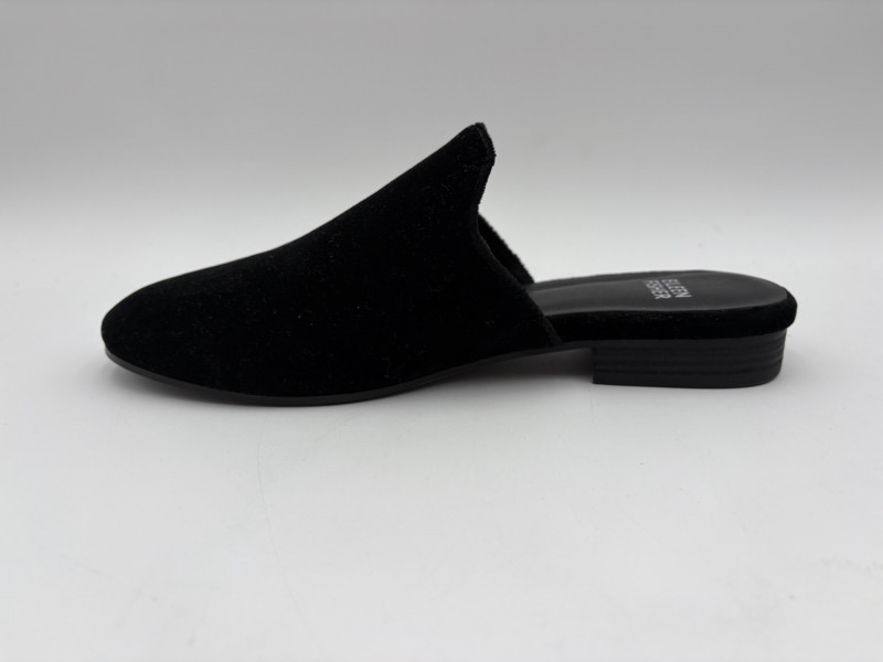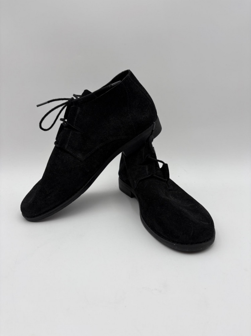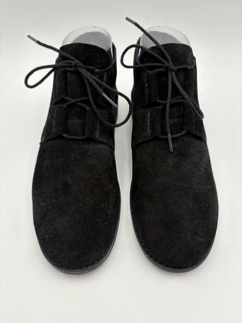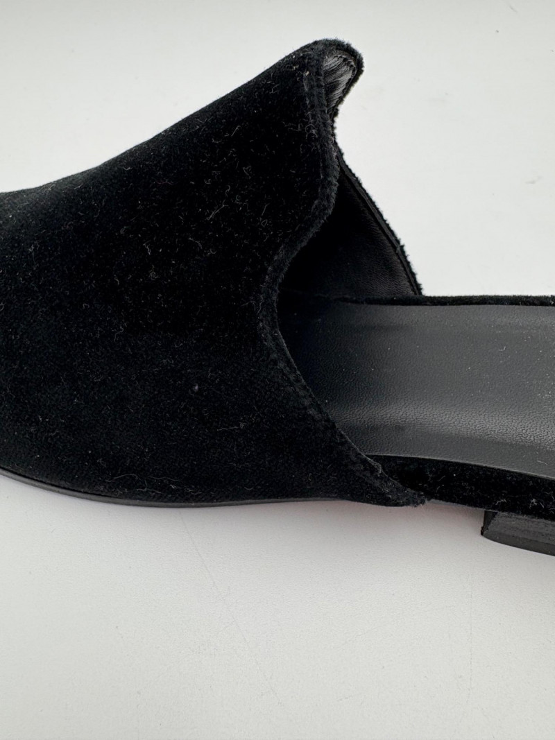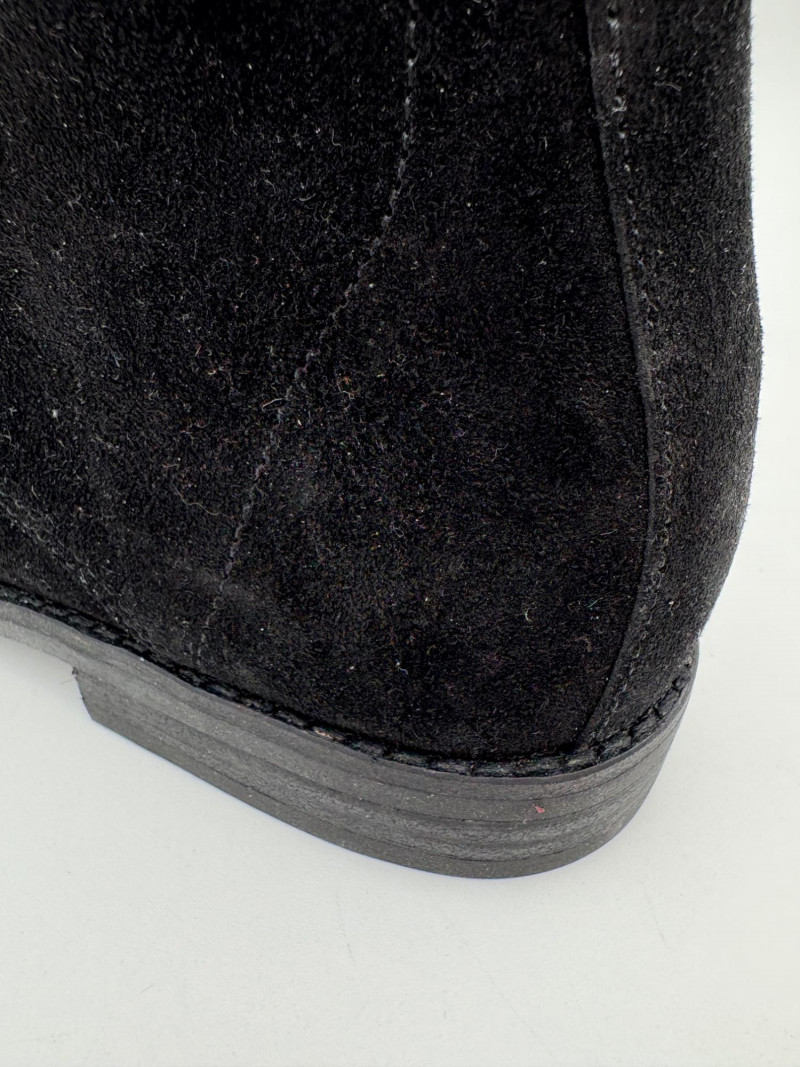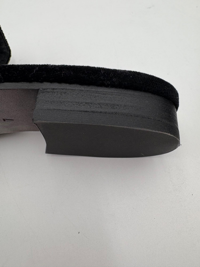 Eileen Fisher black velvet minimalist mules with stacked heel & leather sole. Appear to be new. Size 7. Eileen Fisher black suede ankle boots have unique tie over vamp and a stacked leather sole. Appear to be new. Size 7.