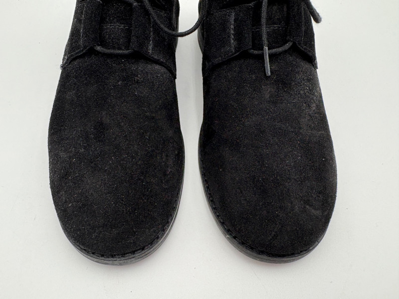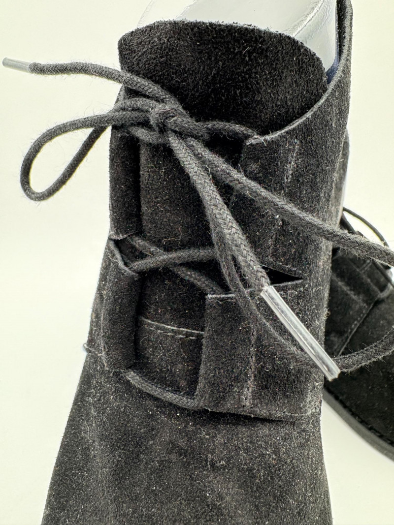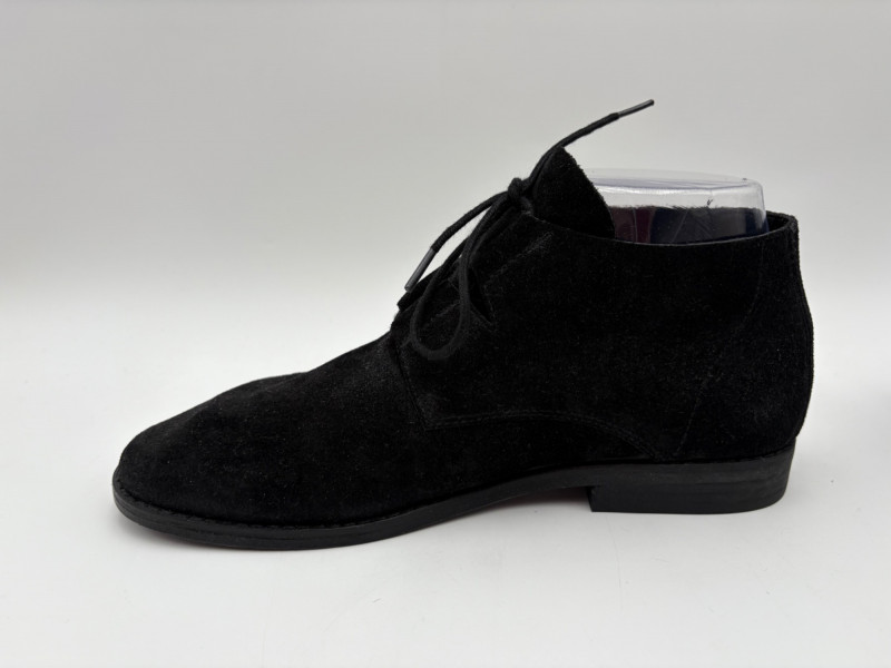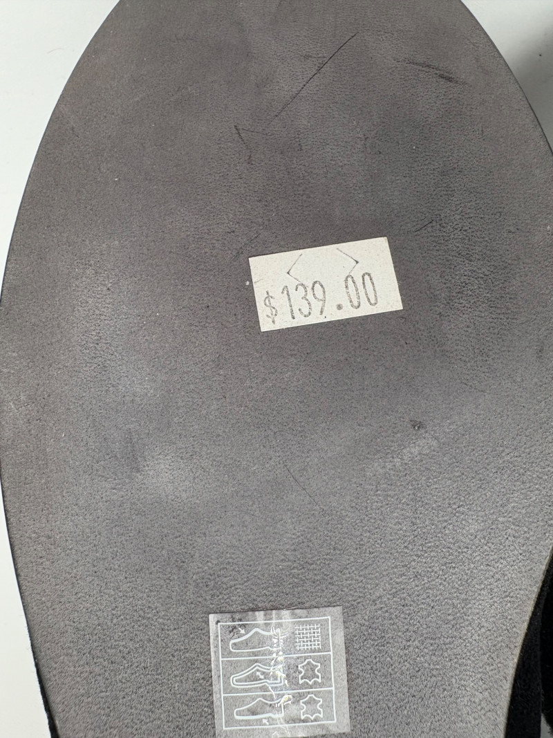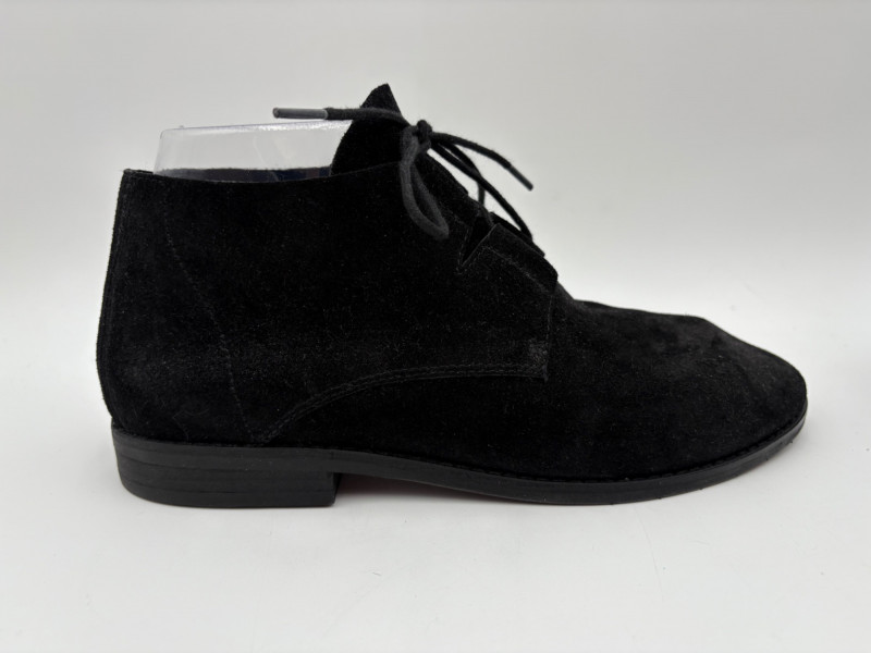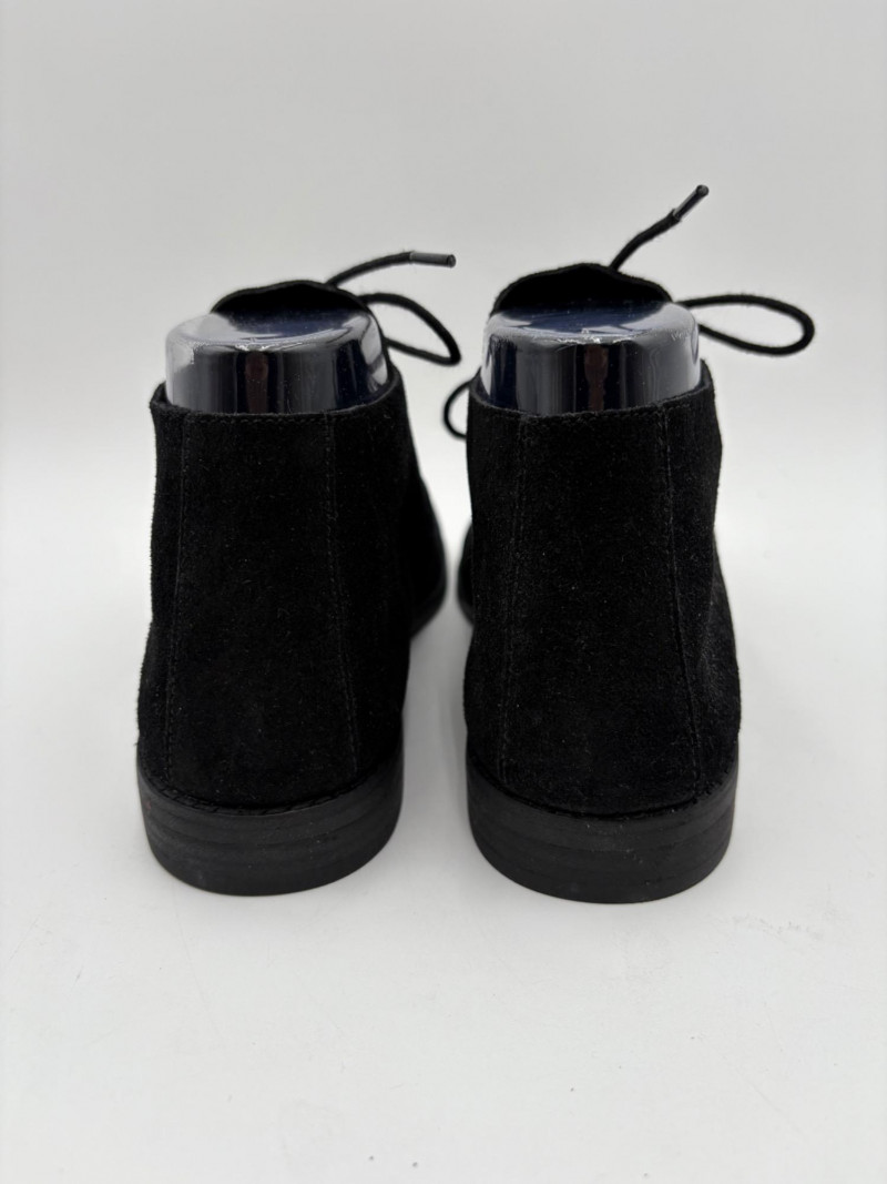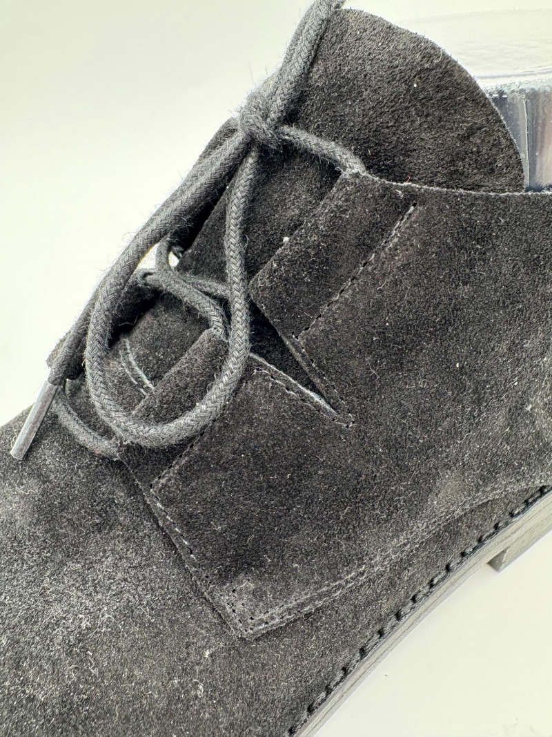 Eileen Fisher black velvet minimalist mules with stacked heel & leather sole. Appear to be new. Size 7. Eileen Fisher black suede ankle boots have unique tie over vamp and a stacked leather sole. Appear to be new. Size 7.