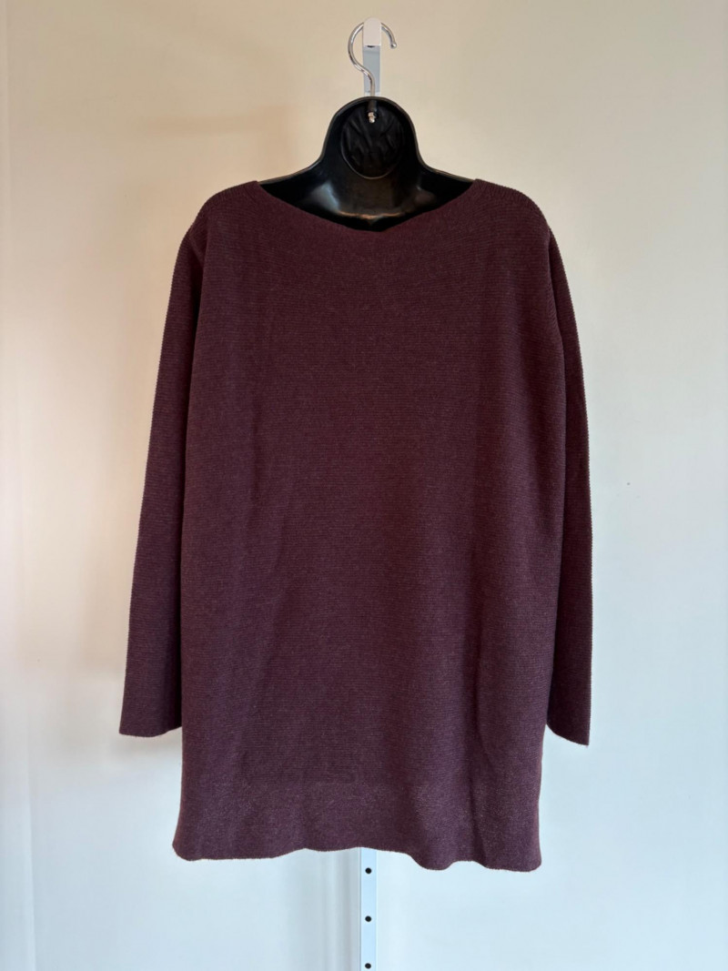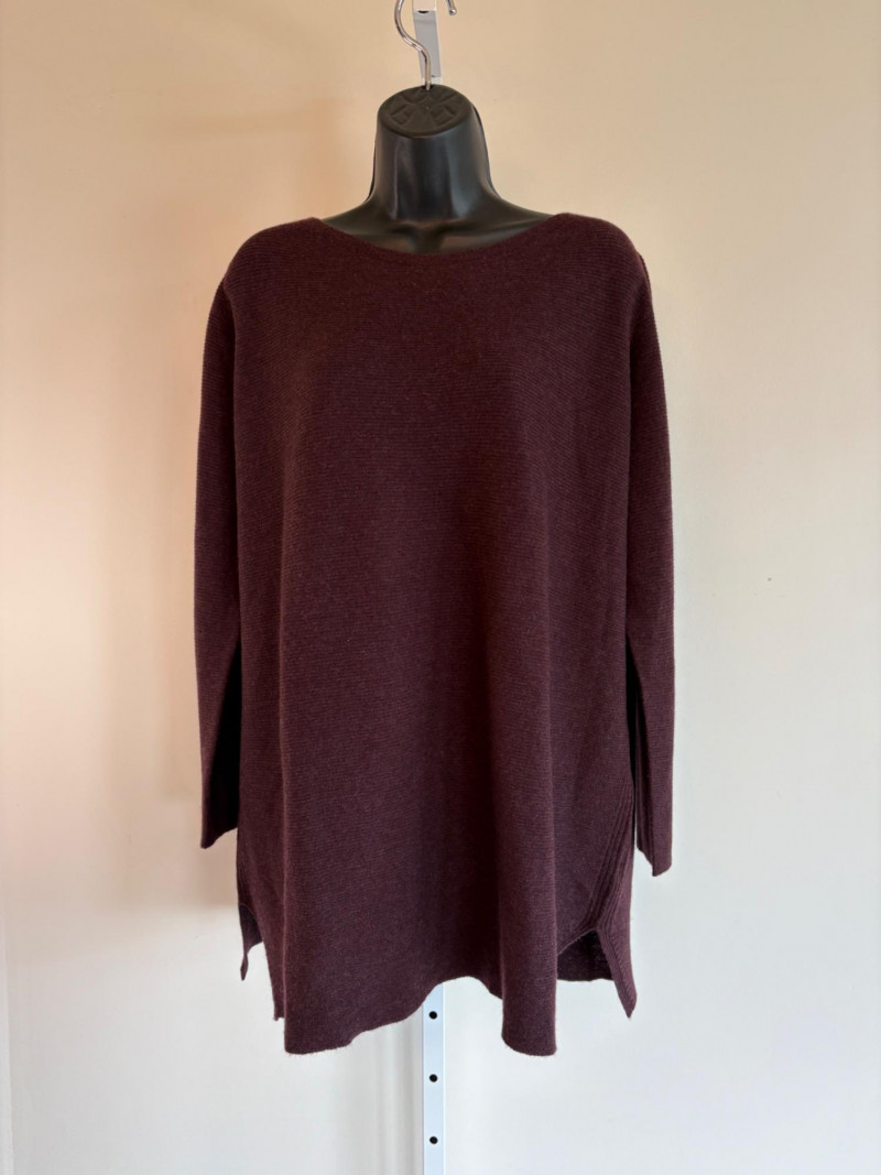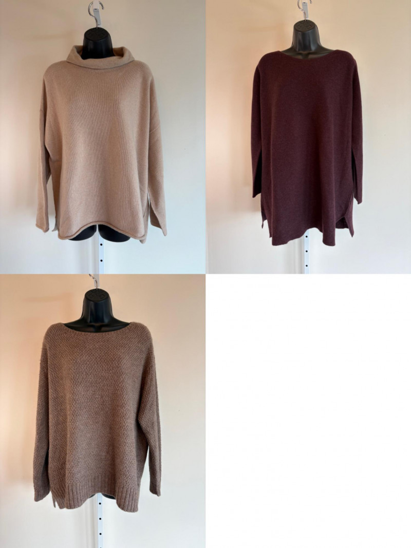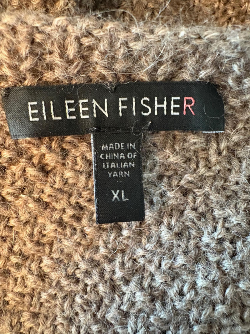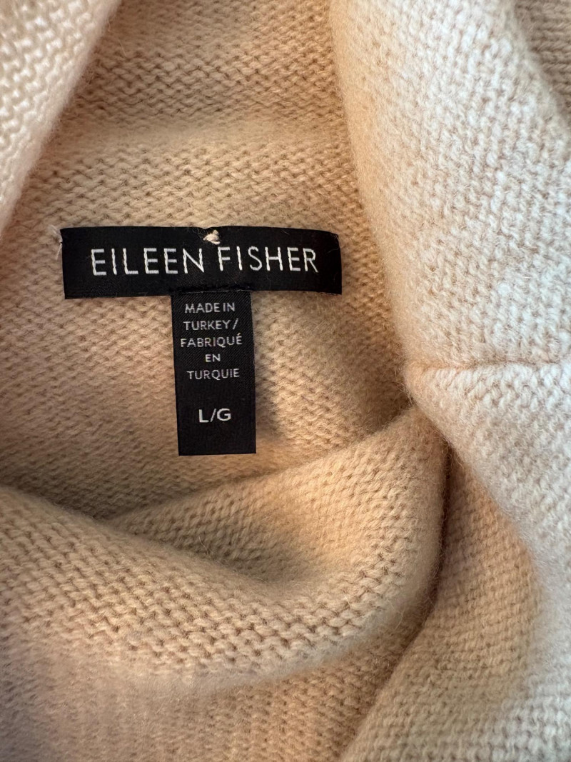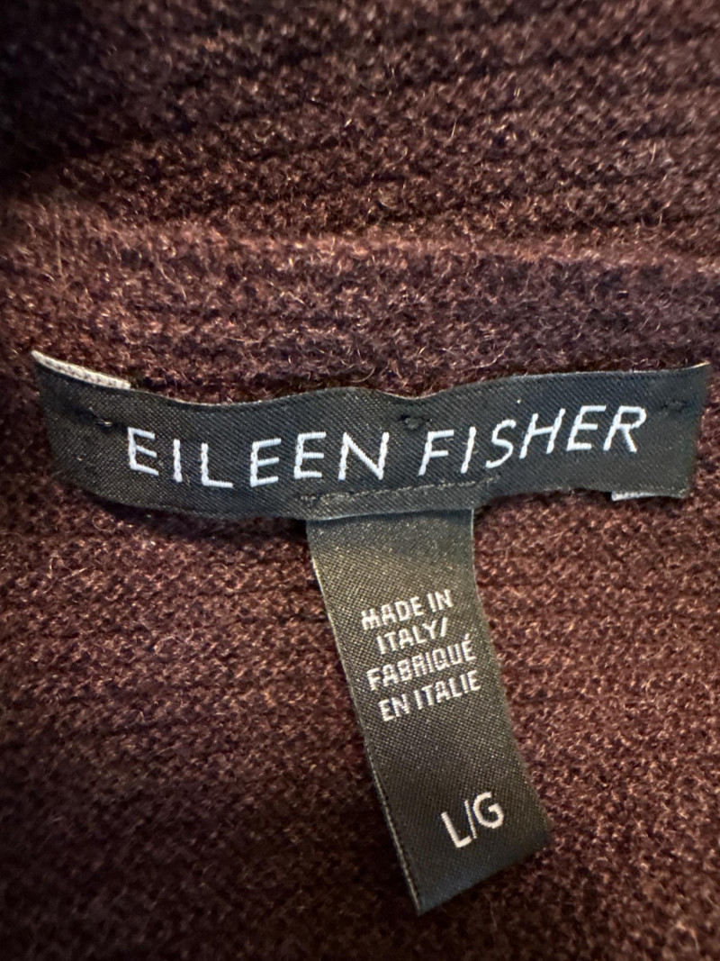 3 wonderfully soft sweaters - all in different styles in neutral tones from Eileen Fisher. All three sweaters measure 25.5" pit to pit. Beige turtleneck sweater has dropped shoulder seams, long sleeves, rolled hem on sleeves/cuffs/neckline, and a split hem with back approximately 2" longer than front. Recycled cashmere/lambs wool blend. Size tag says L. Burgundy/brown sweater has subtle horizontal rib weave, long sleeves, split hem, decorative side seams and curved neckline. 100% cashmere. Size tag says L. Brown textured sweater has round neckline, split hem, and ribbing at cuffs/bottom hem. Alpaca/silk blend. Size tag says XL. Note: sweater is in good condition but would be improved with a quick sweater shave. We also found one slight discoloration at neckline that should launder out. - see last photo.