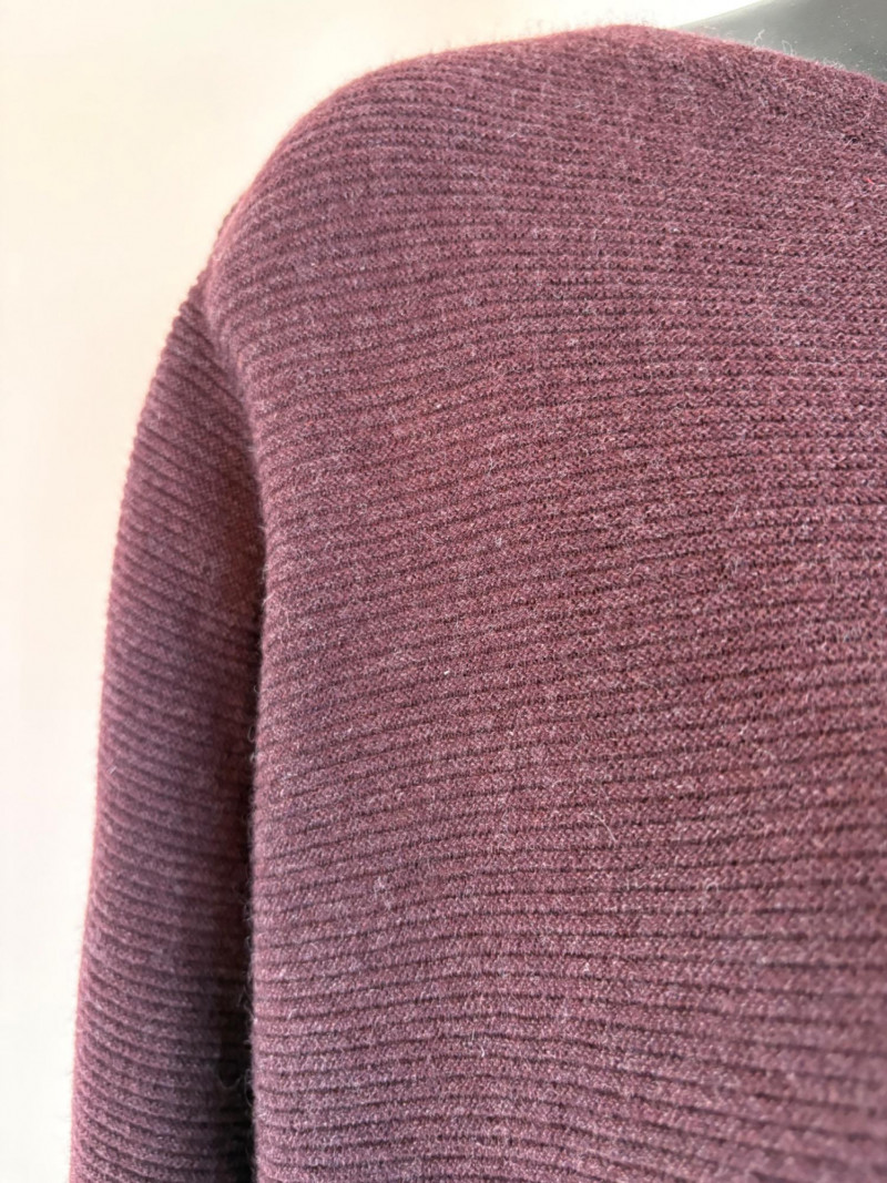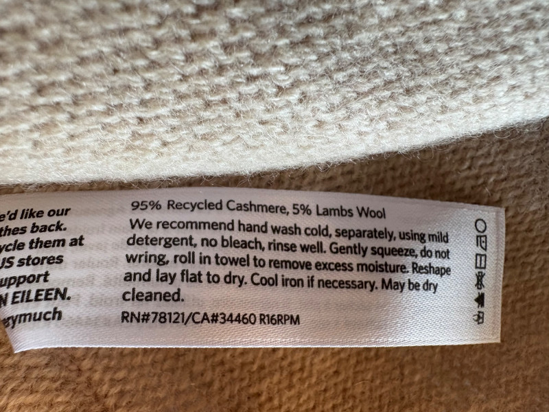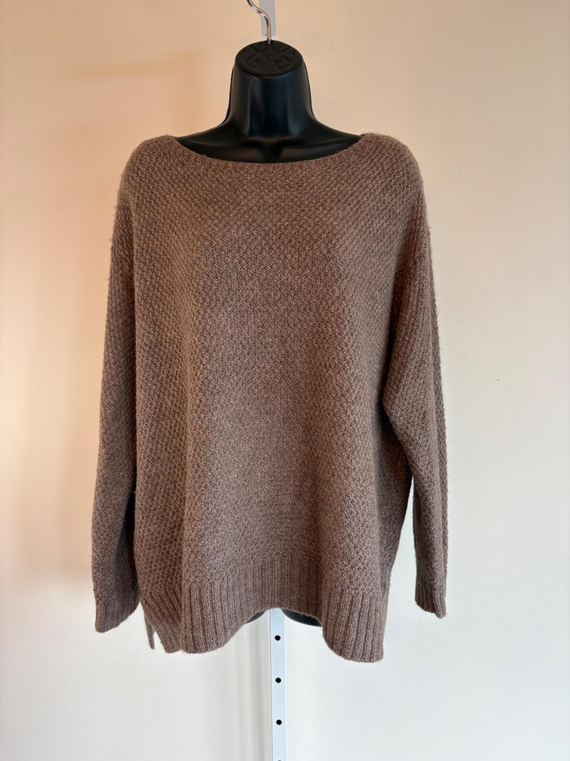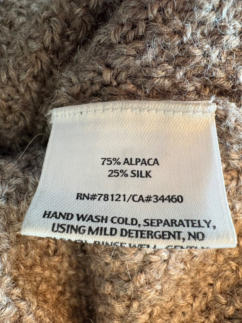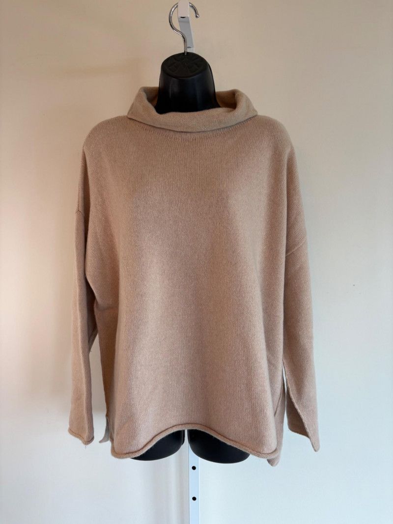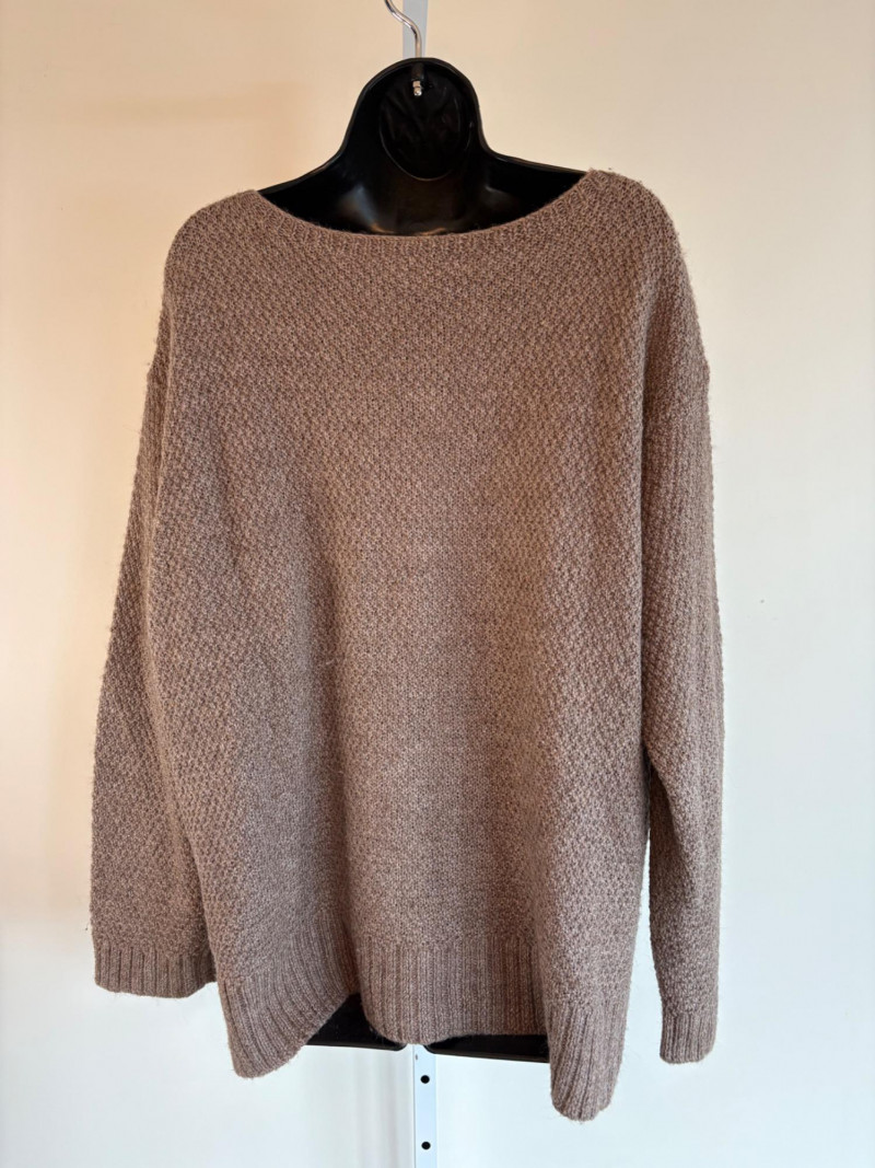 3 wonderfully soft sweaters - all in different styles in neutral tones from Eileen Fisher. All three sweaters measure 25.5" pit to pit. Beige turtleneck sweater has dropped shoulder seams, long sleeves, rolled hem on sleeves/cuffs/neckline, and a split hem with back approximately 2" longer than front. Recycled cashmere/lambs wool blend. Size tag says L. Burgundy/brown sweater has subtle horizontal rib weave, long sleeves, split hem, decorative side seams and curved neckline. 100% cashmere. Size tag says L. Brown textured sweater has round neckline, split hem, and ribbing at cuffs/bottom hem. Alpaca/silk blend. Size tag says XL. Note: sweater is in good condition but would be improved with a quick sweater shave. We also found one slight discoloration at neckline that should launder out. - see last photo.