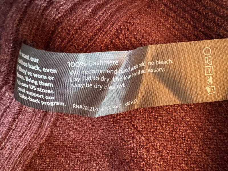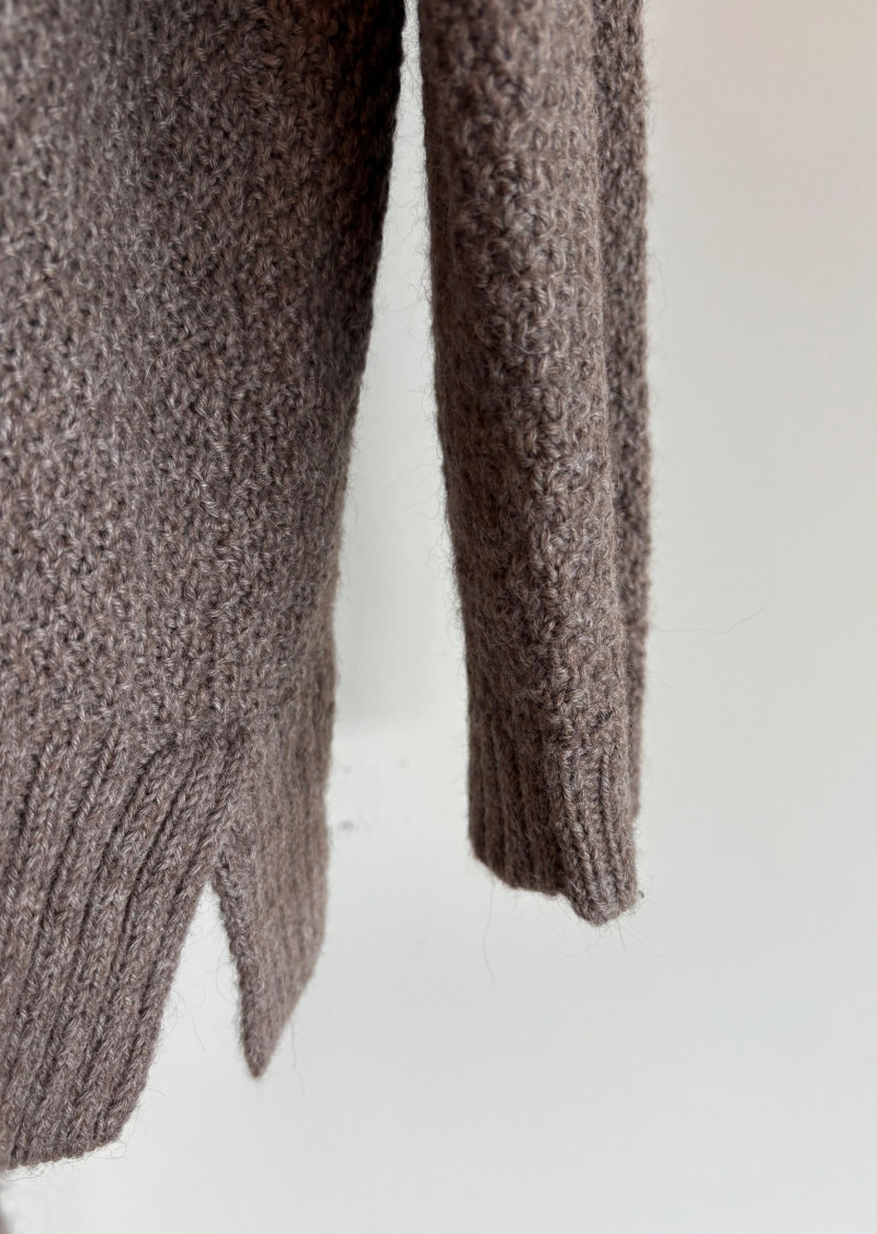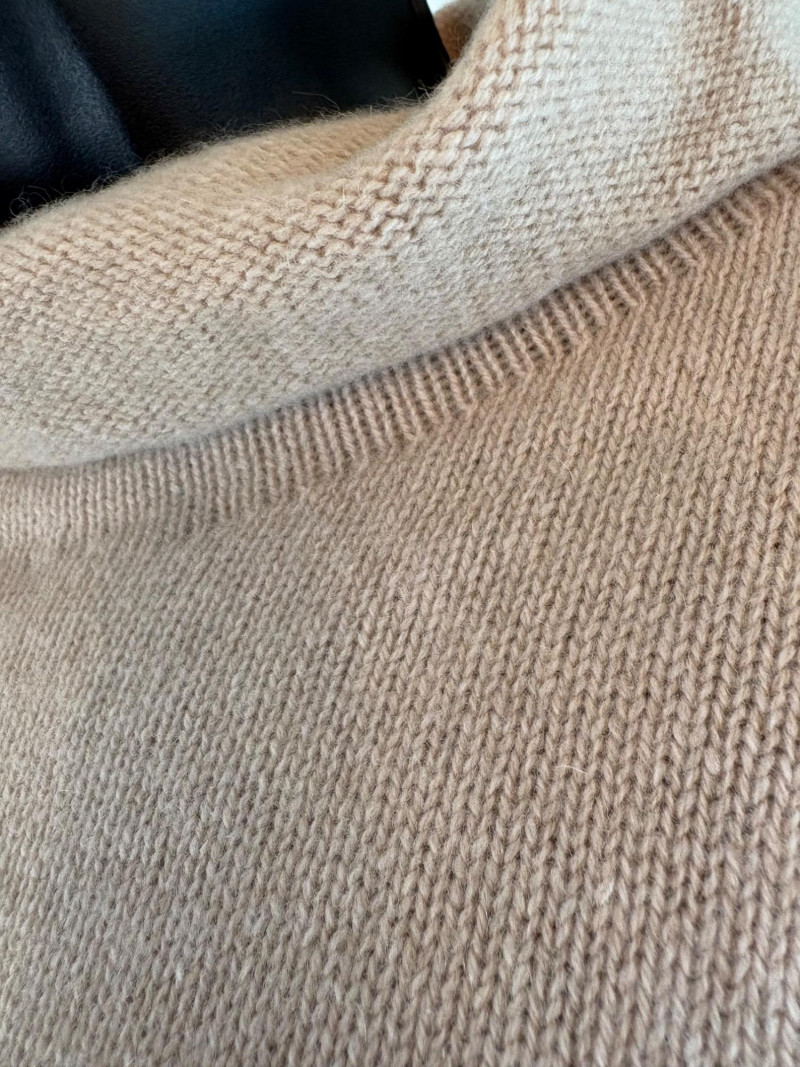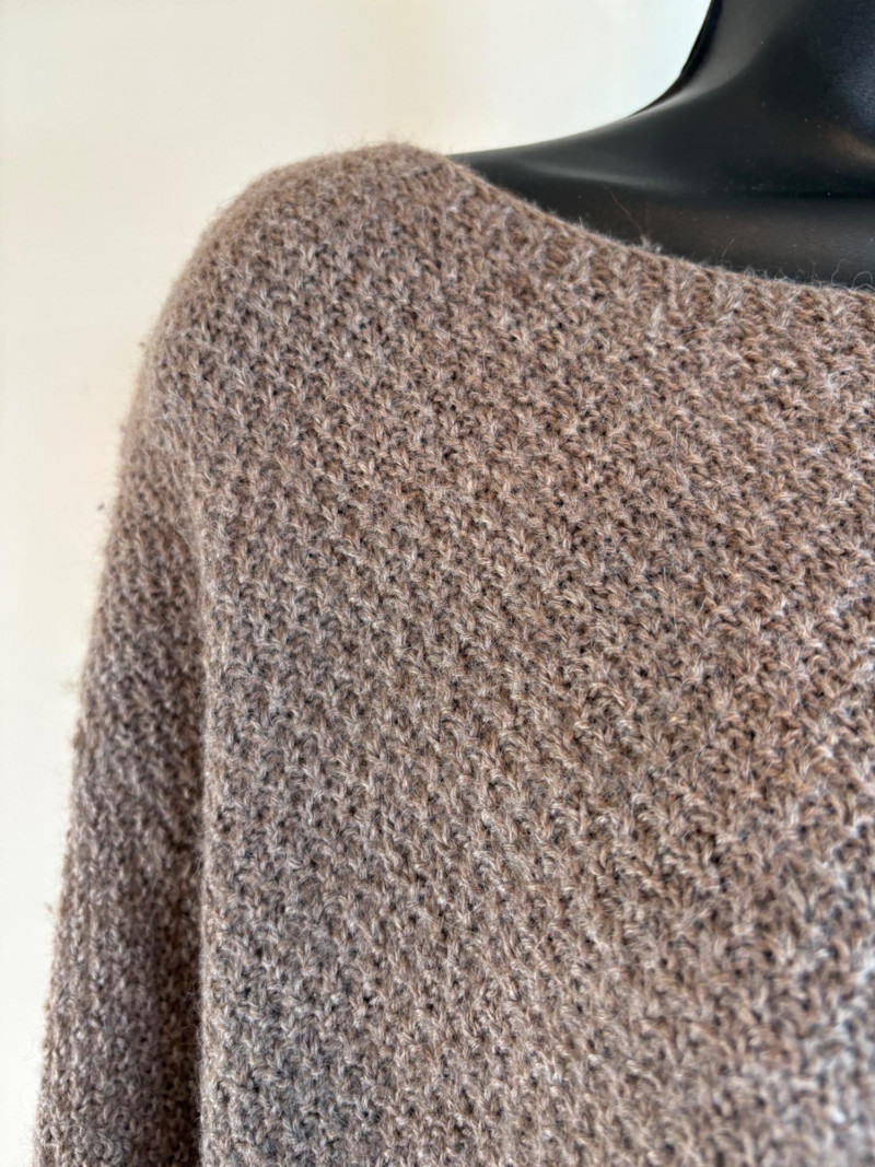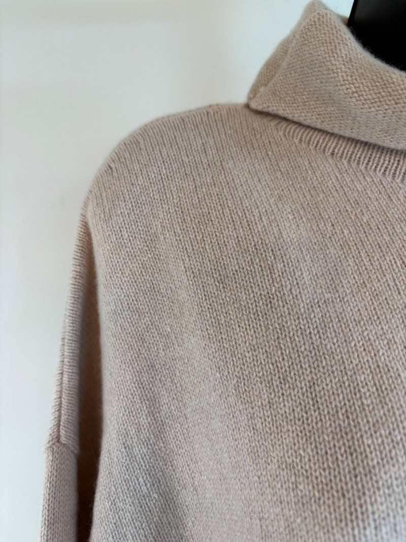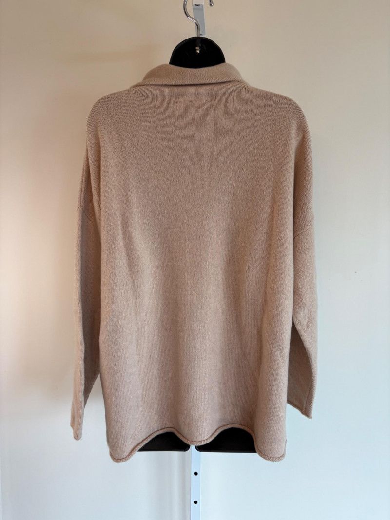 3 wonderfully soft sweaters - all in different styles in neutral tones from Eileen Fisher. All three sweaters measure 25.5" pit to pit. Beige turtleneck sweater has dropped shoulder seams, long sleeves, rolled hem on sleeves/cuffs/neckline, and a split hem with back approximately 2" longer than front. Recycled cashmere/lambs wool blend. Size tag says L. Burgundy/brown sweater has subtle horizontal rib weave, long sleeves, split hem, decorative side seams and curved neckline. 100% cashmere. Size tag says L. Brown textured sweater has round neckline, split hem, and ribbing at cuffs/bottom hem. Alpaca/silk blend. Size tag says XL. Note: sweater is in good condition but would be improved with a quick sweater shave. We also found one slight discoloration at neckline that should launder out. - see last photo.