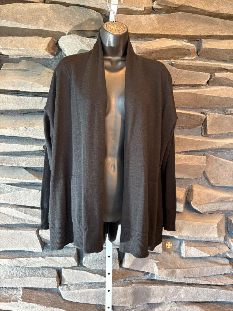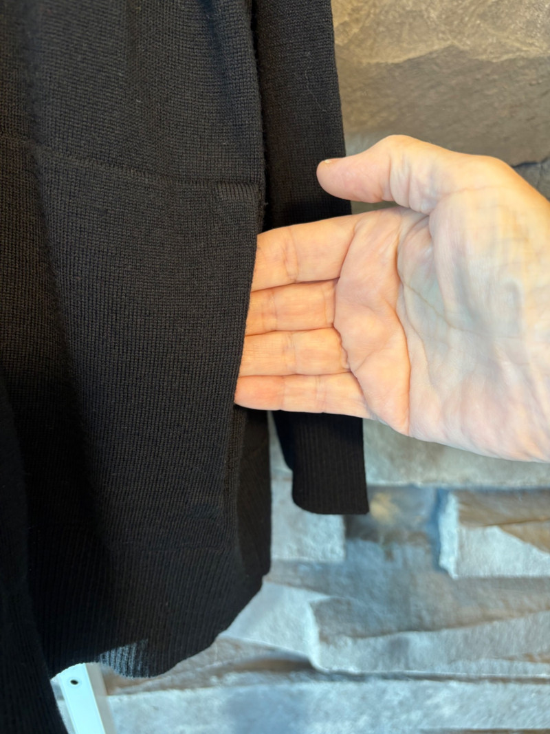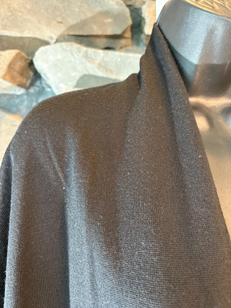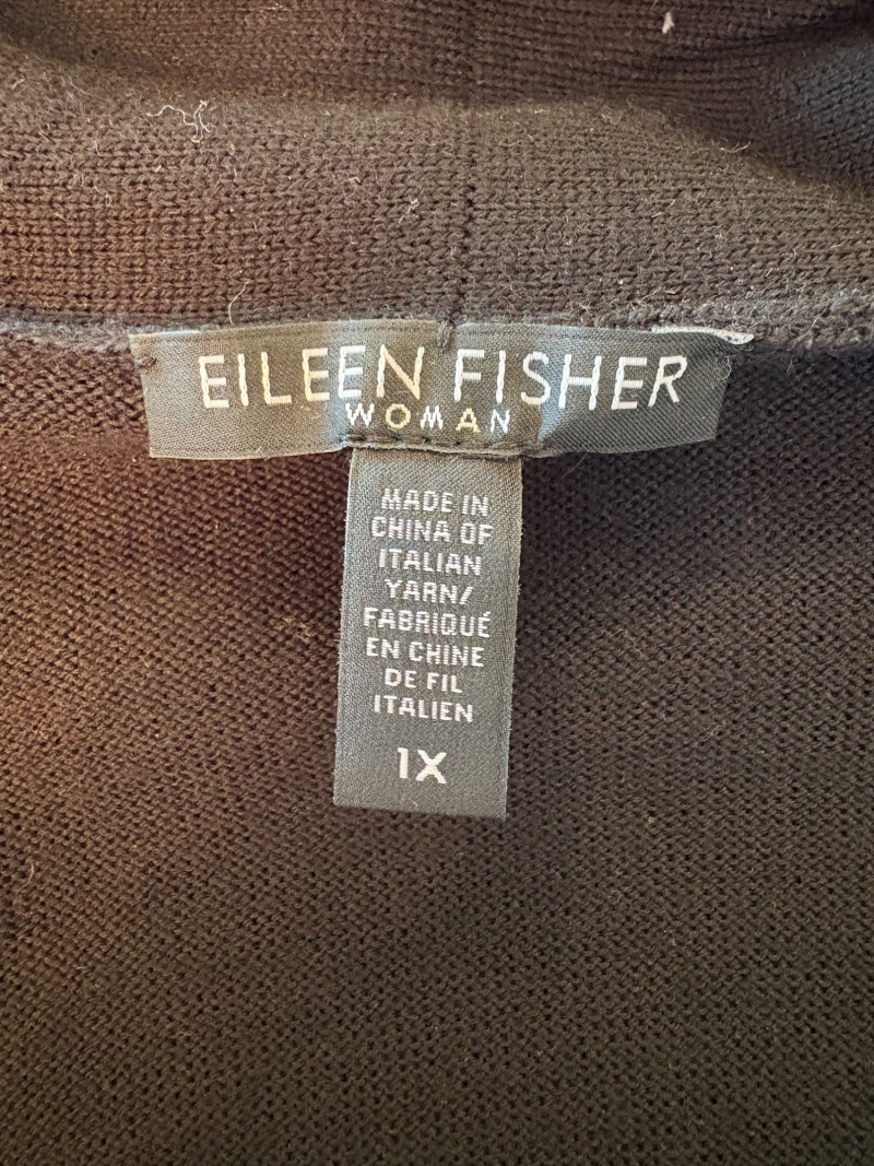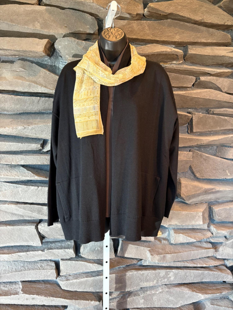 Easy to match pieces that can move from season to season from Eileen Fisher. Stretchy brown-grey silk turtleneck seems to change color depending upon what you pair it with. Has permanent gathering in neckline. 100% silk. Measures 22" pit to pit and 22" from back neckline to hem. Size tag says L. Black open front cardigan sweater has ribbing on sleeve ends and bottom hem with side-entry front patch pockets. 100% extra fine merino wool. Measures 24" pit to pit and 26" from back neckline to bottom hem. Size tag says 1X. Paired with vintage Vera scarf in black, yellow and taupe- brown. Measures approximately 14" x 42". No fabric tag but feels like silk. or a synthetic silk.