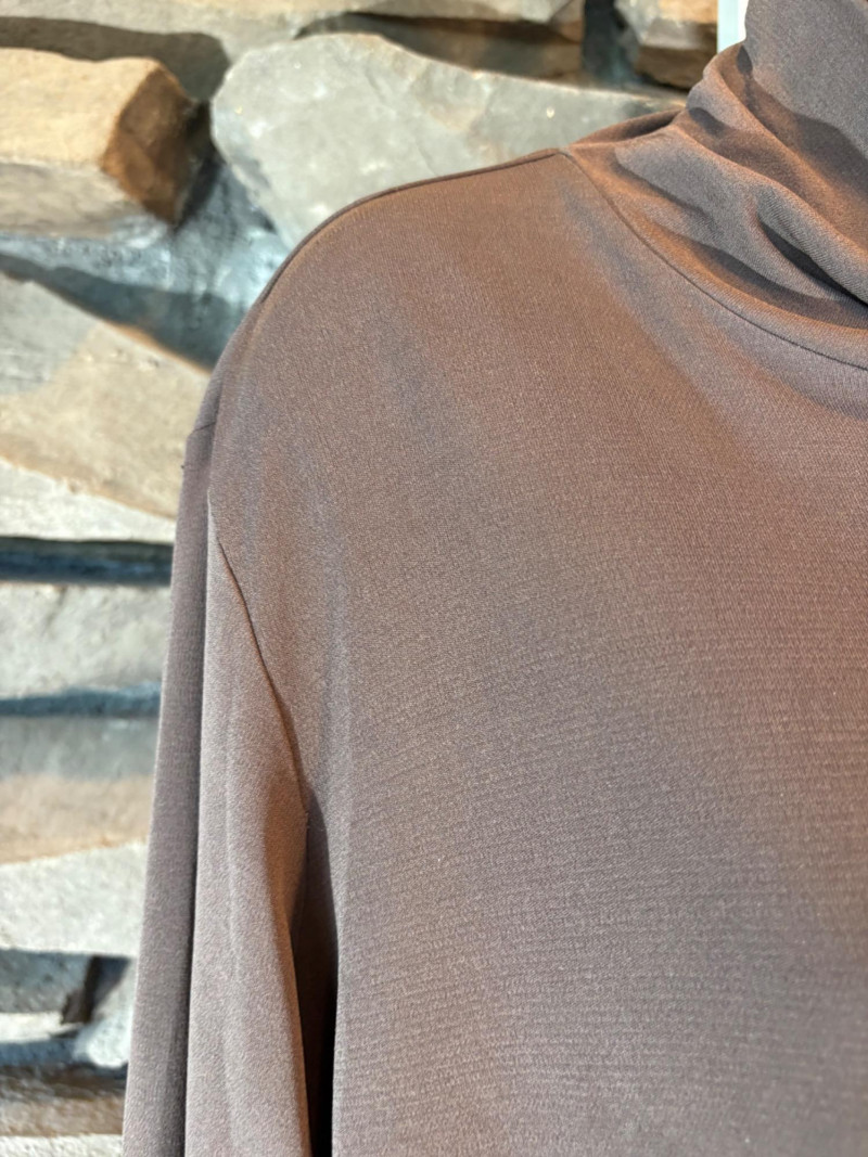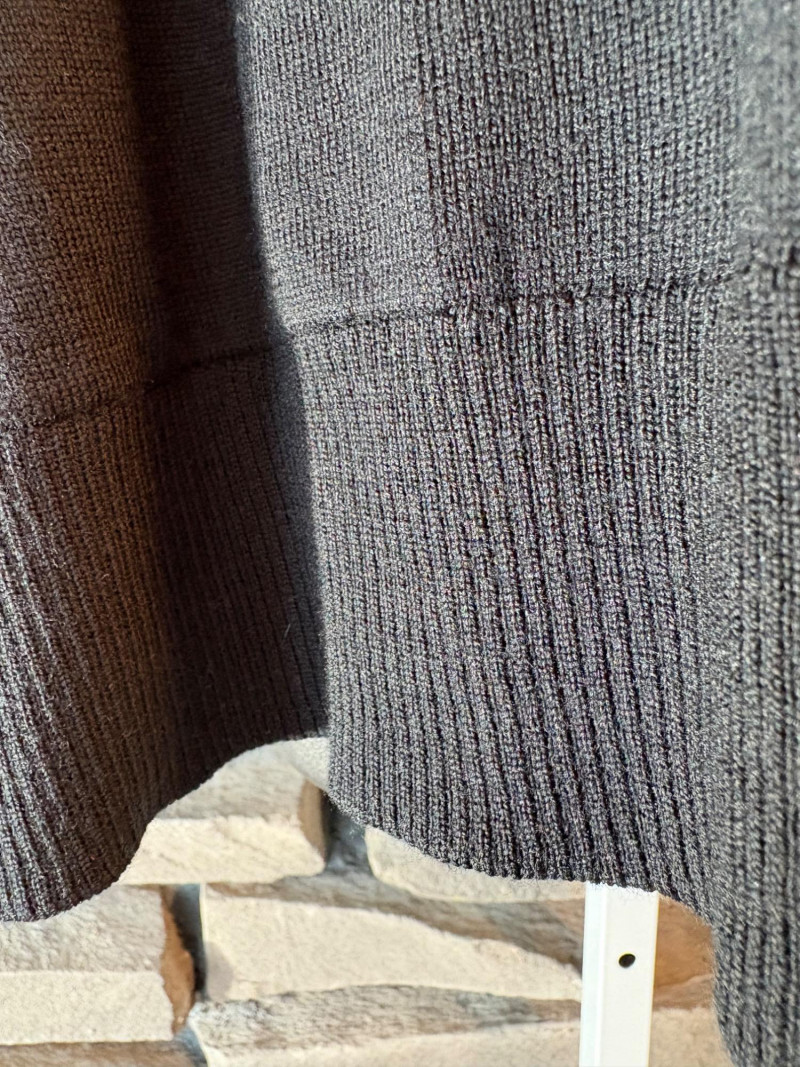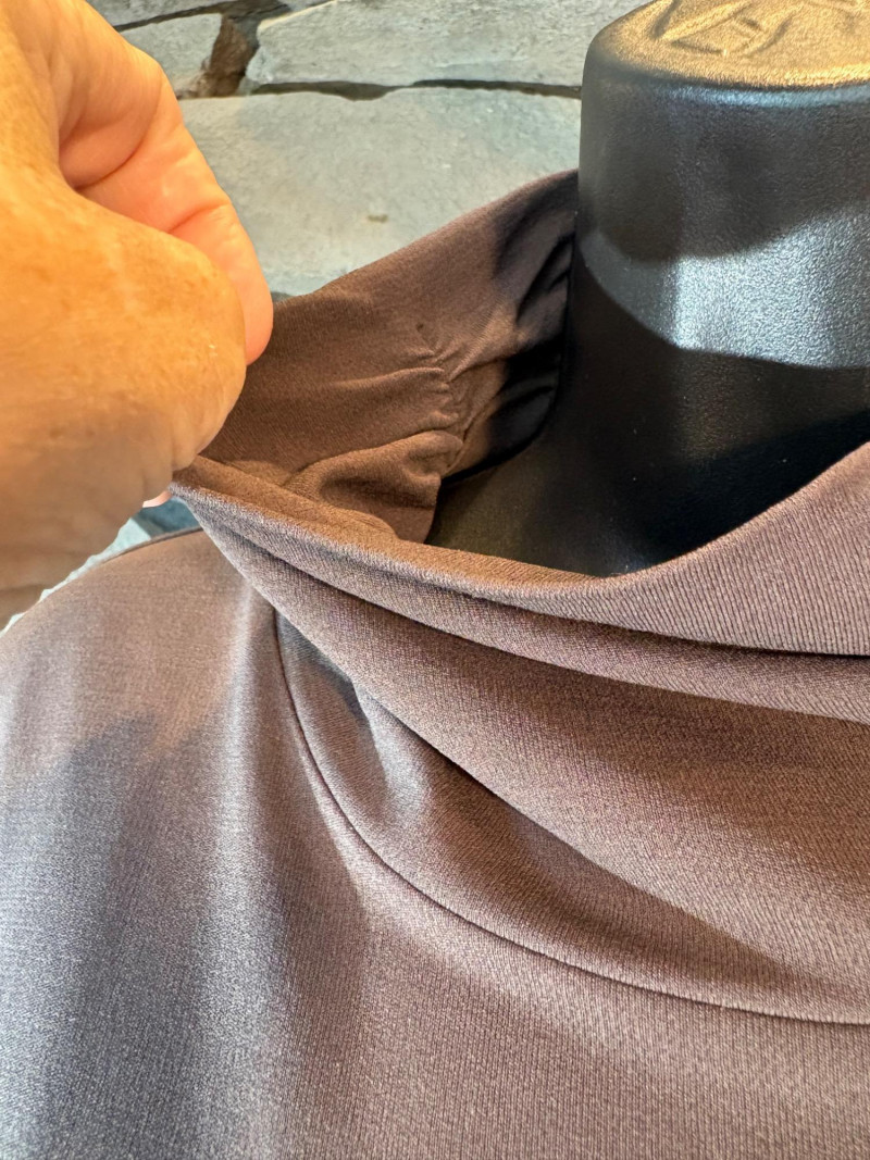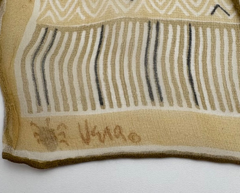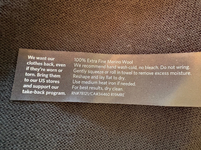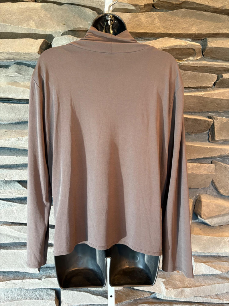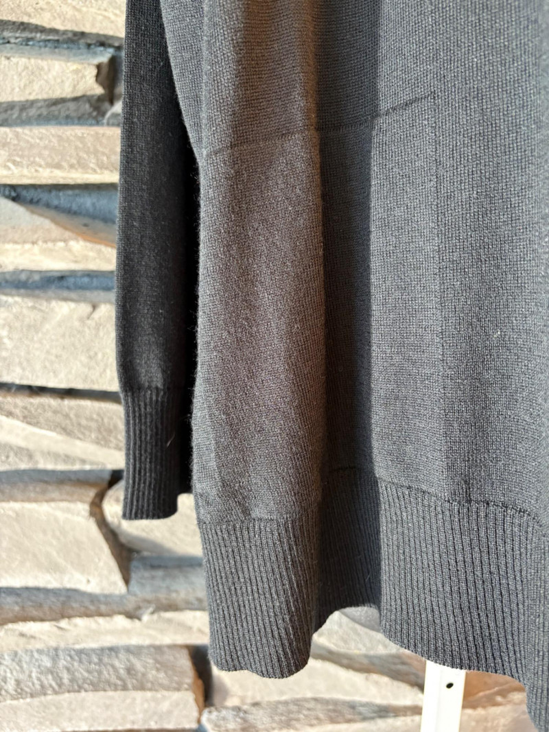Easy to match pieces that can move from season to season from Eileen Fisher. Stretchy brown-grey silk turtleneck seems to change color depending upon what you pair it with. Has permanent gathering in neckline. 100% silk. Measures 22" pit to pit and 22" from back neckline to hem. Size tag says L. Black open front cardigan sweater has ribbing on sleeve ends and bottom hem with side-entry front patch pockets. 100% extra fine merino wool. Measures 24" pit to pit and 26" from back neckline to bottom hem. Size tag says 1X. Paired with vintage Vera scarf in black, yellow and taupe- brown. Measures approximately 14" x 42". No fabric tag but feels like silk. or a synthetic silk.