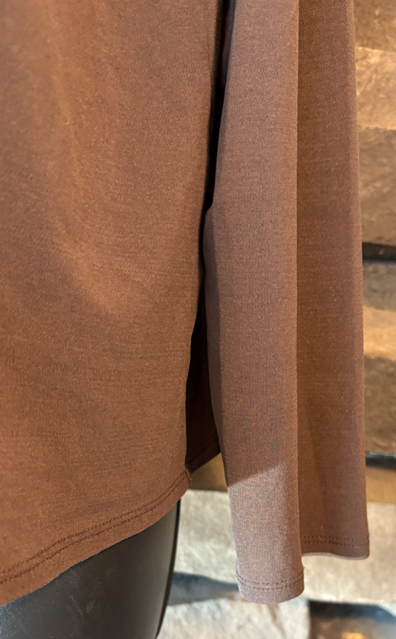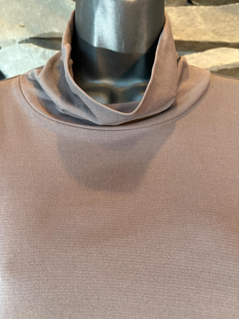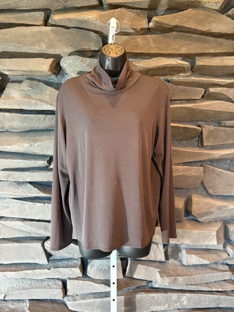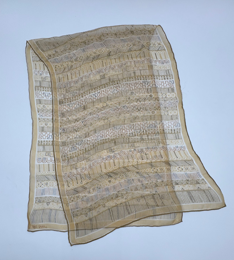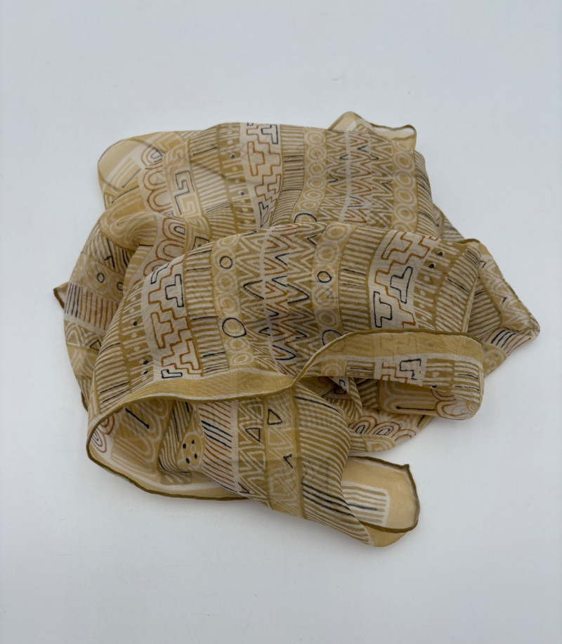 Easy to match pieces that can move from season to season from Eileen Fisher. Stretchy brown-grey silk turtleneck seems to change color depending upon what you pair it with. Has permanent gathering in neckline. 100% silk. Measures 22" pit to pit and 22" from back neckline to hem. Size tag says L. Black open front cardigan sweater has ribbing on sleeve ends and bottom hem with side-entry front patch pockets. 100% extra fine merino wool. Measures 24" pit to pit and 26" from back neckline to bottom hem. Size tag says 1X. Paired with vintage Vera scarf in black, yellow and taupe- brown. Measures approximately 14" x 42". No fabric tag but feels like silk. or a synthetic silk.