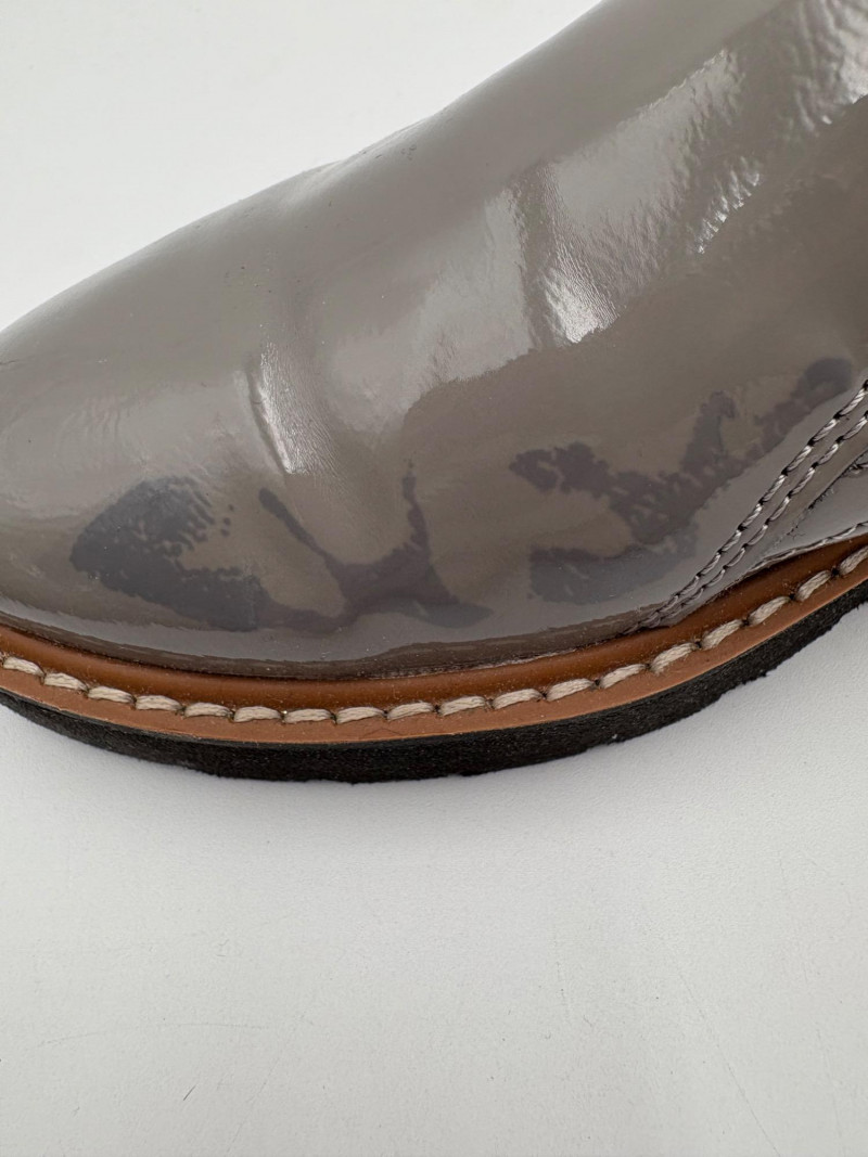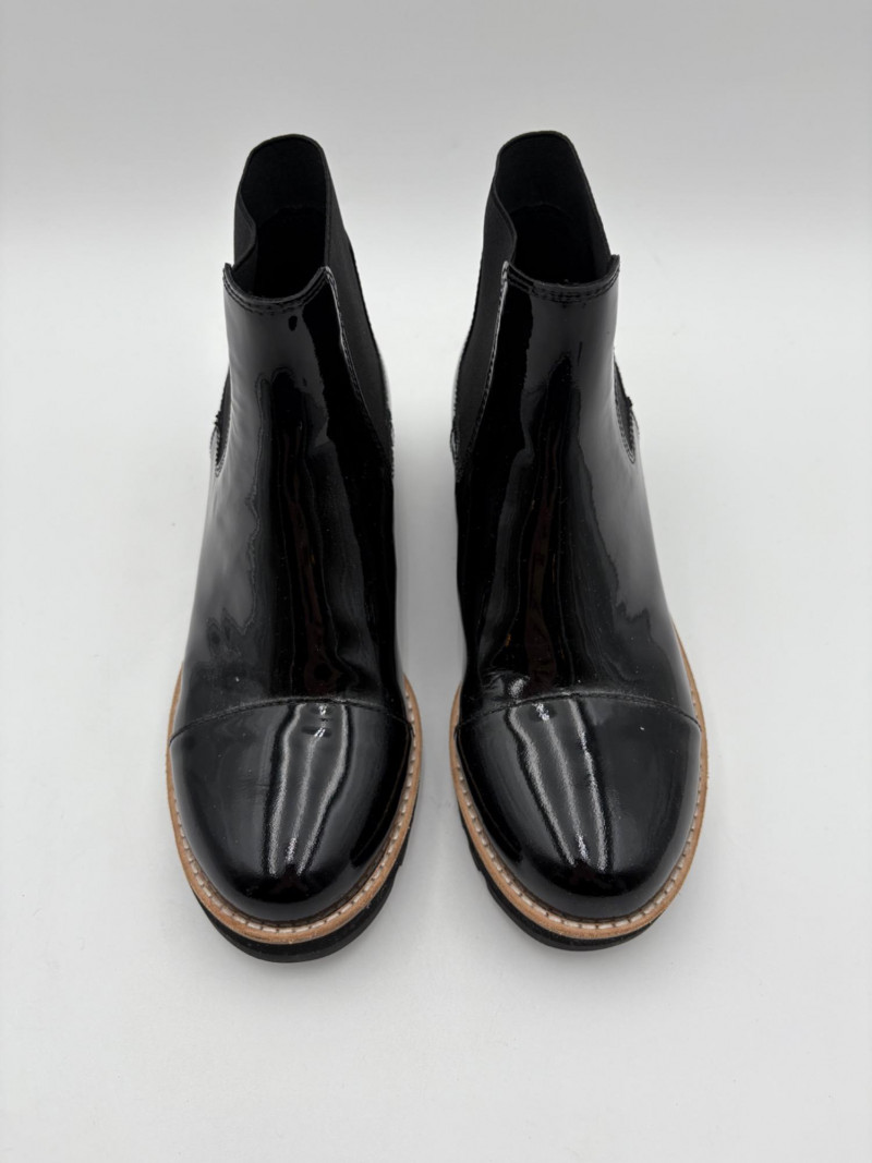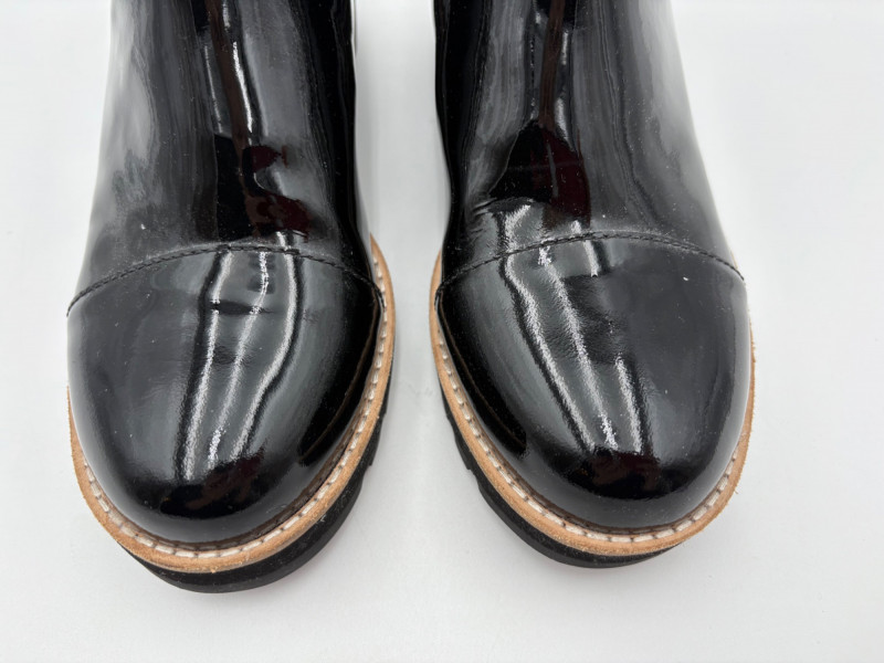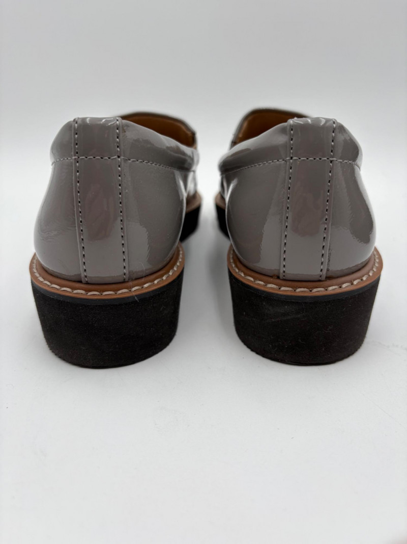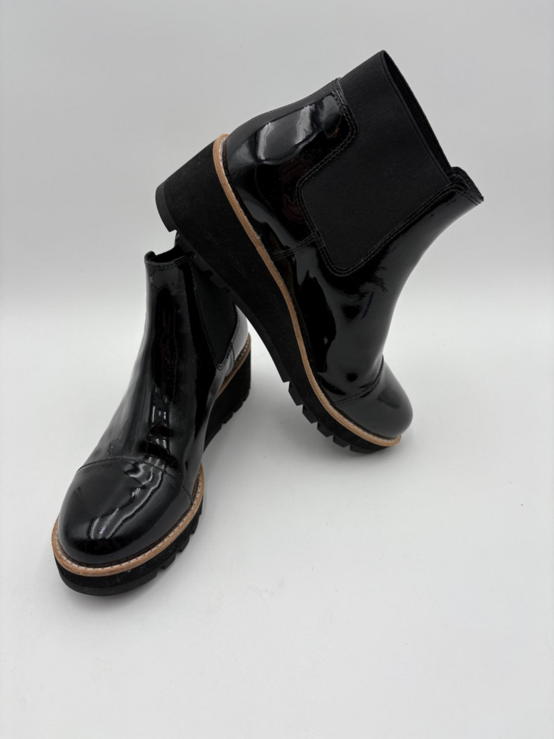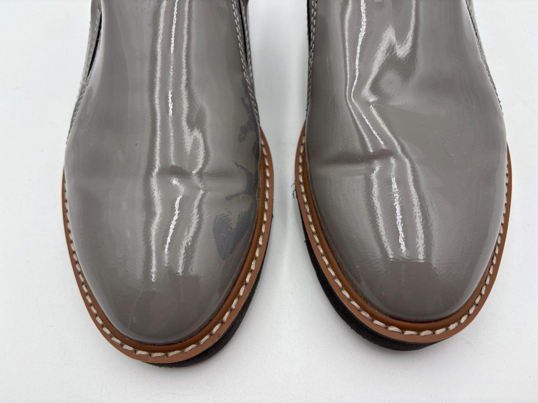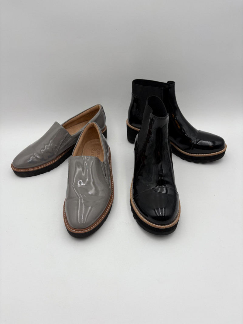 Naturalizer grey patent slip-ons have elastic gussets on uppers and a black wedge heel & sole. Size 7.5, Note that there are some dark areas on the right front shoe - not terrible with all the gloss going on, but also not unnoticeable - see last photo. Eileen Fisher black patent ankle boots have elastic section on uppers with a black wedge heel & sole. Appear to be new. Size 7.5.