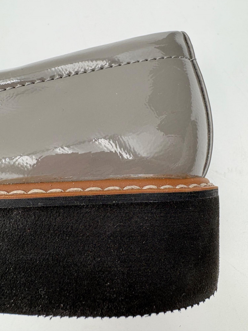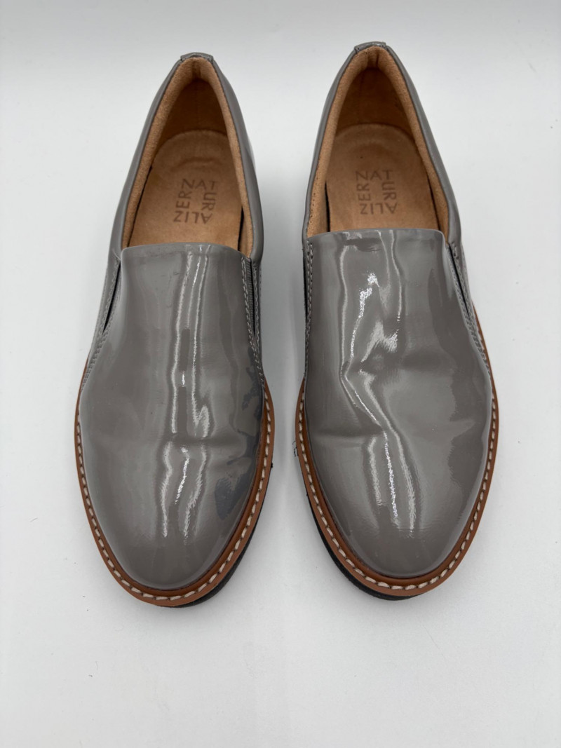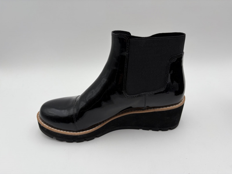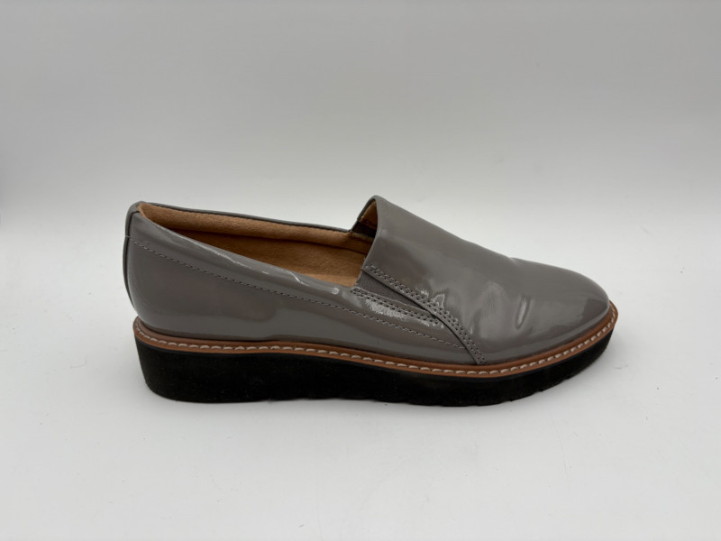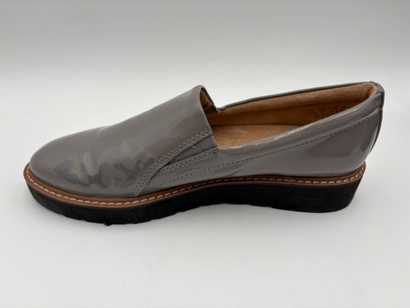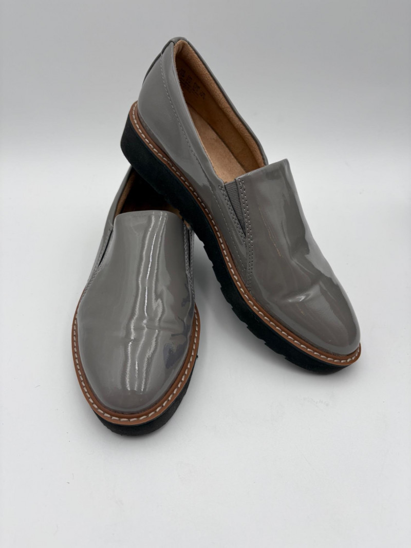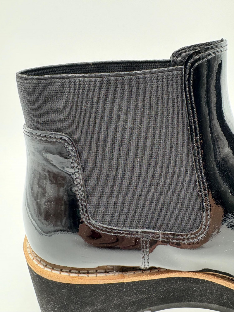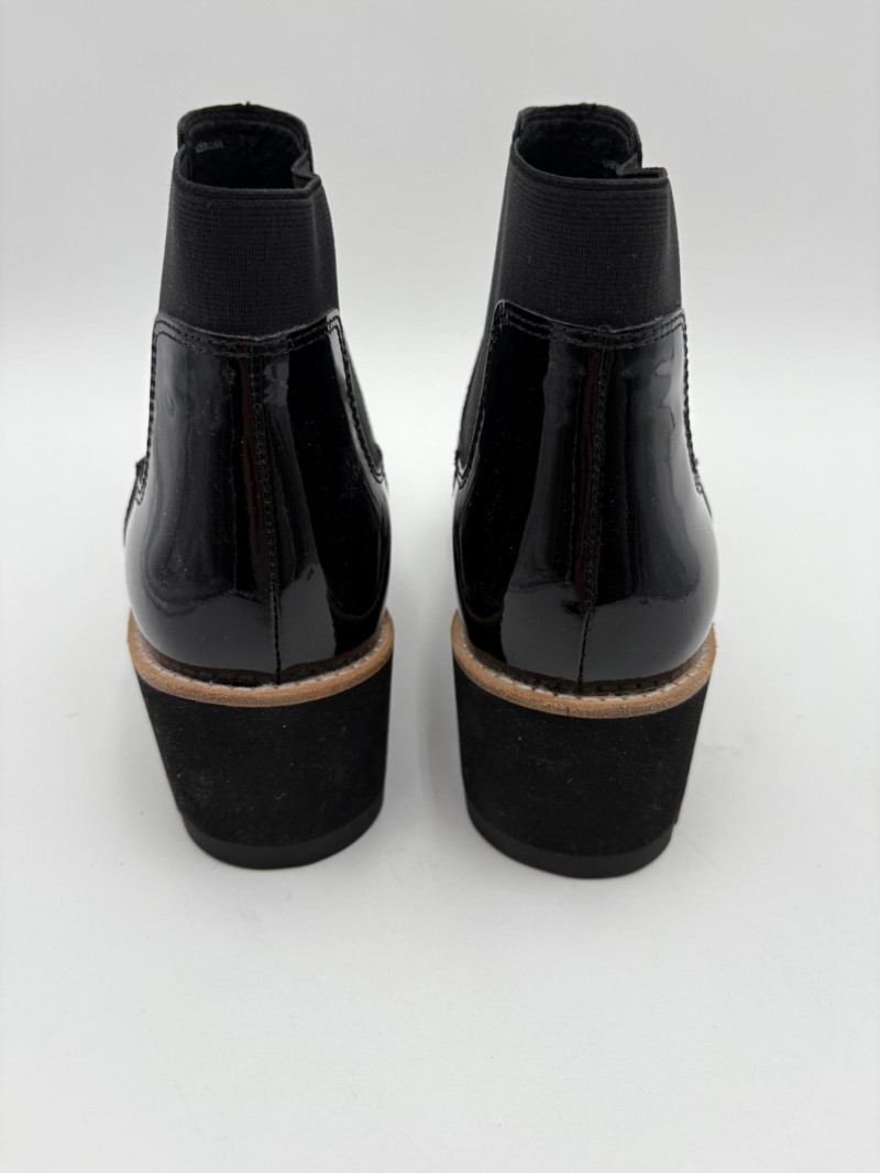 Naturalizer grey patent slip-ons have elastic gussets on uppers and a black wedge heel & sole. Size 7.5, Note that there are some dark areas on the right front shoe - not terrible with all the gloss going on, but also not unnoticeable - see last photo. Eileen Fisher black patent ankle boots have elastic section on uppers with a black wedge heel & sole. Appear to be new. Size 7.5.