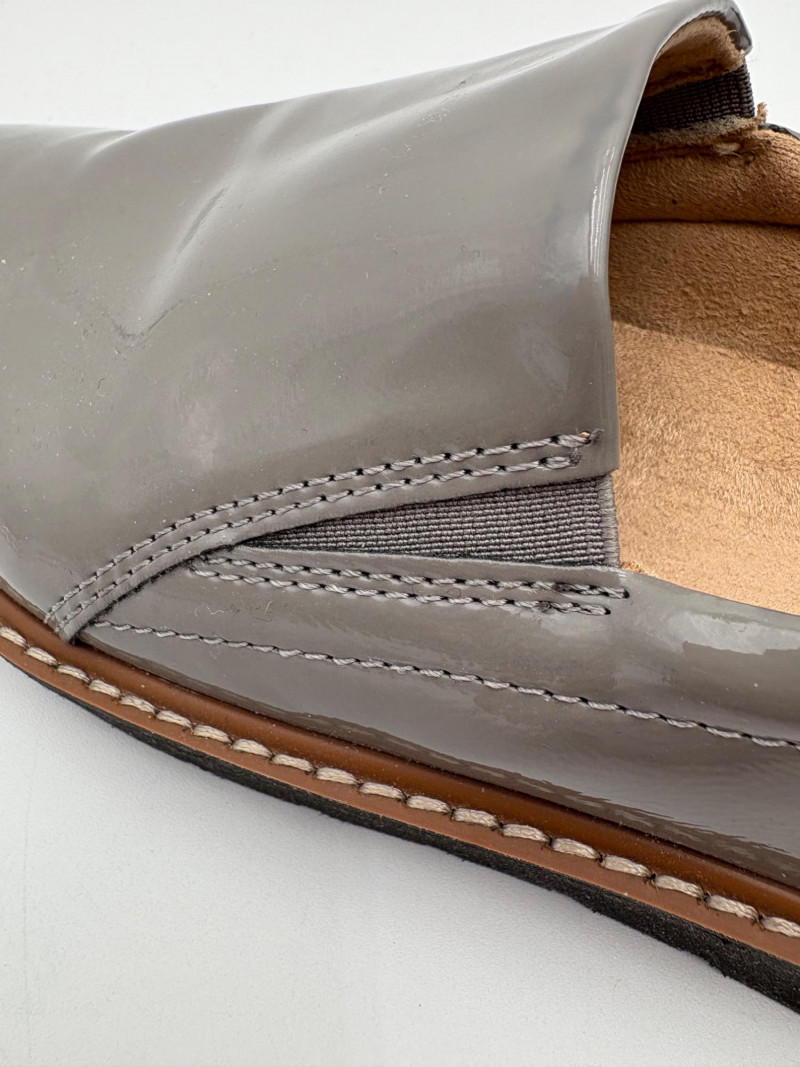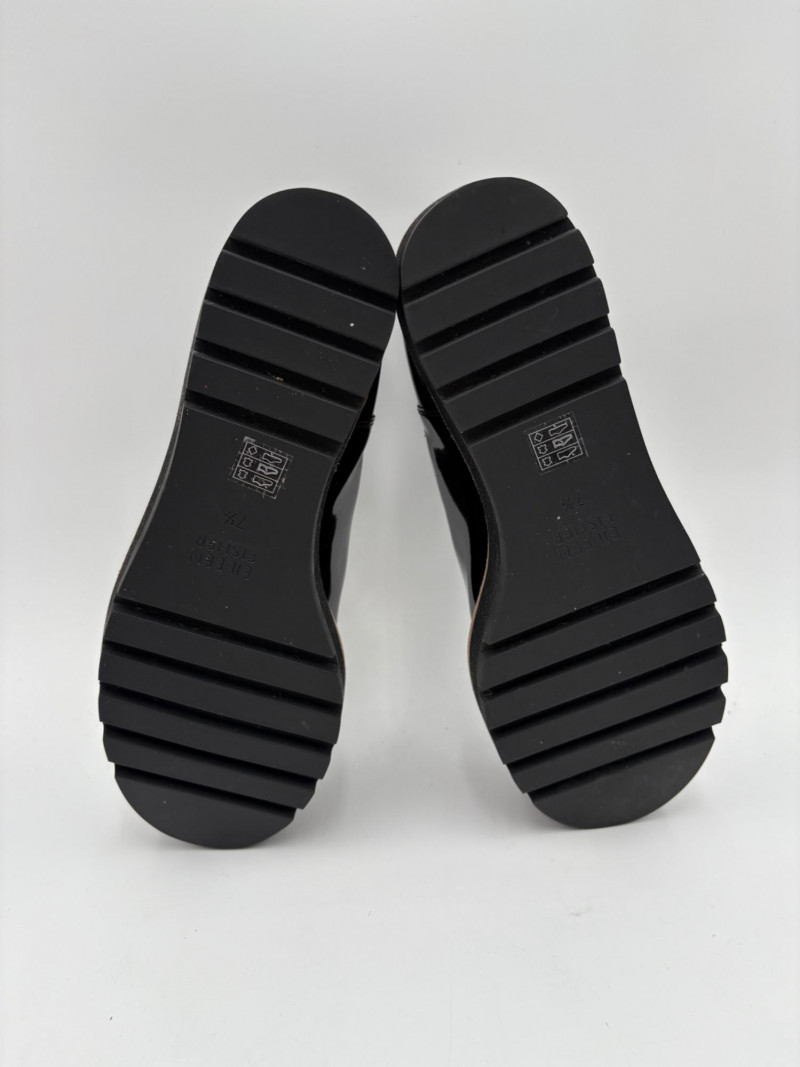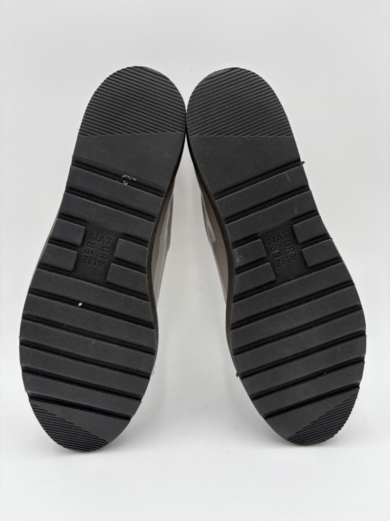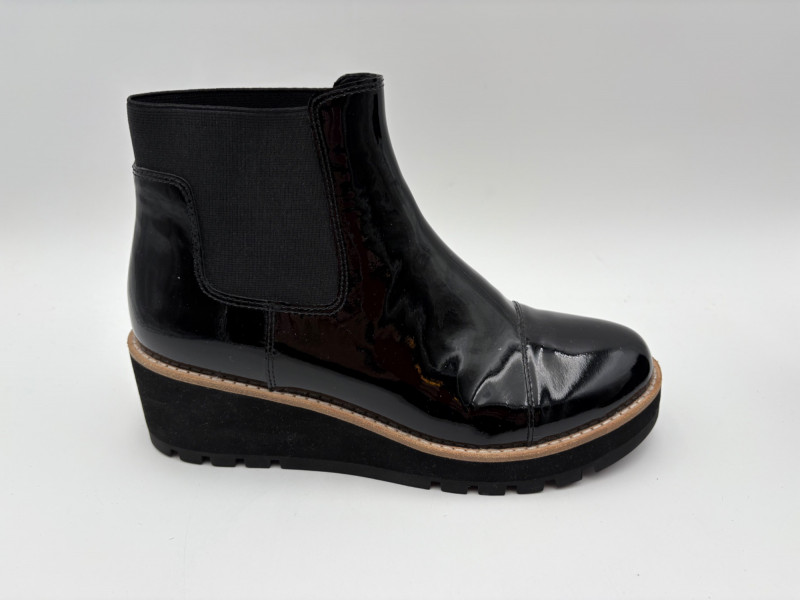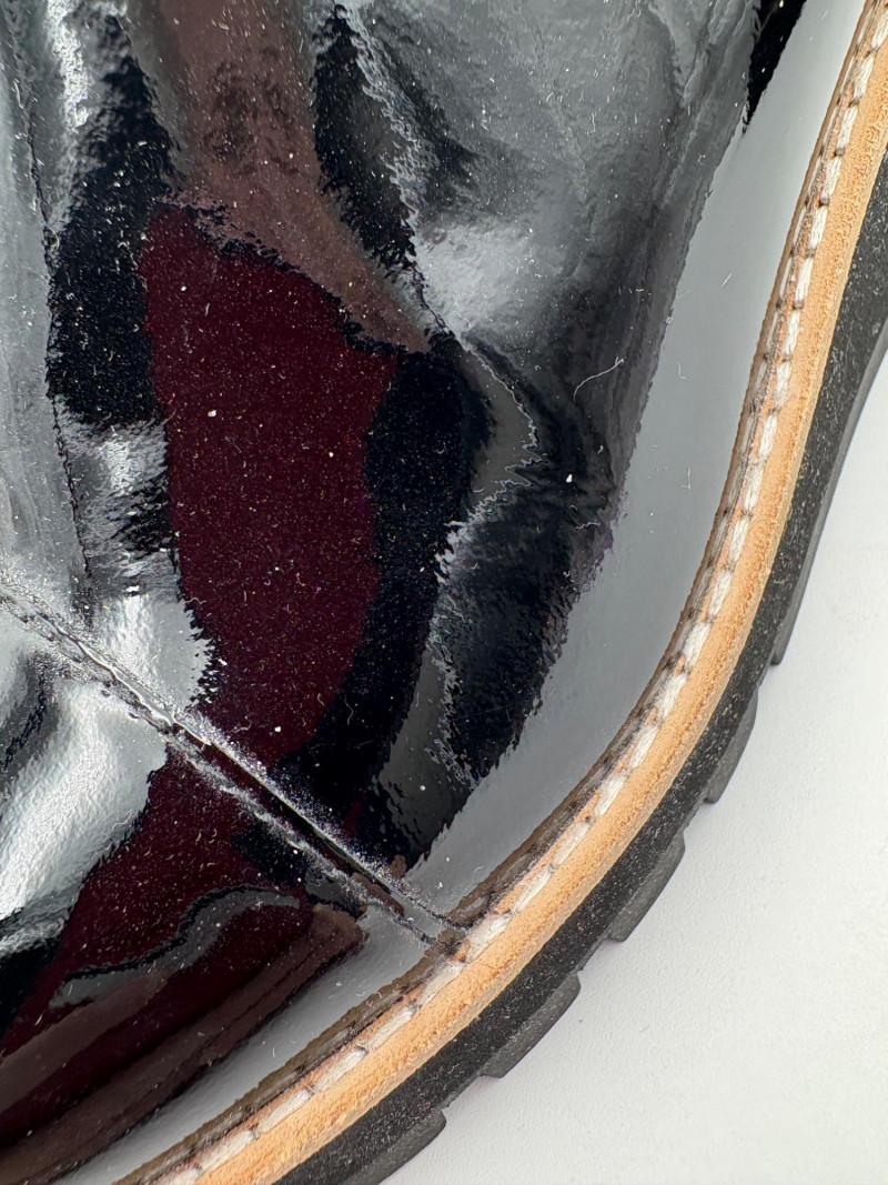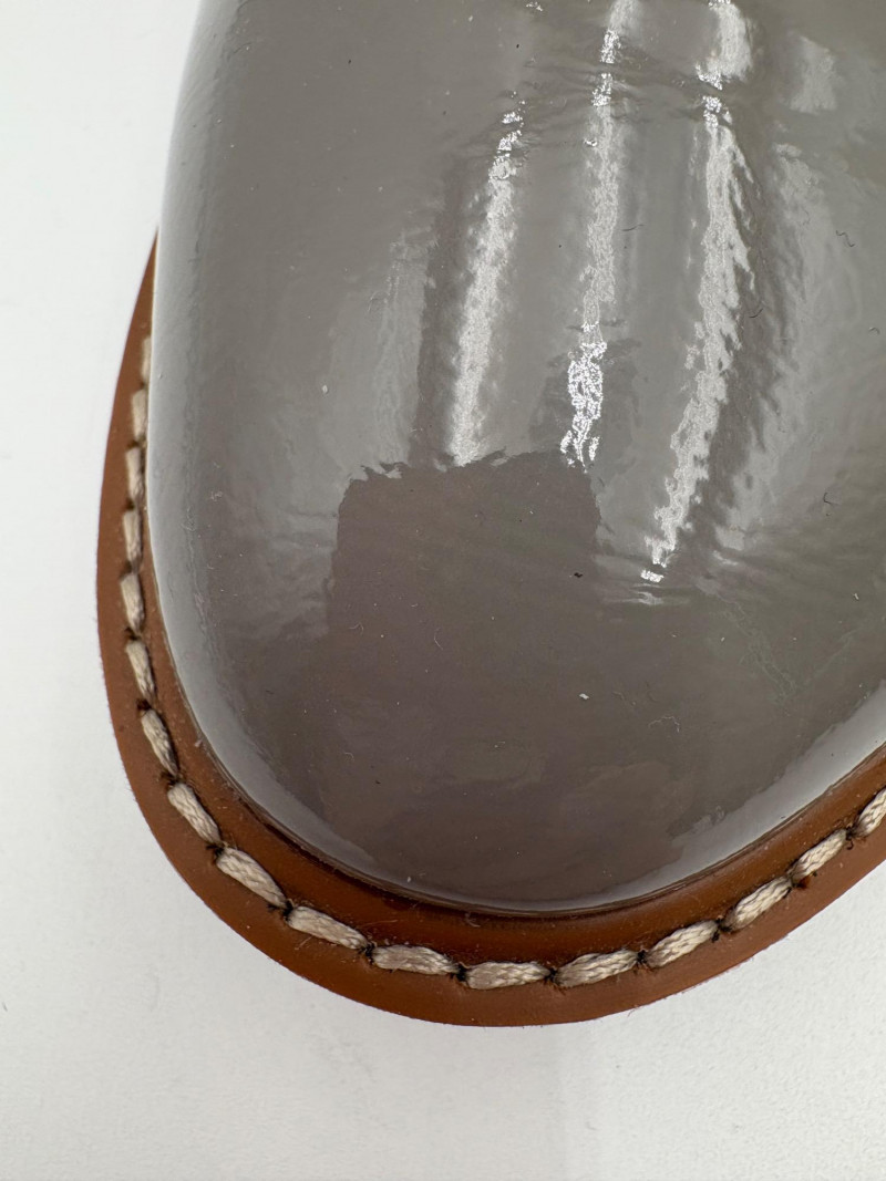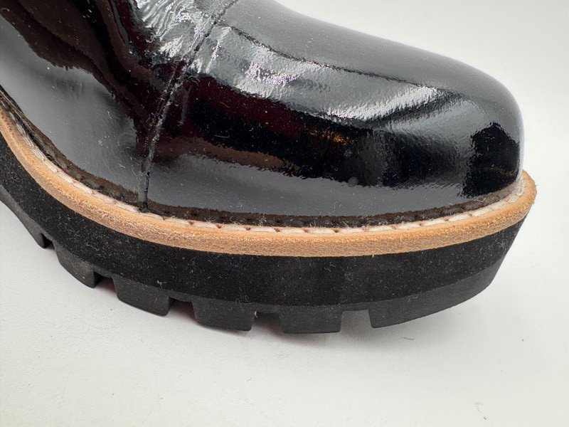 Naturalizer grey patent slip-ons have elastic gussets on uppers and a black wedge heel & sole. Size 7.5, Note that there are some dark areas on the right front shoe - not terrible with all the gloss going on, but also not unnoticeable - see last photo. Eileen Fisher black patent ankle boots have elastic section on uppers with a black wedge heel & sole. Appear to be new. Size 7.5.