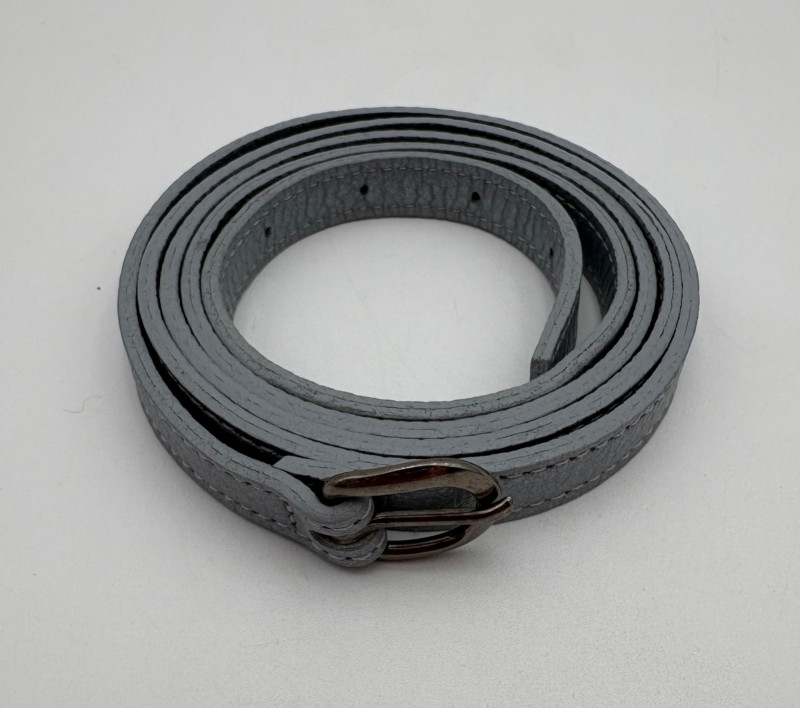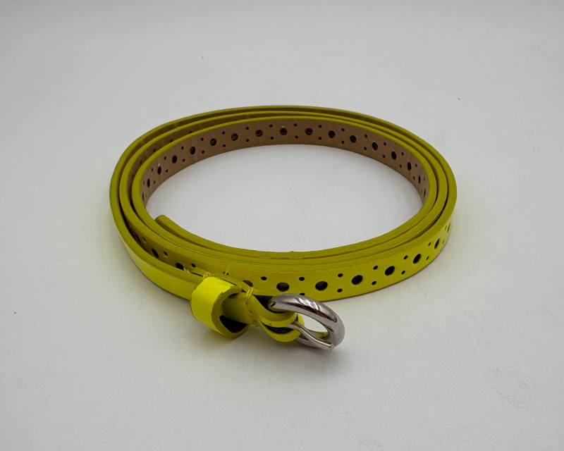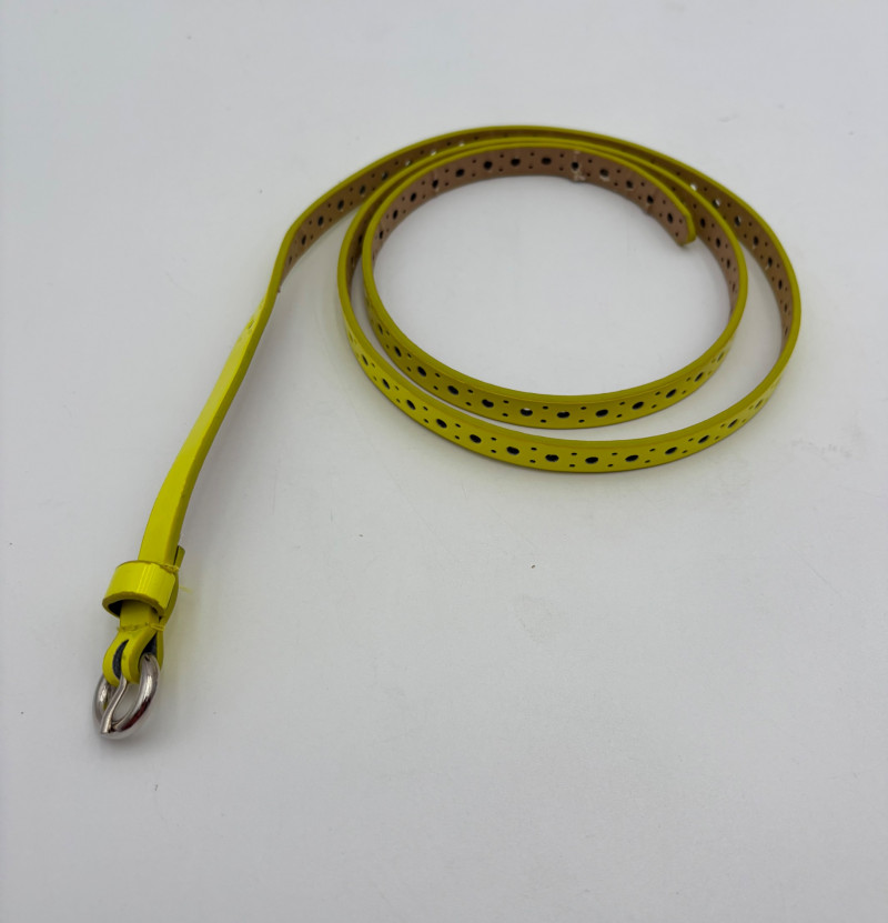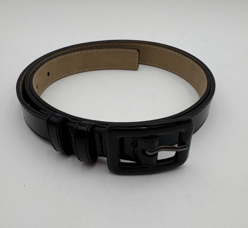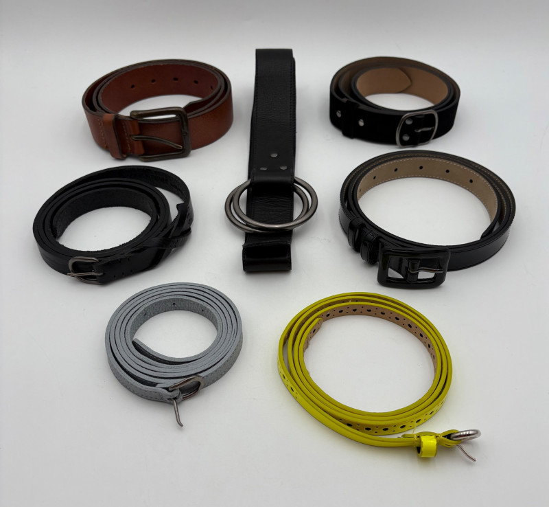 7 basic style & color belts - you shouldn't have to shop for new ones for a LONG time! - 1/2" grey belt from Eileen Fisher. Measures 35" smallest hole to 48" largest hole. - 1/2" yellow belt - maker unknown. Can go up to 44" because of multiple holes along full length of belt. - 3/4" black belt from Eileen Fisher. Measures 38.5" smallest hole to 43.5" largest hole. - 7/8" black patent belt from Halogen. Measures 38" smallest hole to 43" largest hole. - 1 1/4" black suede belt from Eileen Fisher. Measures 43" smallest hole to 47" largest hole. - 1 3/8" brown belt from GAP. Measures 38" smallest hole to 42" largest hole. - 1 1/2" black belt from Eileen Fisher. Flexible size as it is cinch style with double loop buckle.