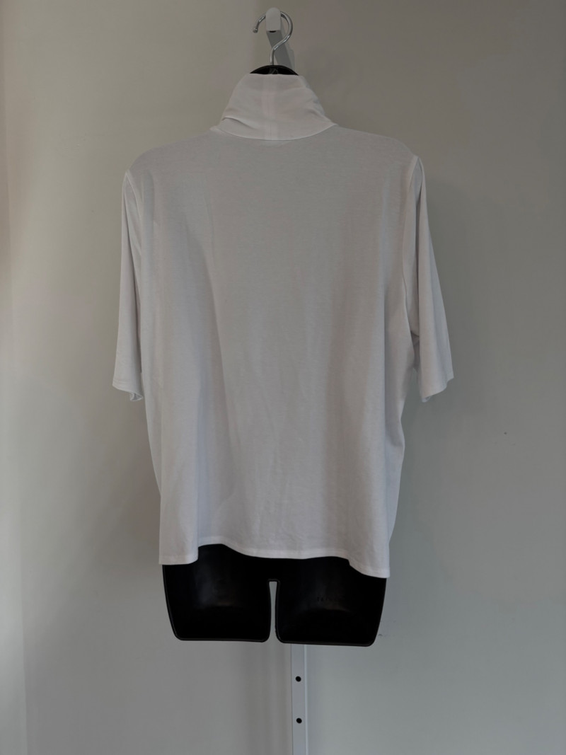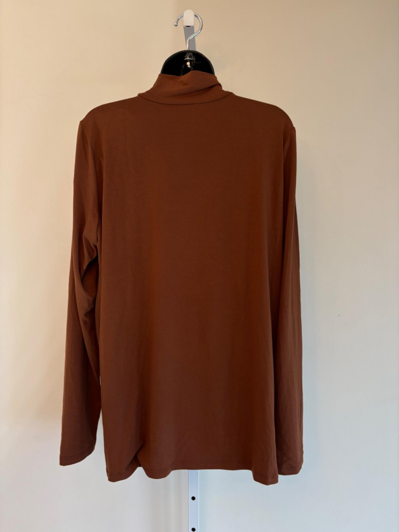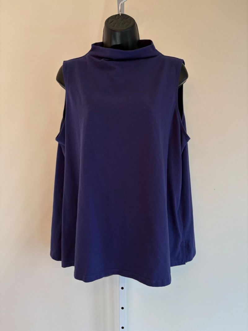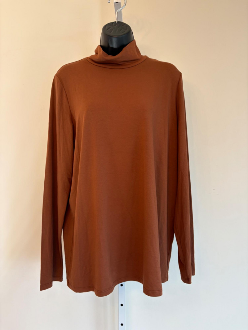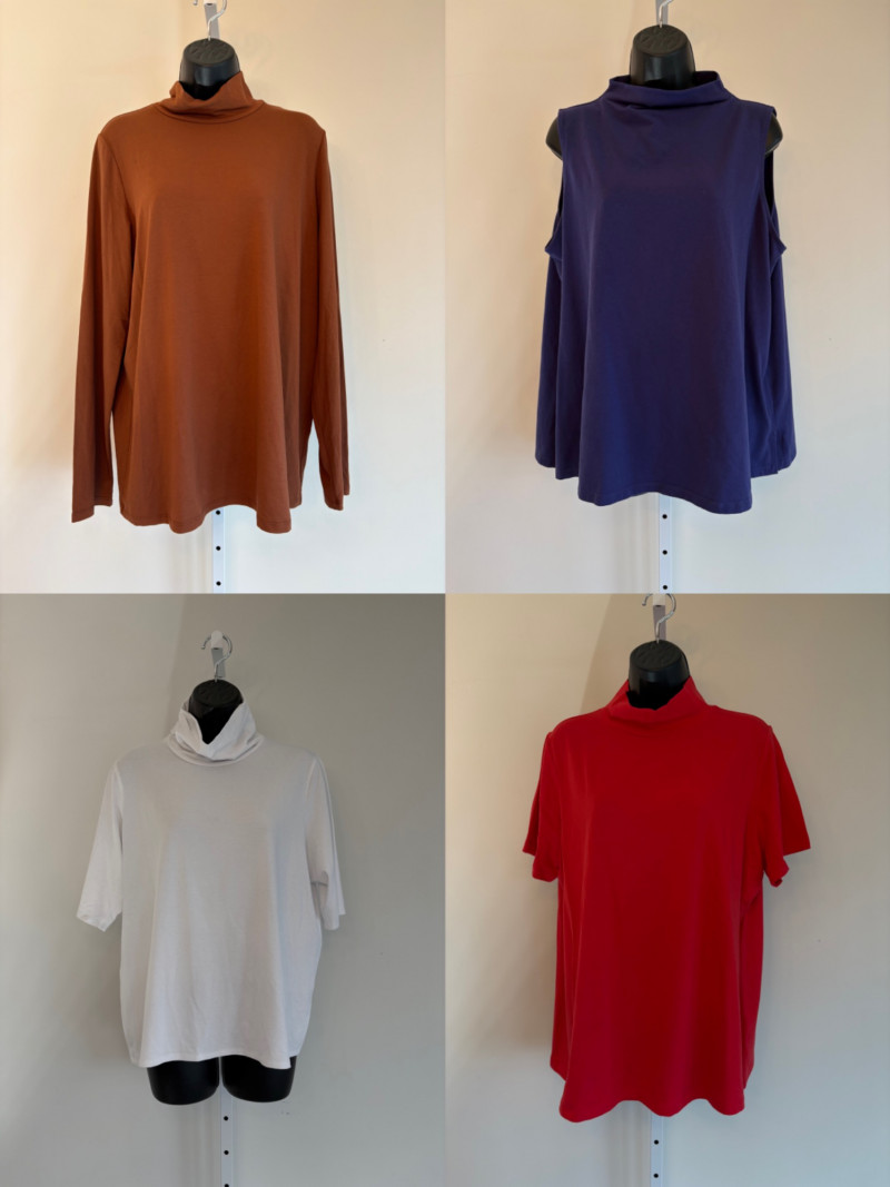 Group of 4 versatile turtlenecks/almost turtlenecks from Mizrahi & Eileen Fisher. All measure between 22" - 23" pit to pit in soft stretchy knit. Brown mock turtleneck from Eileen Fisher has long sleeves. Viscose/spandex blend. Size tag says XL. Purple/blue funnel neck from Eileen Fisher is sleeveless with a split hem. Organic cotton/elastane blend. Size tag says1X. White turtleneck from Eileen Fisher has short sleeves & elasticated neck sides to hold gathering . Viscose/spandex blend. Size tag says XL.