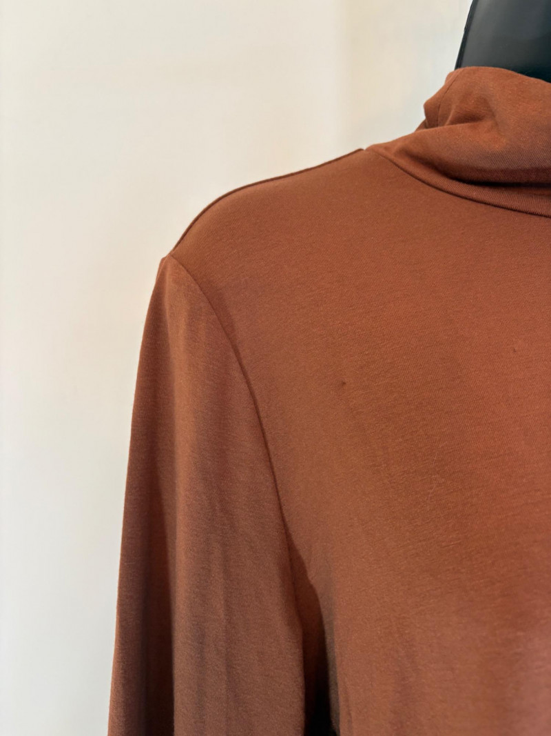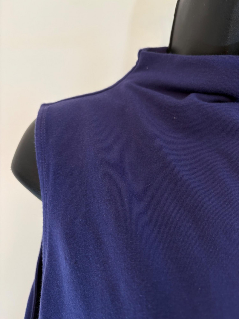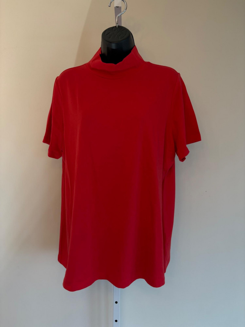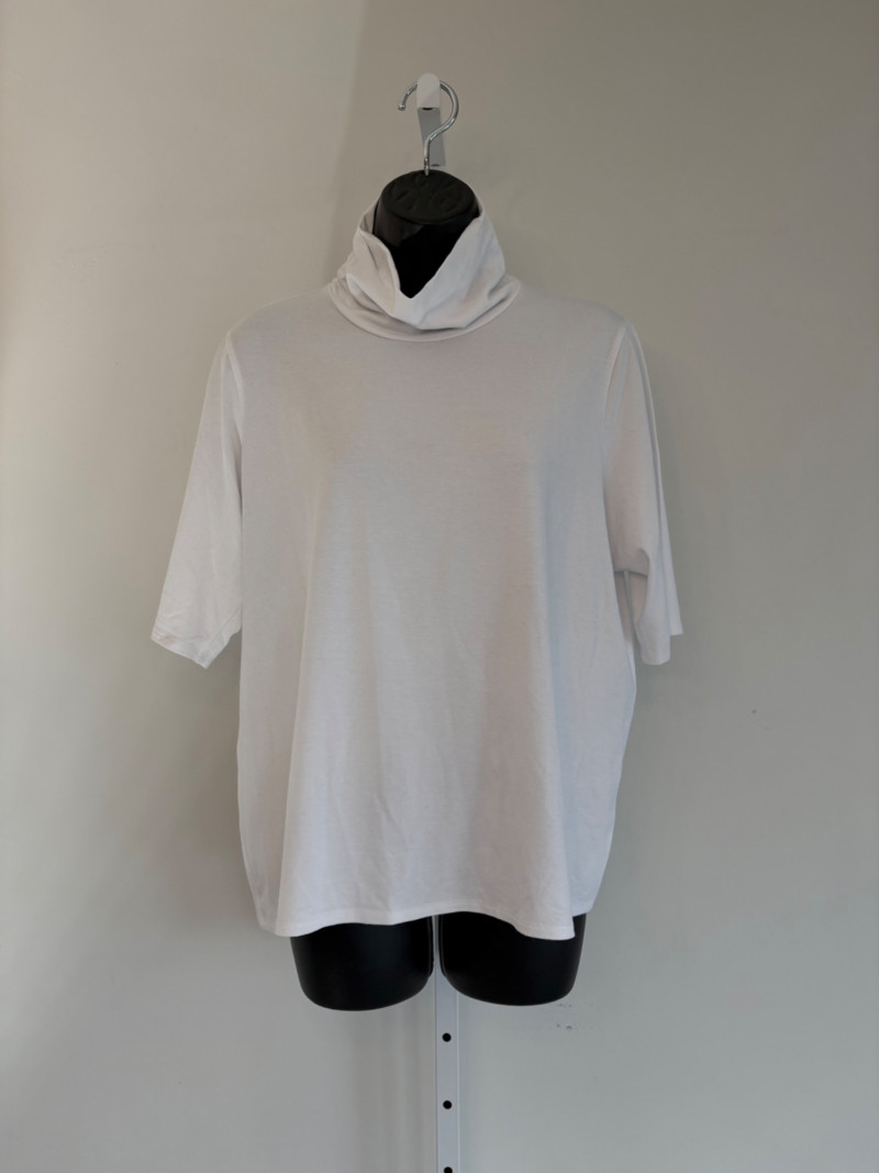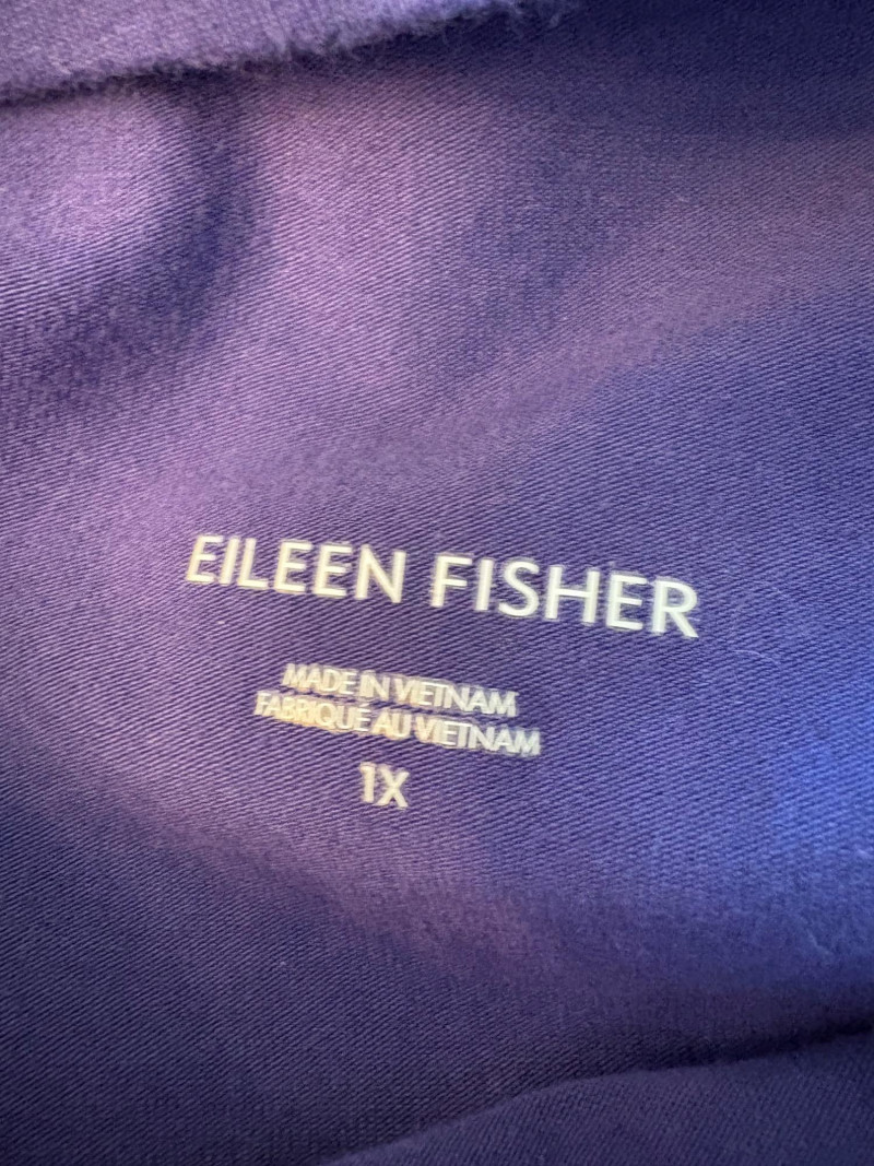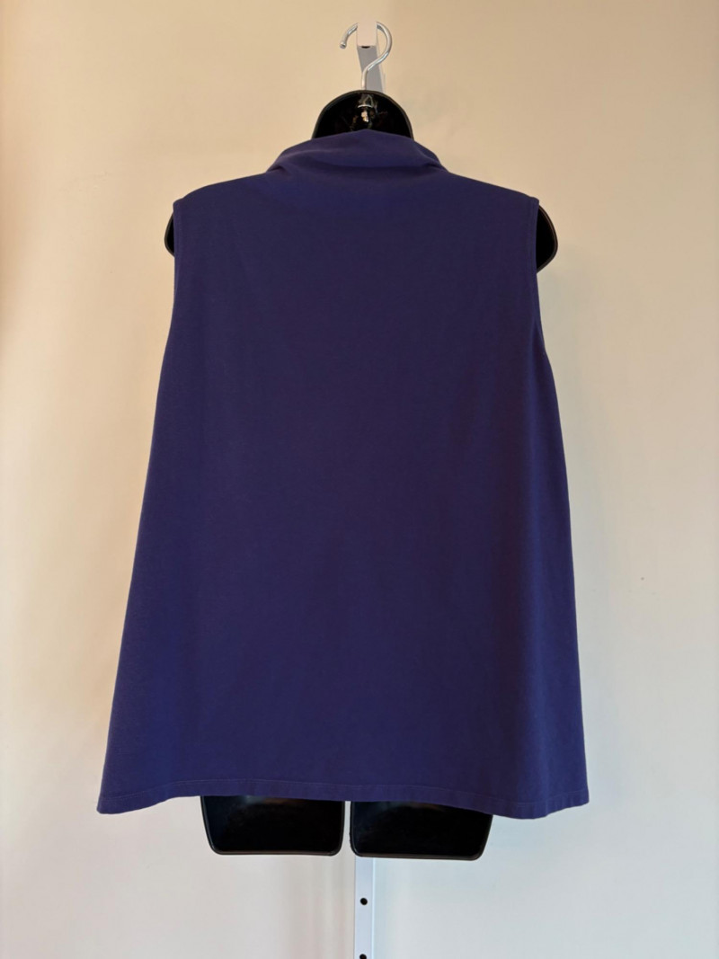 Group of 4 versatile turtlenecks/almost turtlenecks from Mizrahi & Eileen Fisher. All measure between 22" - 23" pit to pit in soft stretchy knit. Brown mock turtleneck from Eileen Fisher has long sleeves. Viscose/spandex blend. Size tag says XL. Purple/blue funnel neck from Eileen Fisher is sleeveless with a split hem. Organic cotton/elastane blend. Size tag says1X. White turtleneck from Eileen Fisher has short sleeves & elasticated neck sides to hold gathering . Viscose/spandex blend. Size tag says XL.