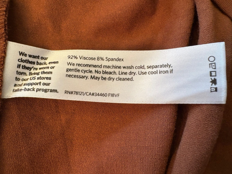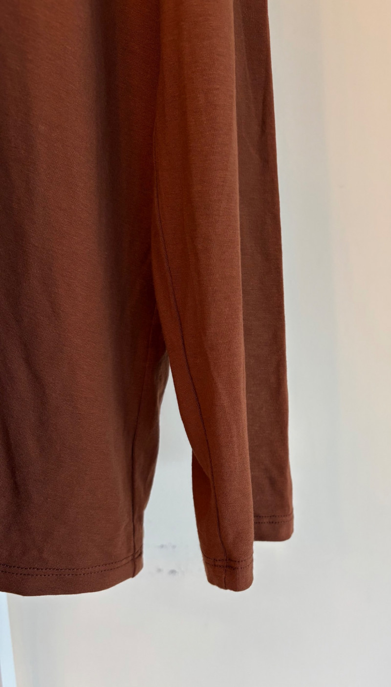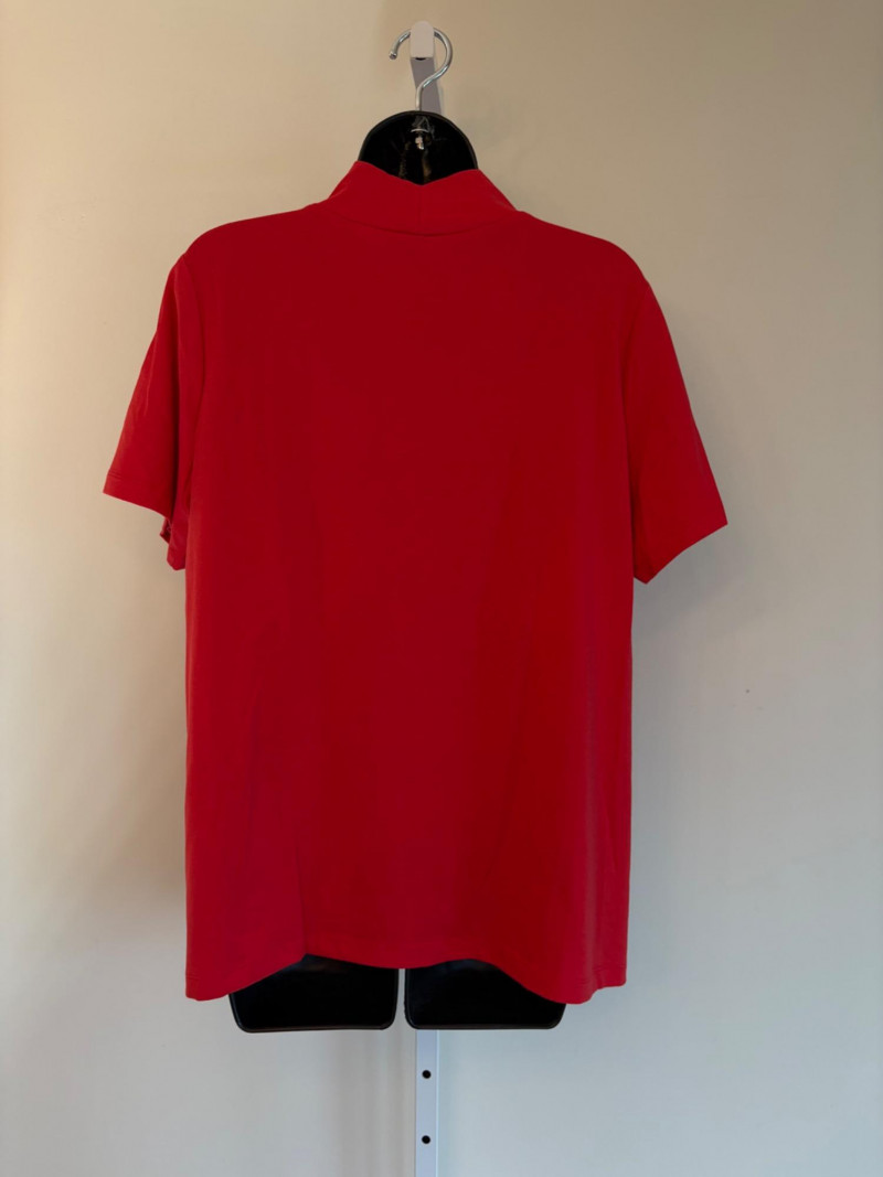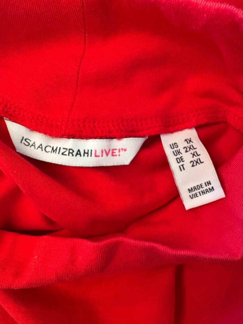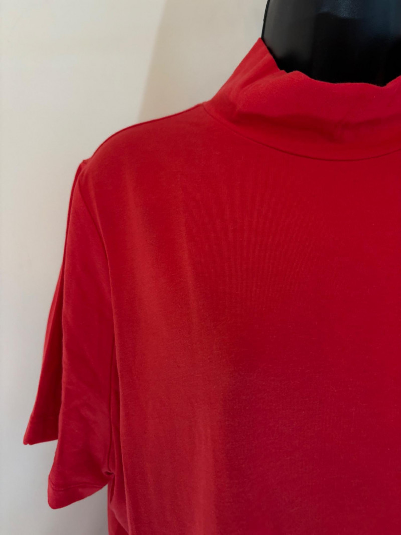 Group of 4 versatile turtlenecks/almost turtlenecks from Mizrahi & Eileen Fisher. All measure between 22" - 23" pit to pit in soft stretchy knit. Brown mock turtleneck from Eileen Fisher has long sleeves. Viscose/spandex blend. Size tag says XL. Purple/blue funnel neck from Eileen Fisher is sleeveless with a split hem. Organic cotton/elastane blend. Size tag says1X. White turtleneck from Eileen Fisher has short sleeves & elasticated neck sides to hold gathering . Viscose/spandex blend. Size tag says XL.
