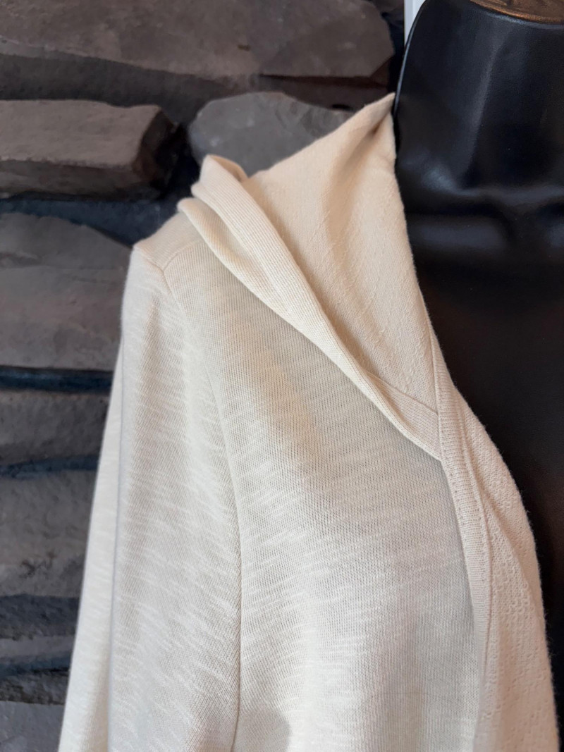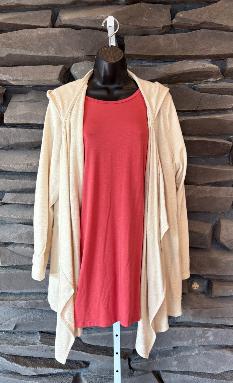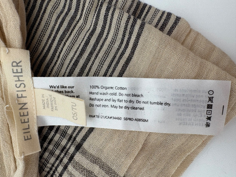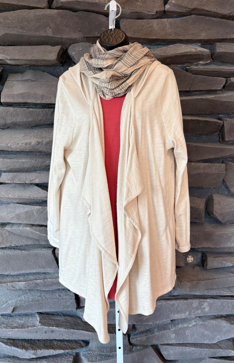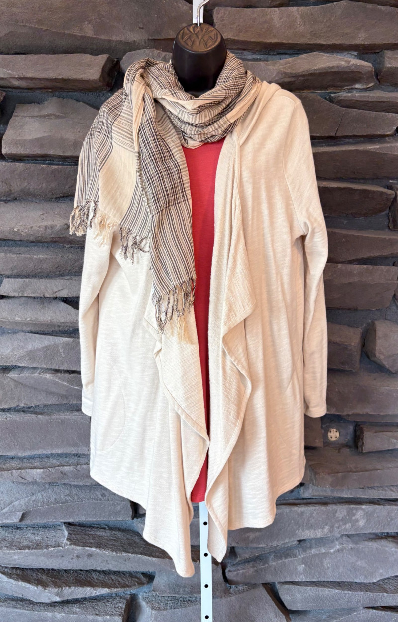 Super comfortable and casual pairing for a day on the town when you want to layer in the cooler weather. Pinkish-orange lightweight shirt from Eileen Fisher is soft with lots of stretch. Tencel Lyocell/spandex blend. Measures 23.5" pit to pit and 29" from back neckline to hem. Size tag says 1X. Cream sweatshirt-like smooth jacket from J. Jill has long sleeves, hood, open front, in-seam side pockets, and wide lapels that can be crossed over with a brooch for extra layering. 100% cotton. Measures 24.5" pit to pit and 29" from back neckline to hem. Size tag says XL. Paired with a beige & black plaid patterned scarf from Eileen Fisher. Measures approximately 28" x 72". 100% organic cotton.