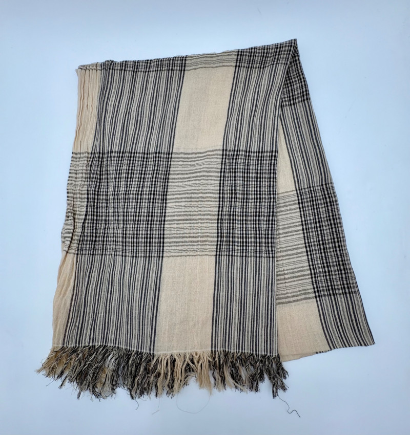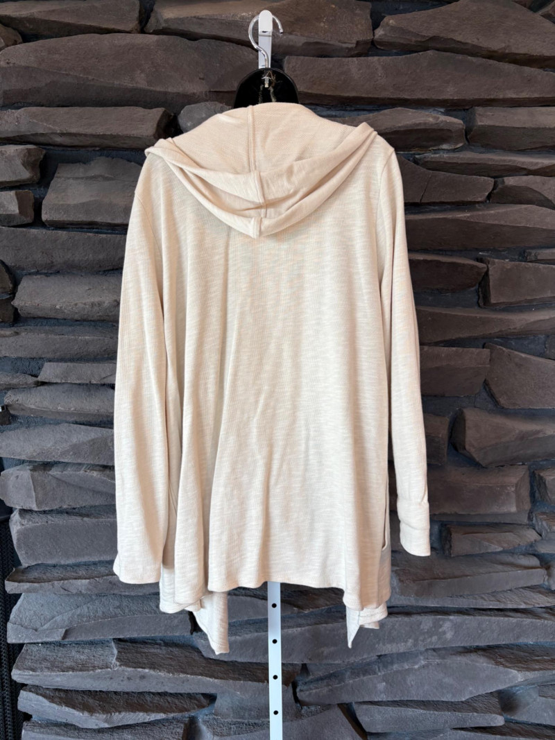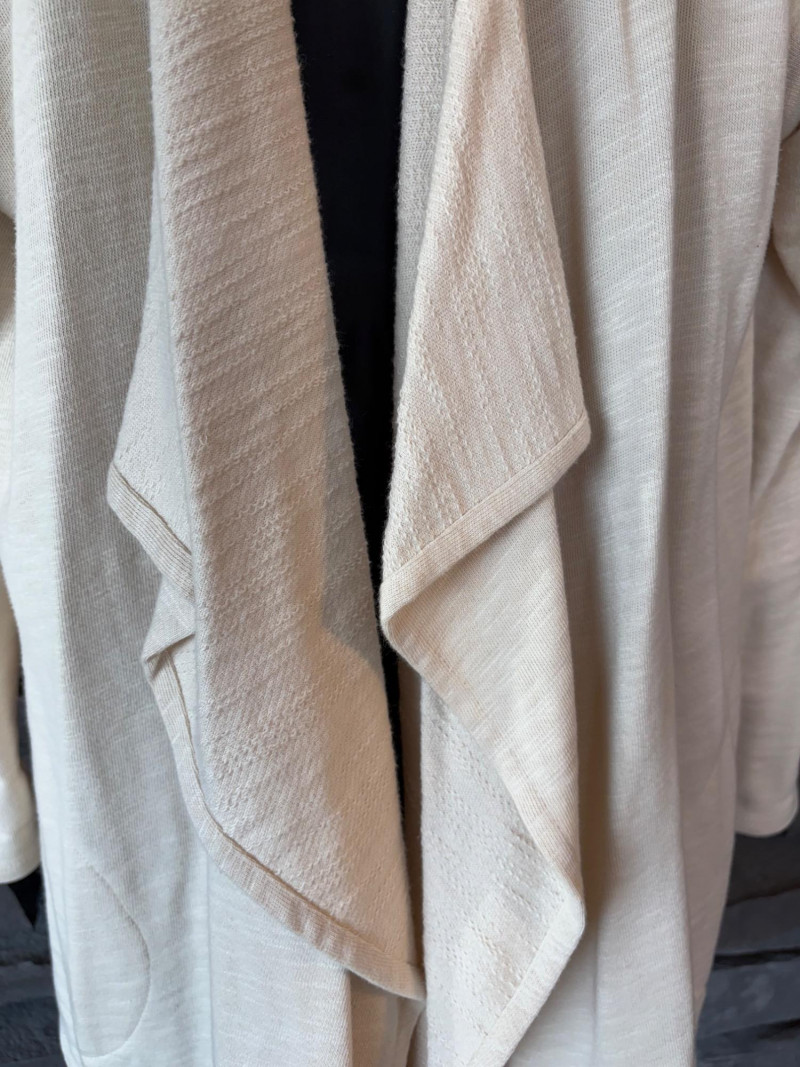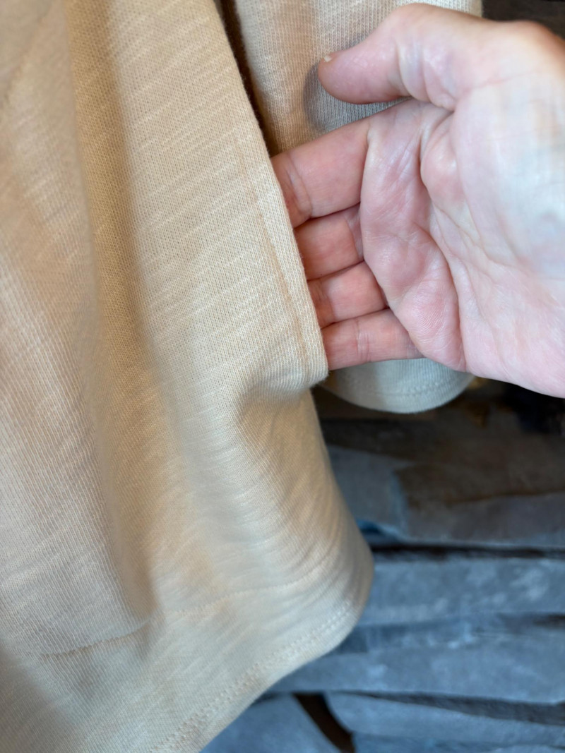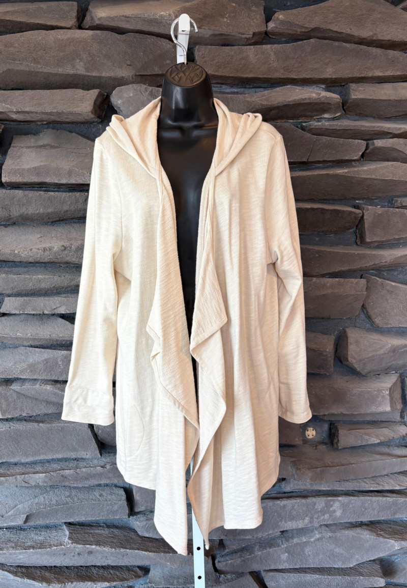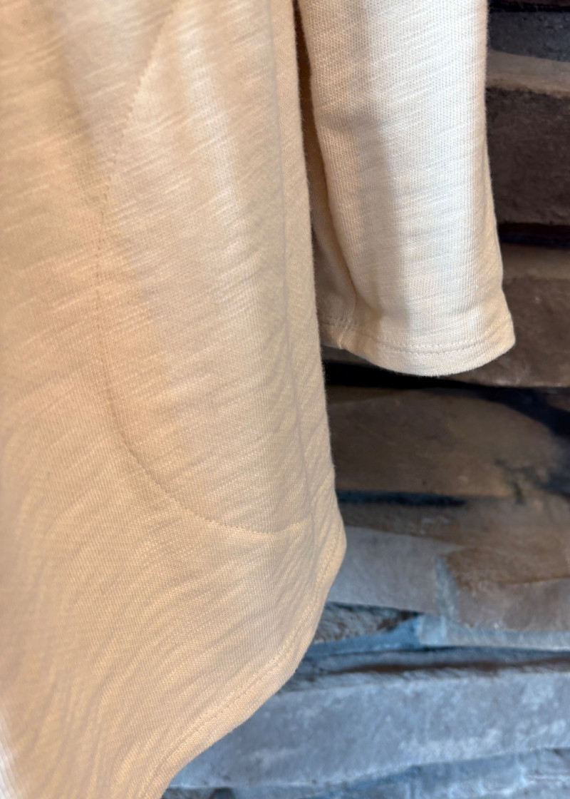 Super comfortable and casual pairing for a day on the town when you want to layer in the cooler weather. Pinkish-orange lightweight shirt from Eileen Fisher is soft with lots of stretch. Tencel Lyocell/spandex blend. Measures 23.5" pit to pit and 29" from back neckline to hem. Size tag says 1X. Cream sweatshirt-like smooth jacket from J. Jill has long sleeves, hood, open front, in-seam side pockets, and wide lapels that can be crossed over with a brooch for extra layering. 100% cotton. Measures 24.5" pit to pit and 29" from back neckline to hem. Size tag says XL. Paired with a beige & black plaid patterned scarf from Eileen Fisher. Measures approximately 28" x 72". 100% organic cotton.