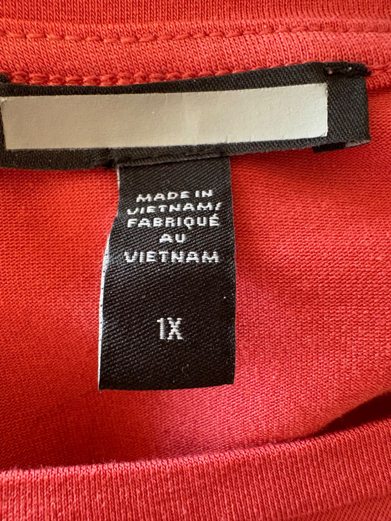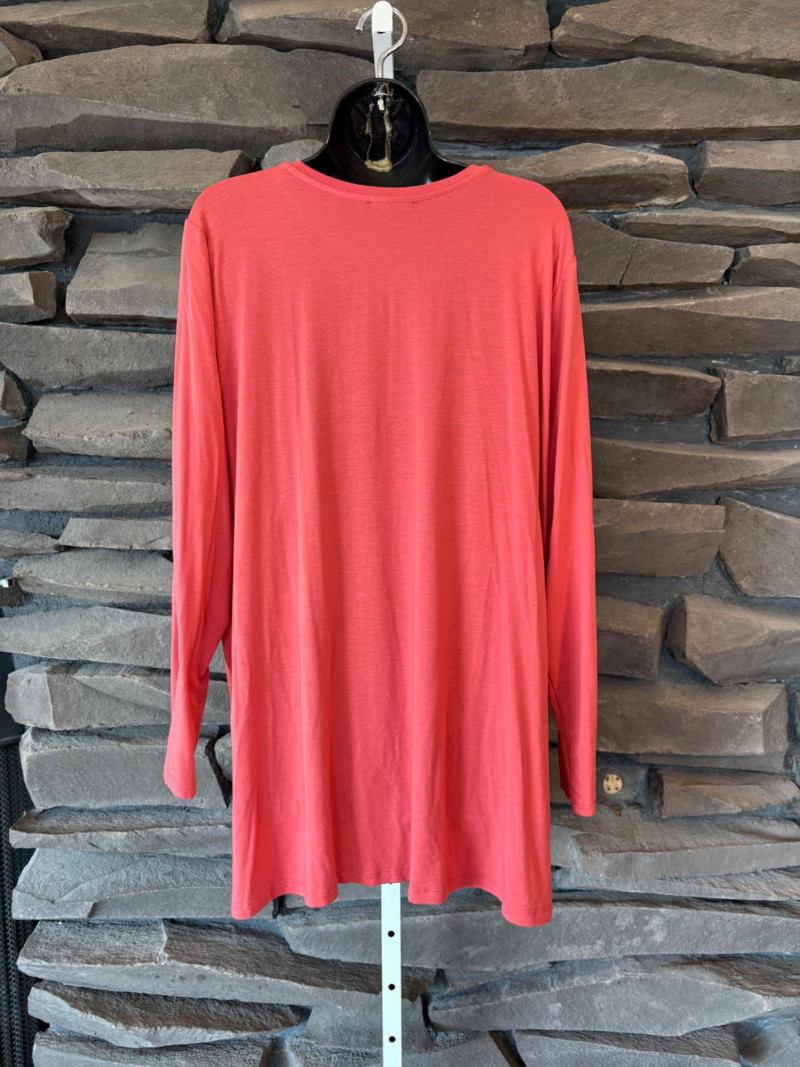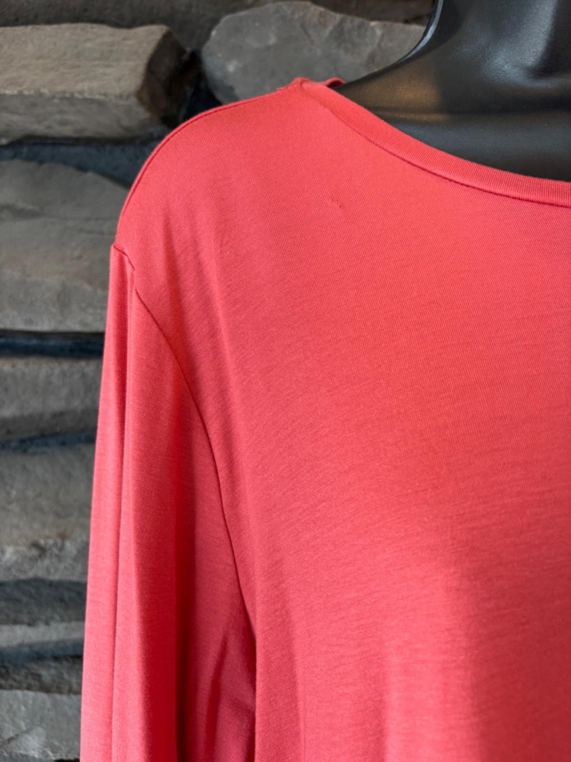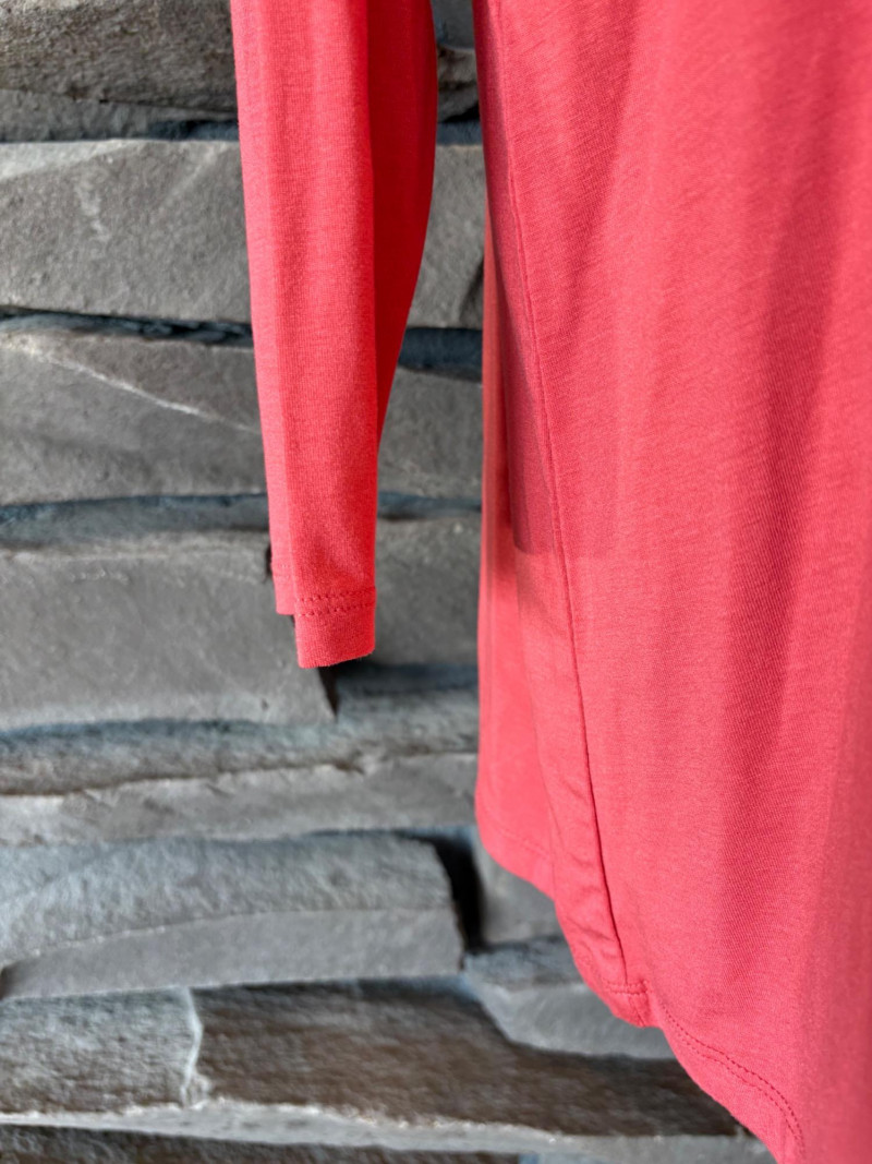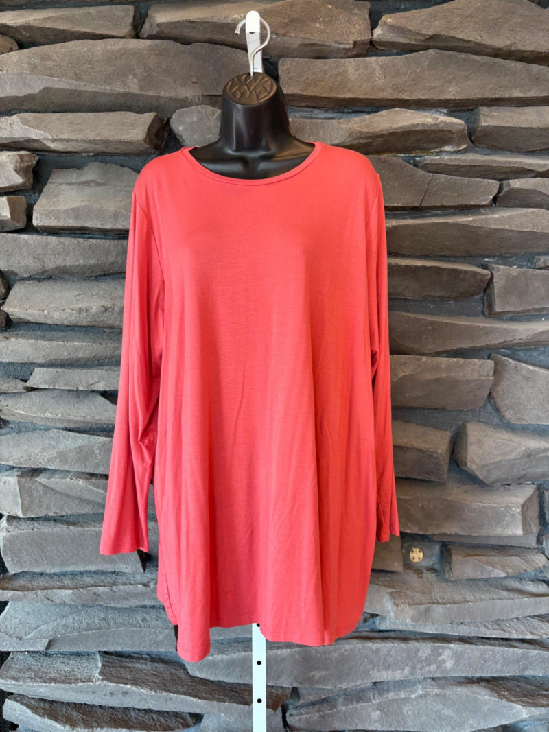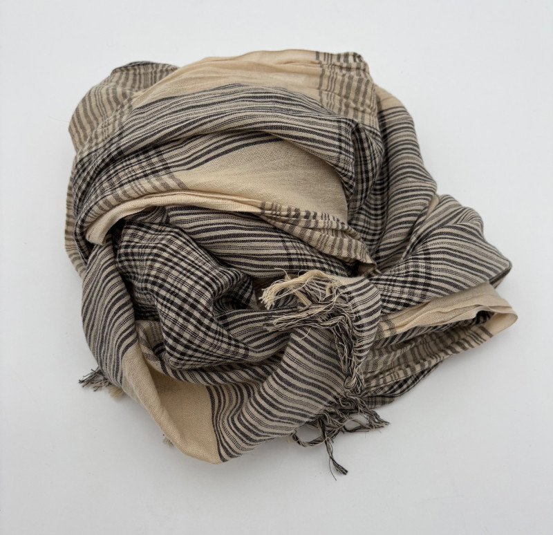 Super comfortable and casual pairing for a day on the town when you want to layer in the cooler weather. Pinkish-orange lightweight shirt from Eileen Fisher is soft with lots of stretch. Tencel Lyocell/spandex blend. Measures 23.5" pit to pit and 29" from back neckline to hem. Size tag says 1X. Cream sweatshirt-like smooth jacket from J. Jill has long sleeves, hood, open front, in-seam side pockets, and wide lapels that can be crossed over with a brooch for extra layering. 100% cotton. Measures 24.5" pit to pit and 29" from back neckline to hem. Size tag says XL. Paired with a beige & black plaid patterned scarf from Eileen Fisher. Measures approximately 28" x 72". 100% organic cotton.