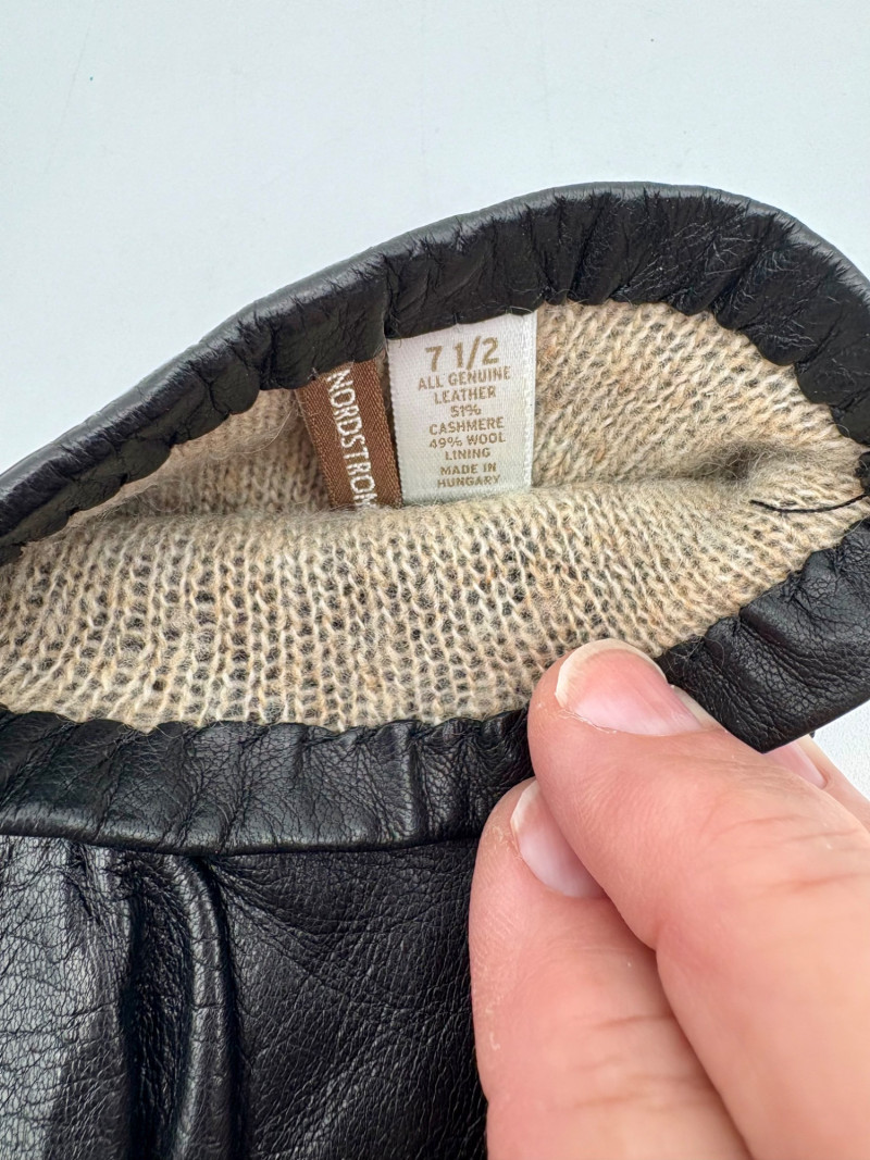 Winter lot consisting of 2 wool hats, 4 pairs of leather gloves, 1 pair of wool blend gloves, polar fleece headband, & rabbit fur earmuffs. See photos for details.