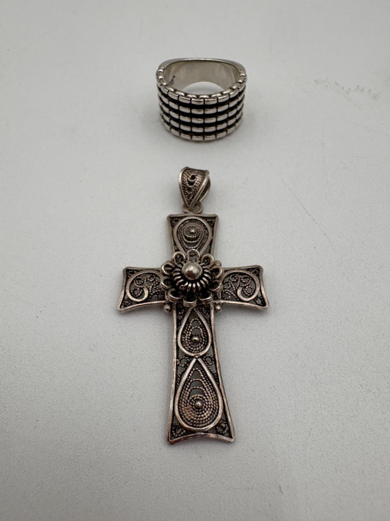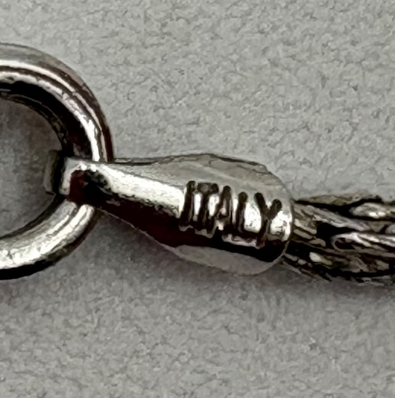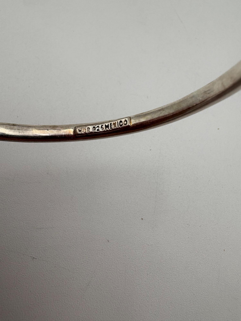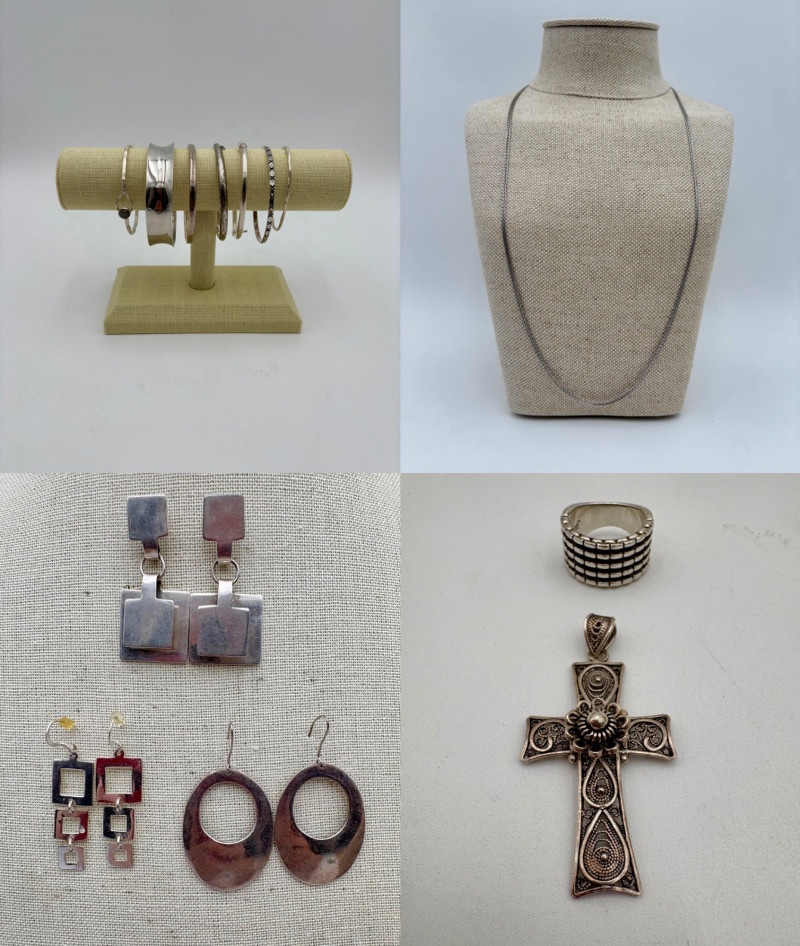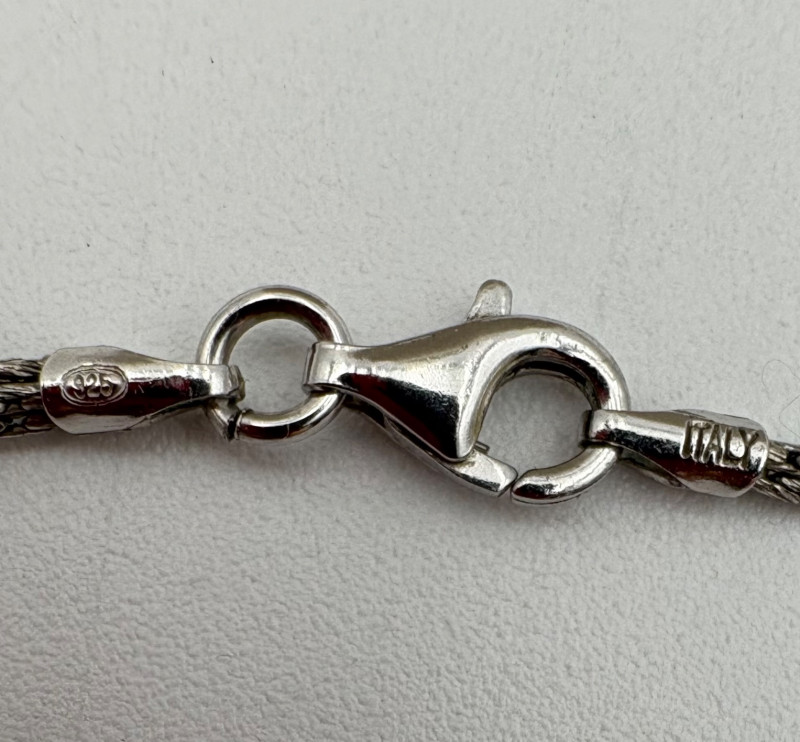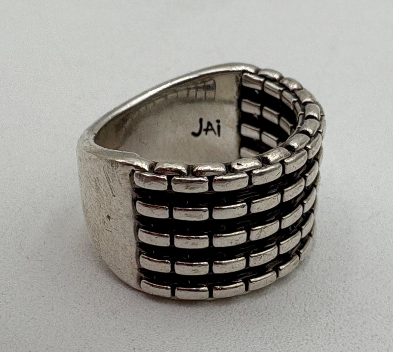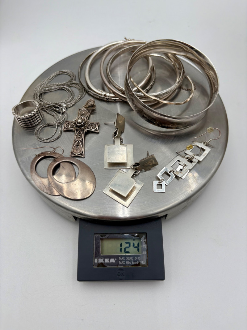 Group of sterling jewelry includes 7 bracelets, 3-strand chain necklace, ring, and 3 pairs of earrings. Total weight (not including the bracelet with labradorite stone) is 124 grams. Bracelet with stone weighs 8 grams. Assorted bracelets are all marked .925 or "STER" or "sterling" or "silver". Several are from Mexico and have maker marks we are unfamiliar with. One with laborodite stone is from LR https://www.ebay.com/itm/145715929729 Trio of pierced earrings - one from Taxco, Mexico. All marked .925 or "STER" John Hardy "Jai" ring. Marked .925 and "JAI". Filigree cross marked .925 and "DGS Turkey" https://www.ebay.com/itm/145715929729