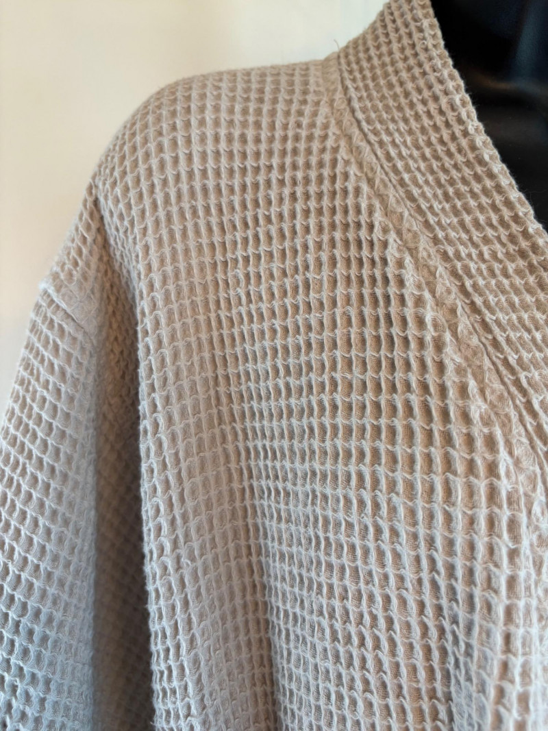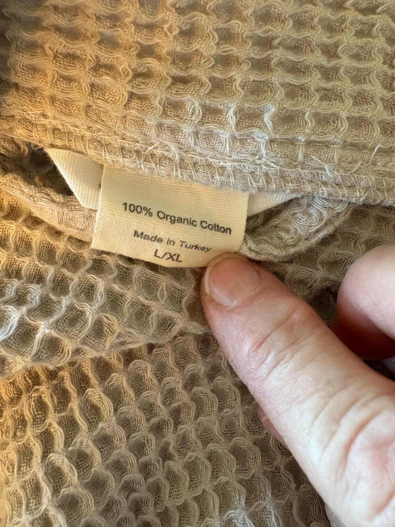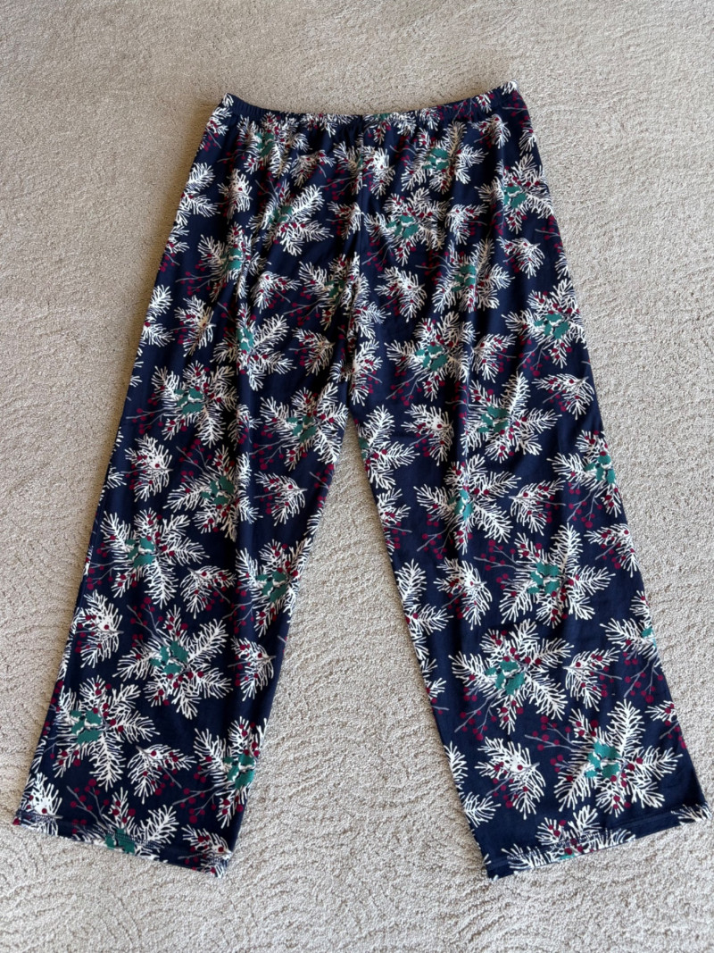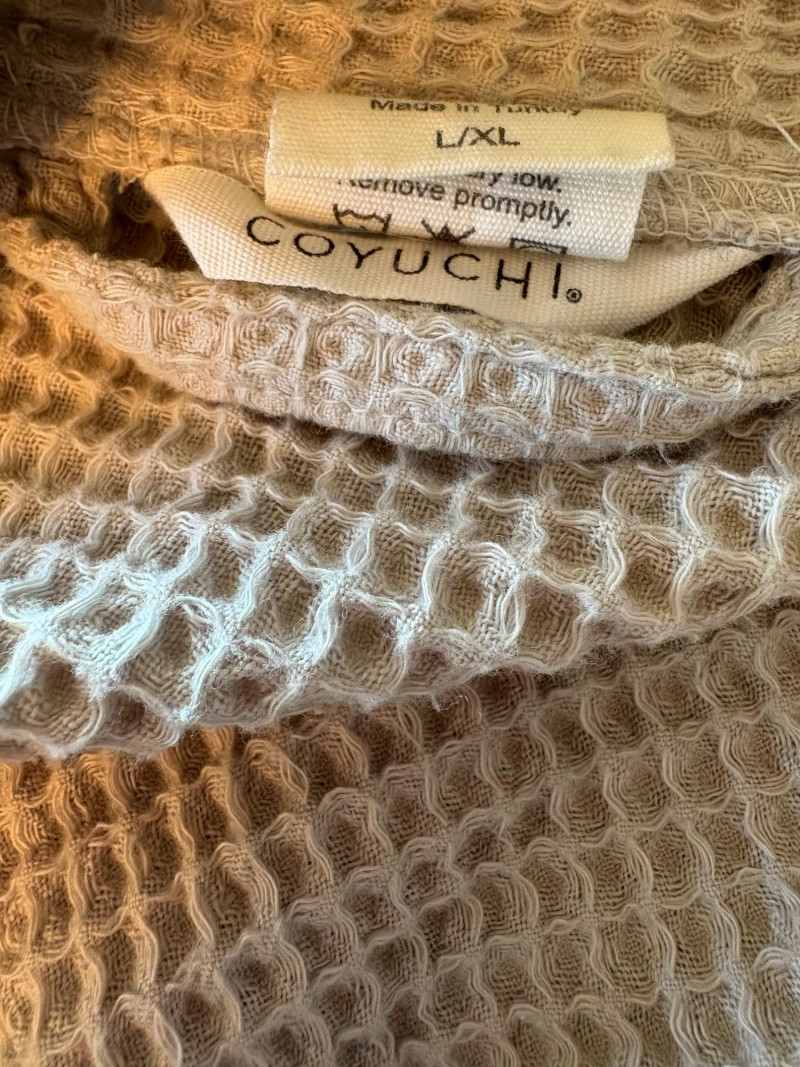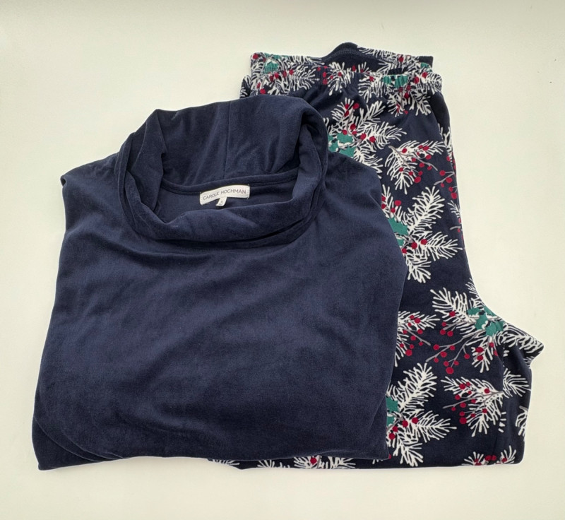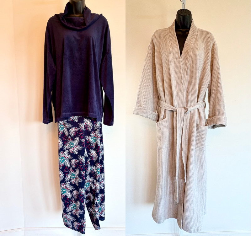 Cotton robe from Coyuchi and soft PJ set from Carole Hochman. Navy blue PJ set has solid cowl neck top with long sleeves and winter-patterned bottoms with elastic waistband and in-seam pockets. Top measures 26" pit to pit. Bottoms measure 18" side to side at waist. Both pieces 100% polyester and super soft - feels like short "Minky". Size tag says XL. Waffle weave pale taupe/grey robe from Coyuchi has tie belt and front patch pockets. 100% organic cotton. Size tag says L/XL.