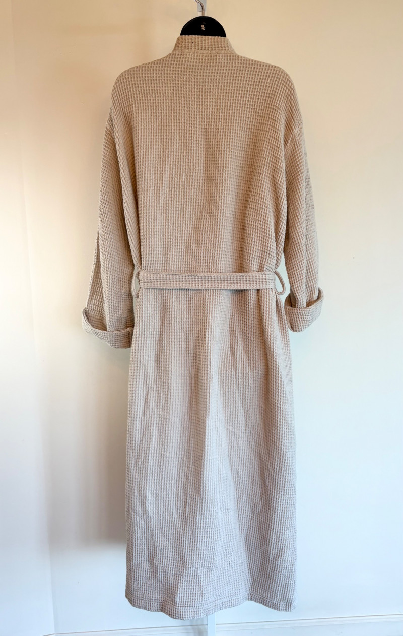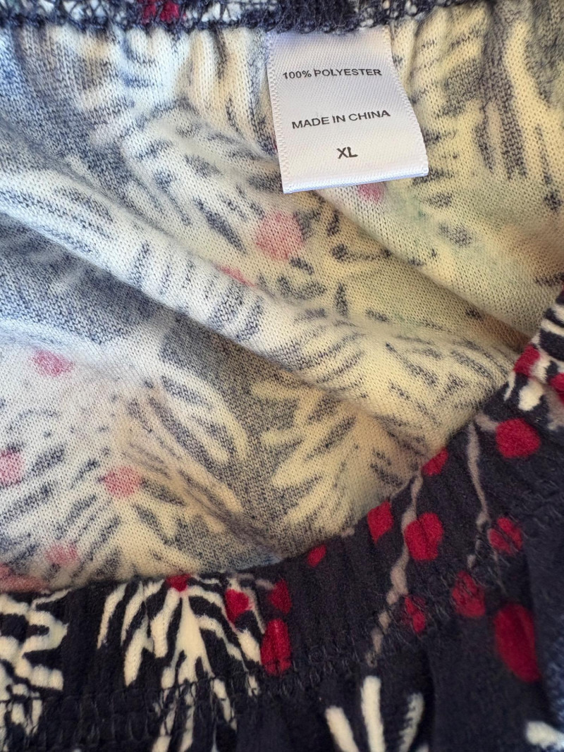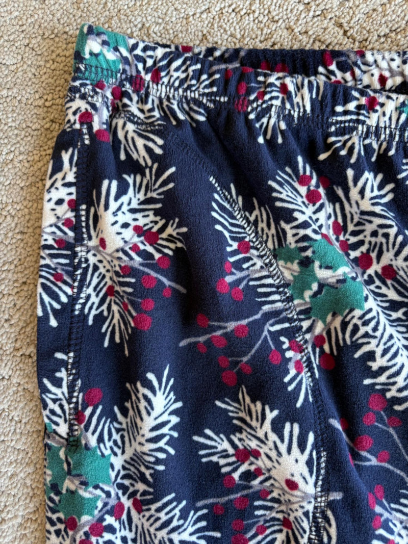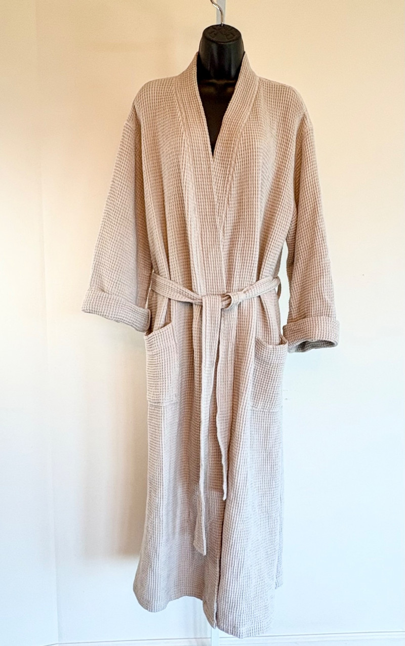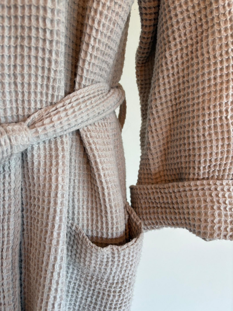 Cotton robe from Coyuchi and soft PJ set from Carole Hochman. Navy blue PJ set has solid cowl neck top with long sleeves and winter-patterned bottoms with elastic waistband and in-seam pockets. Top measures 26" pit to pit. Bottoms measure 18" side to side at waist. Both pieces 100% polyester and super soft - feels like short "Minky". Size tag says XL. Waffle weave pale taupe/grey robe from Coyuchi has tie belt and front patch pockets. 100% organic cotton. Size tag says L/XL.