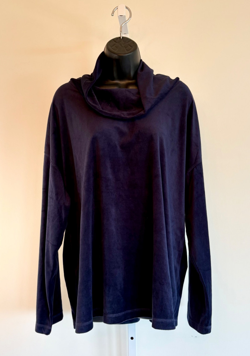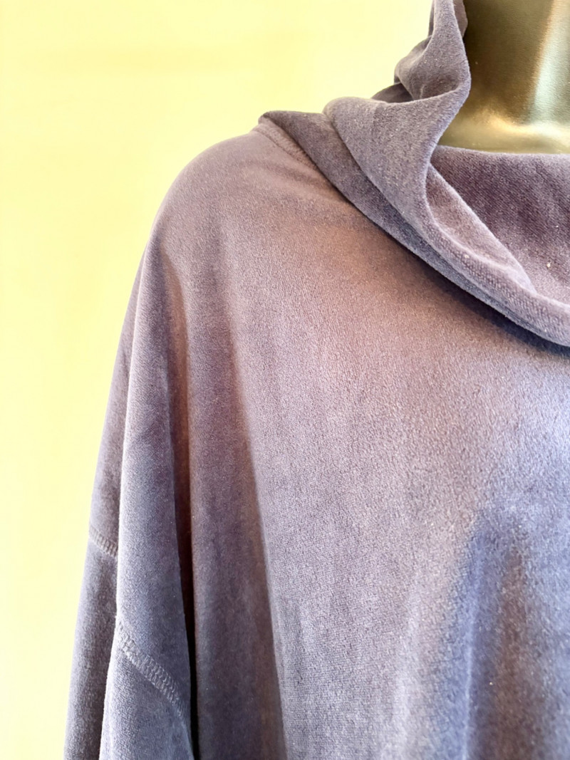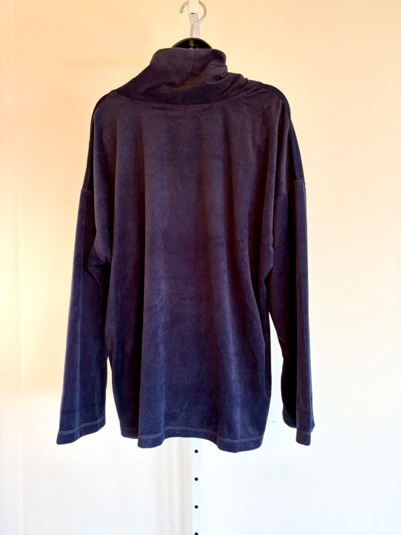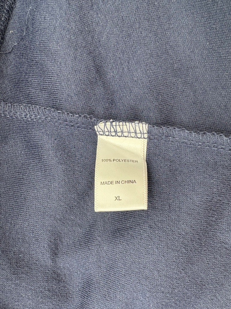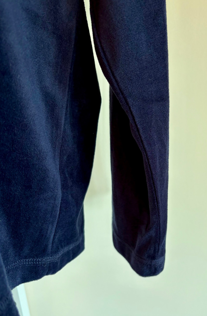 Cotton robe from Coyuchi and soft PJ set from Carole Hochman. Navy blue PJ set has solid cowl neck top with long sleeves and winter-patterned bottoms with elastic waistband and in-seam pockets. Top measures 26" pit to pit. Bottoms measure 18" side to side at waist. Both pieces 100% polyester and super soft - feels like short "Minky". Size tag says XL. Waffle weave pale taupe/grey robe from Coyuchi has tie belt and front patch pockets. 100% organic cotton. Size tag says L/XL.