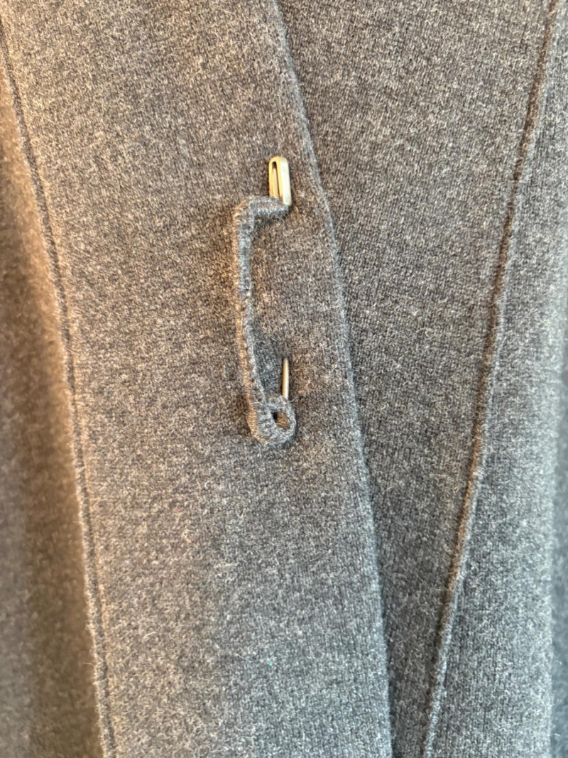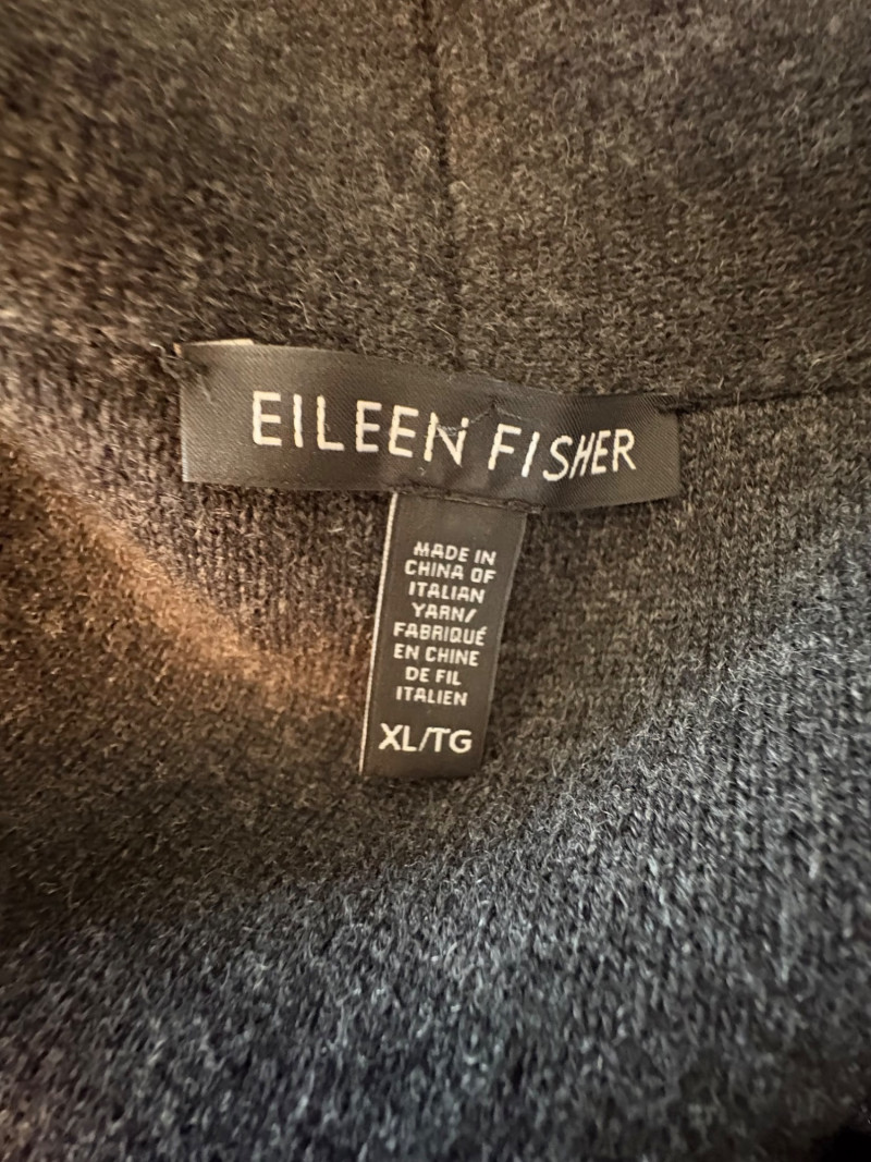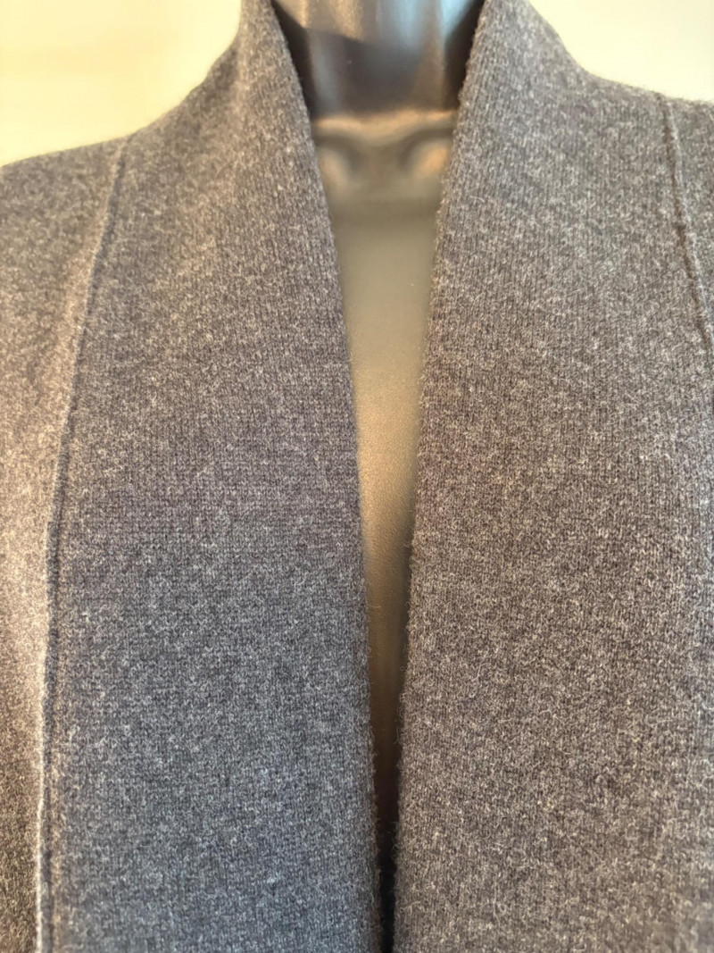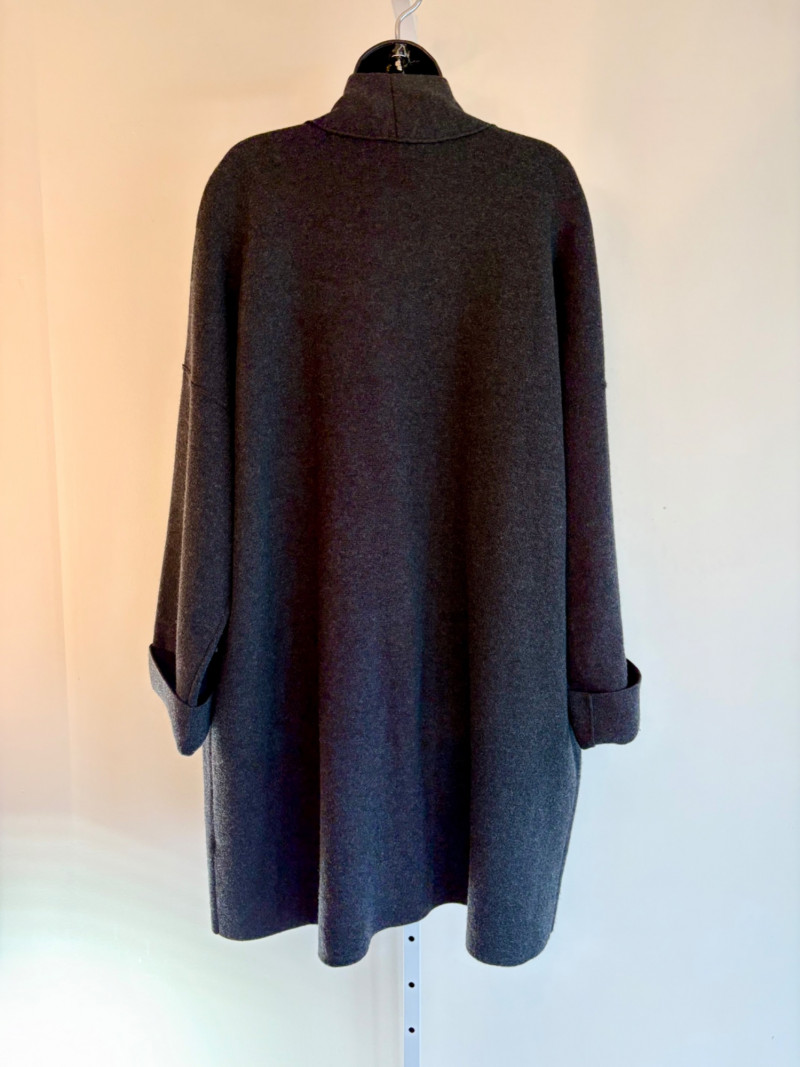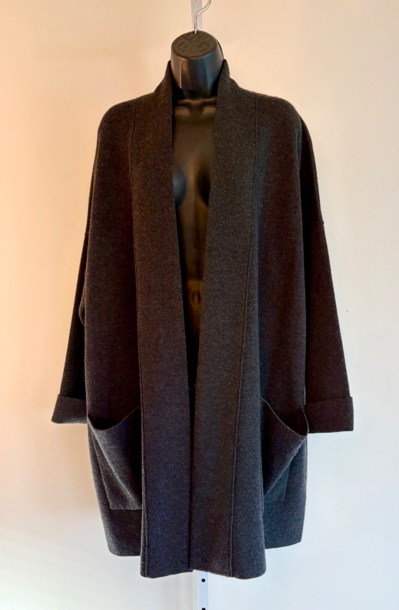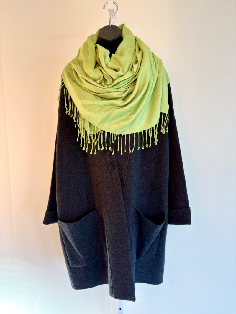 Stunning cashmere coat from Eileen Fisher. Deep grey oversized coat has a slight cocoon shape, front patch pockets, and decorative thread-wrapped safety pin should you want to secure the front closed. Cashmere/recycled cashmere/merino wool/nylon/spandex blend give the coat some heft. Measures 33" pit to pit and 36" from back neckline to hem. Size tag says XL. Note that the coat is in great shape, but could move to the excellent category after a speed date with your sweater shaver. Perfectly fine as is, however. Paired with large vivid green scarf with fringe on the short ends. Measures approximately 32" x 80". No maker or fabric tag, but feels like pashmina.