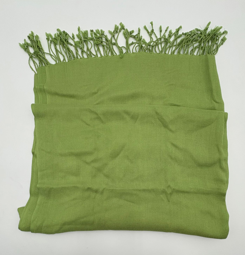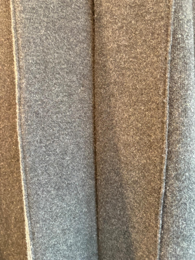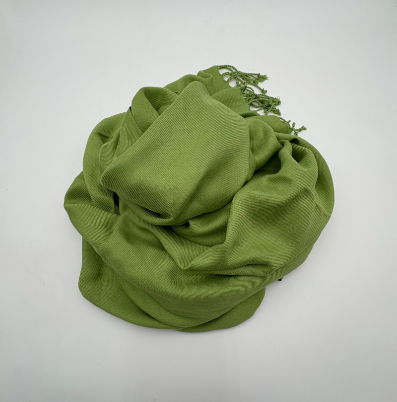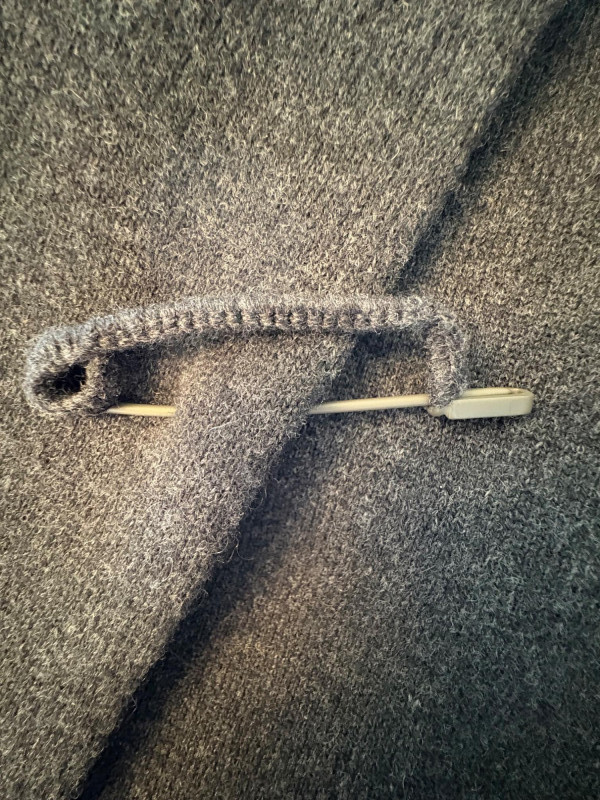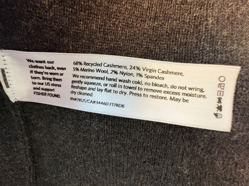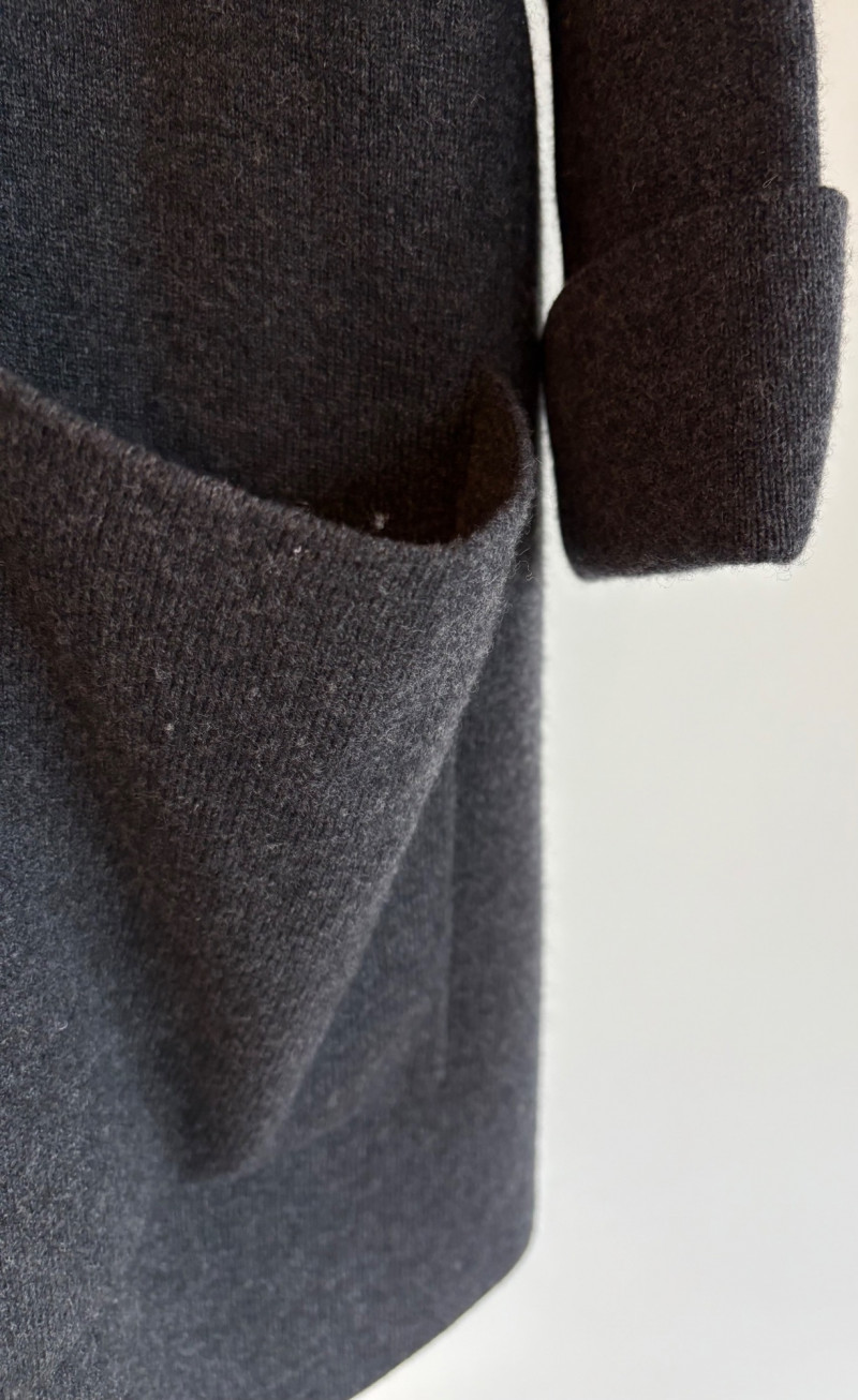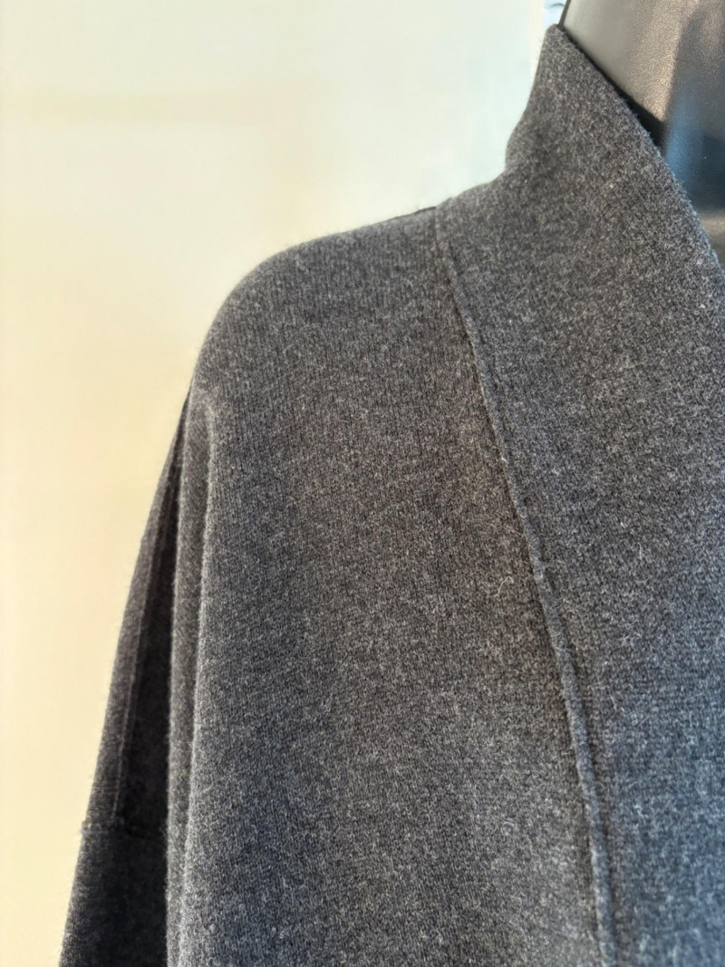 Stunning cashmere coat from Eileen Fisher. Deep grey oversized coat has a slight cocoon shape, front patch pockets, and decorative thread-wrapped safety pin should you want to secure the front closed. Cashmere/recycled cashmere/merino wool/nylon/spandex blend give the coat some heft. Measures 33" pit to pit and 36" from back neckline to hem. Size tag says XL. Note that the coat is in great shape, but could move to the excellent category after a speed date with your sweater shaver. Perfectly fine as is, however. Paired with large vivid green scarf with fringe on the short ends. Measures approximately 32" x 80". No maker or fabric tag, but feels like pashmina.