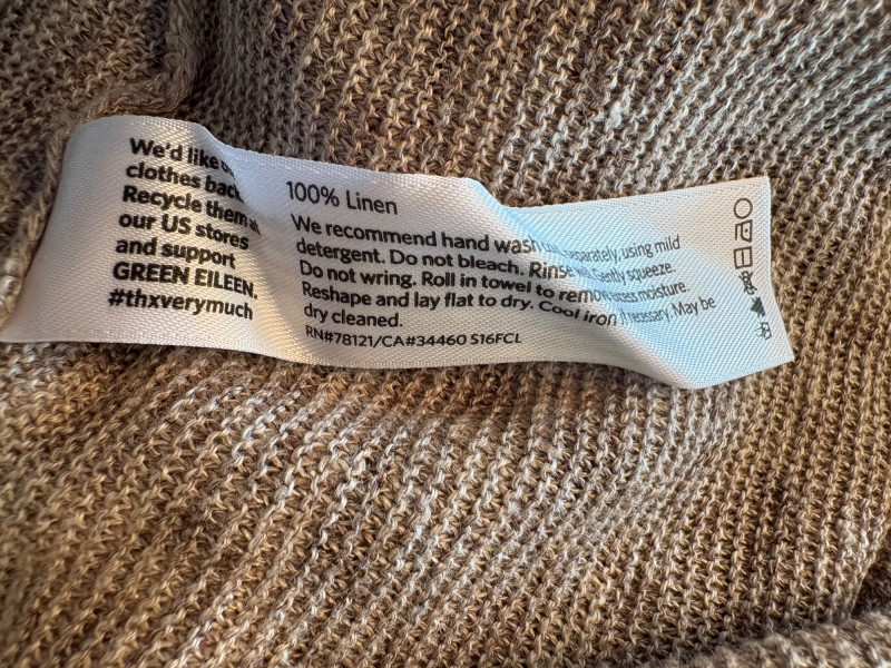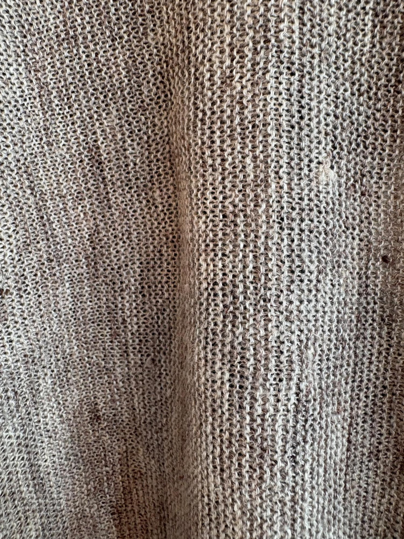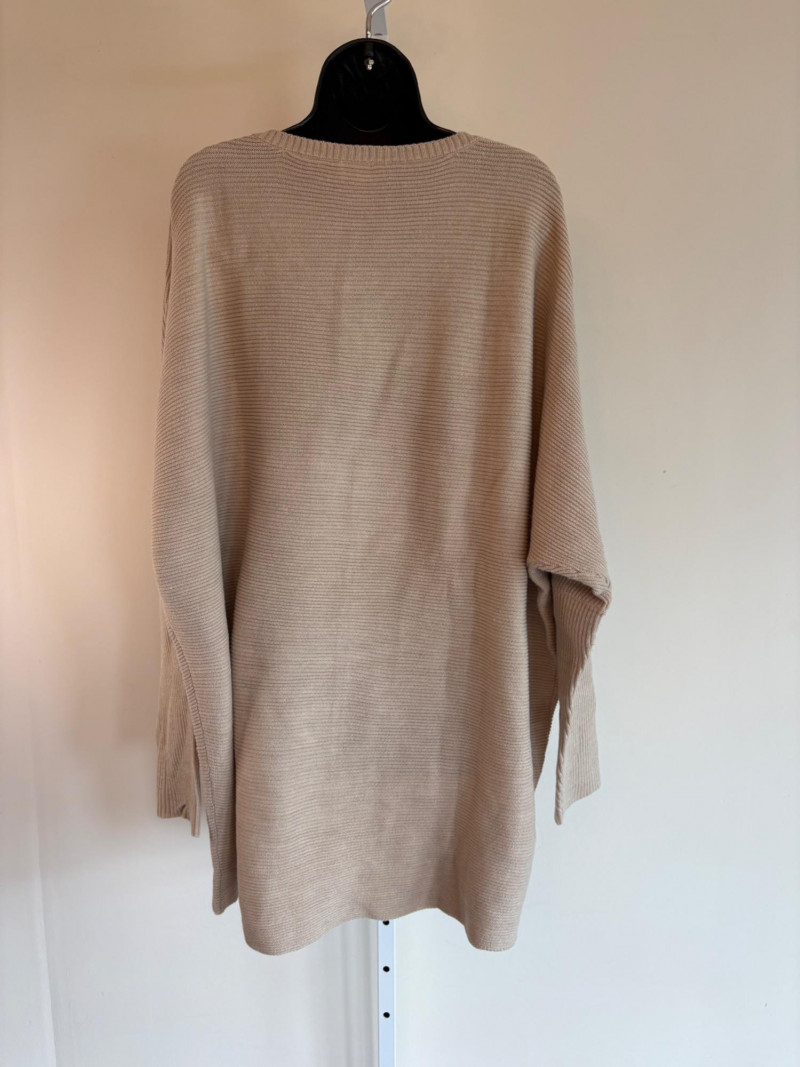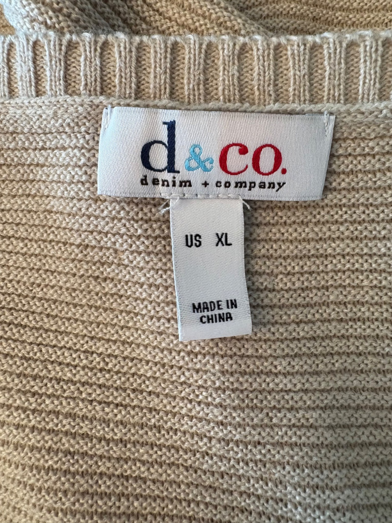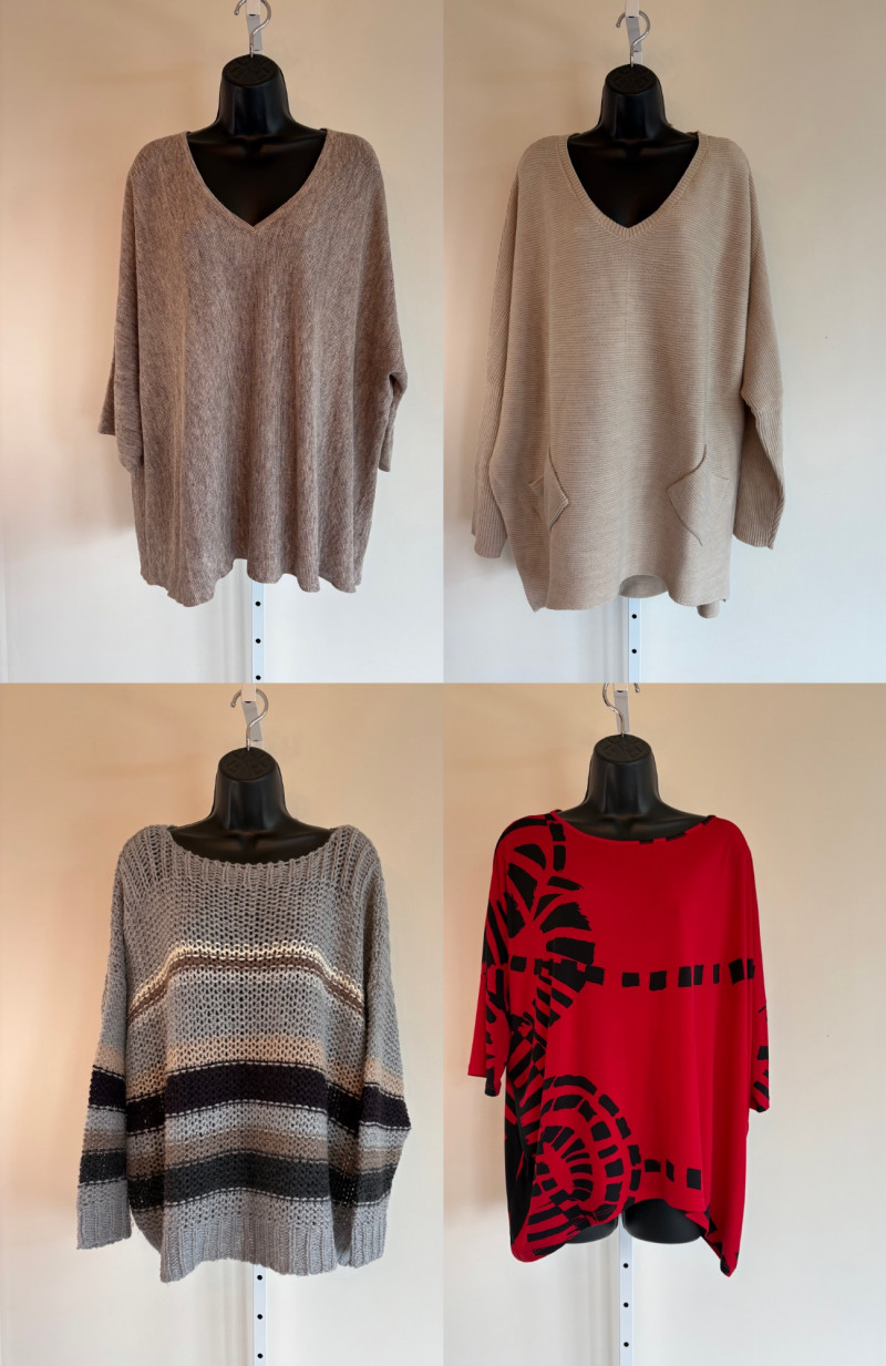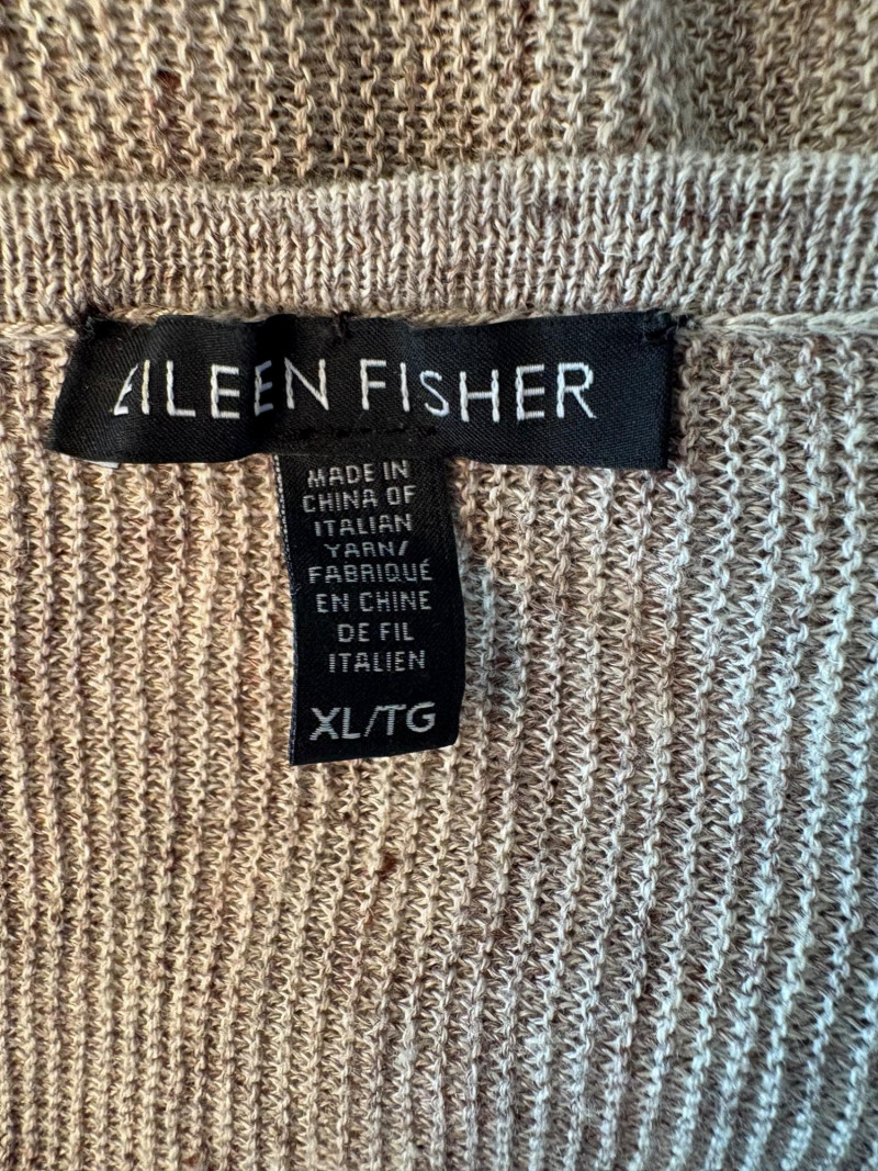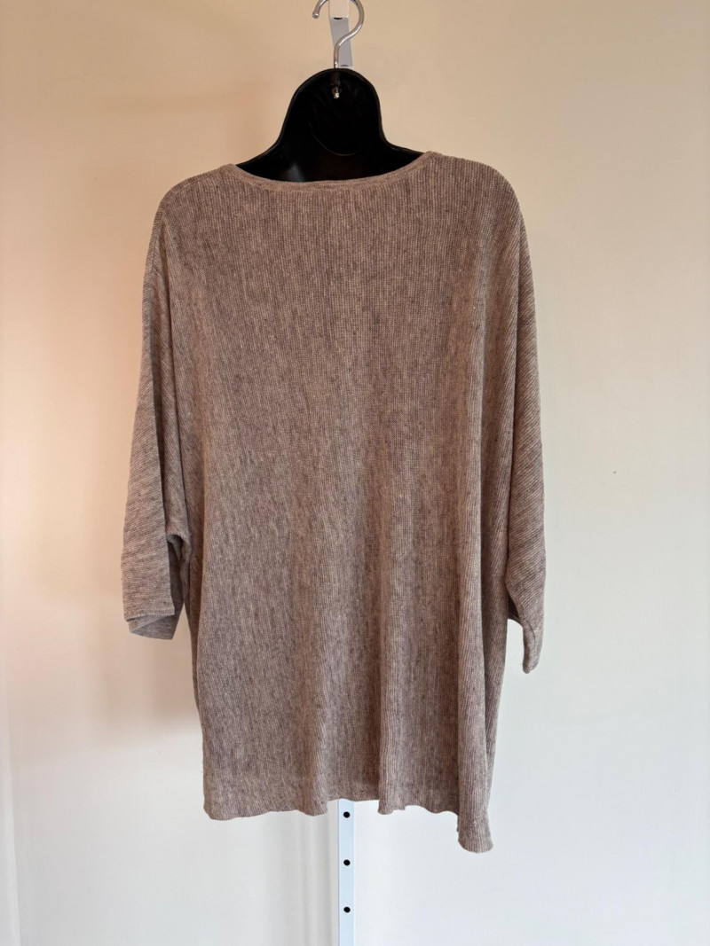 Combination lot of sweaters and a comfortable shirt. All pieces measure between 29" and 31” pit to pit, so these are larger than many other pieces in this auction. Variegated beige/brown sweater from Eileen Fisher has elbow length sleeves and ribbing at neckline & sleeve ends. 100% linen. Size tag says XL. Note - naturally occurring slubs in linen often pill - a date with your sweater shaver will make this look new again. Beige oversize sweater from D&Co. has V-neck, ribbed sleeves with dropped shoulder seams, angled front patch pockets, and curved back hem that is longer than front. Acrylic. Size tag says XL, but we think it is more generous. Old Navy striped sweater has curved neckline, dropped shoulder seams, and ribbing at cuffs and lower hem. Stripes are variable shades of brown, gray, and cream in a loose weave. Polyester/acrylic/wool blend. Size tag says XL. Clara Sun Woo red and black super stretchy casual shirt with dropped shoulder seams, short sleeves, curved neckline, and shark bite hem. Polyester/rayon/spandex blend. Size tag says XL.