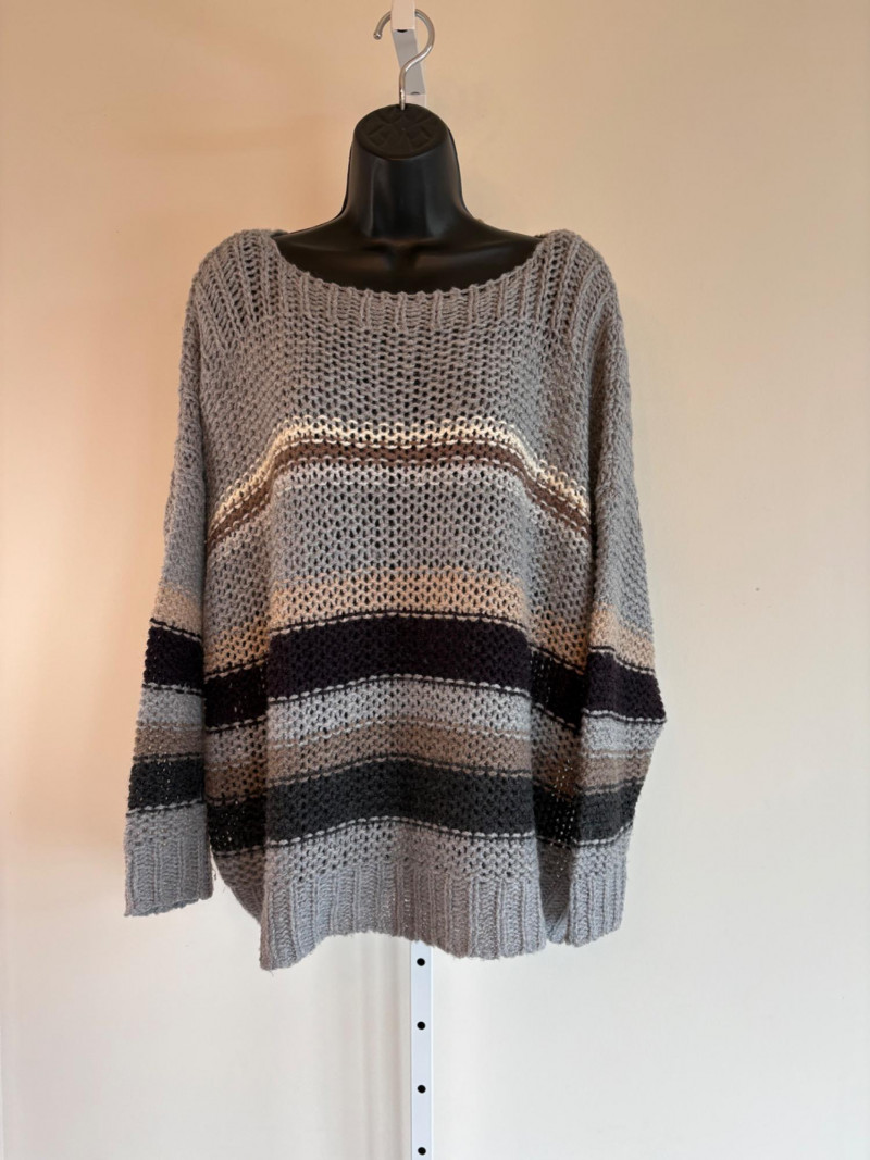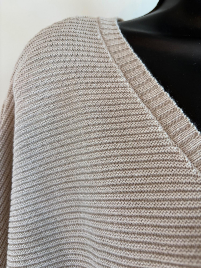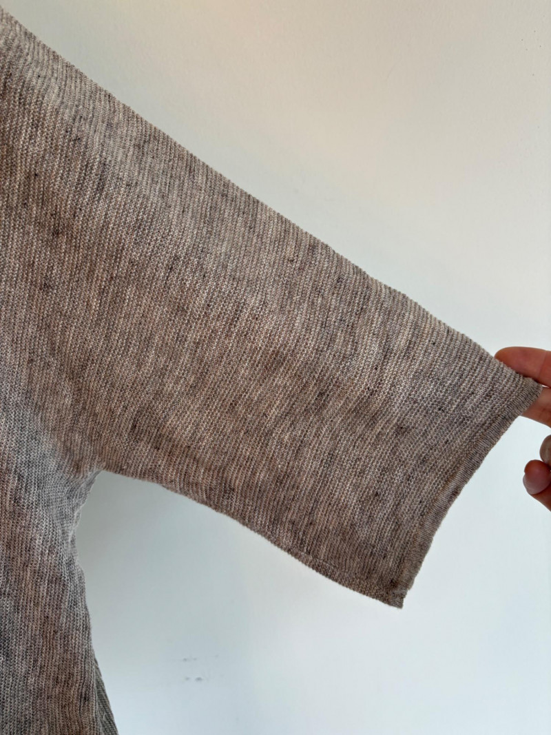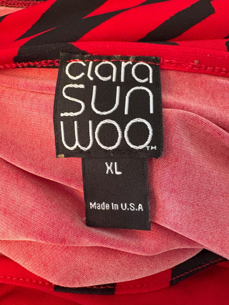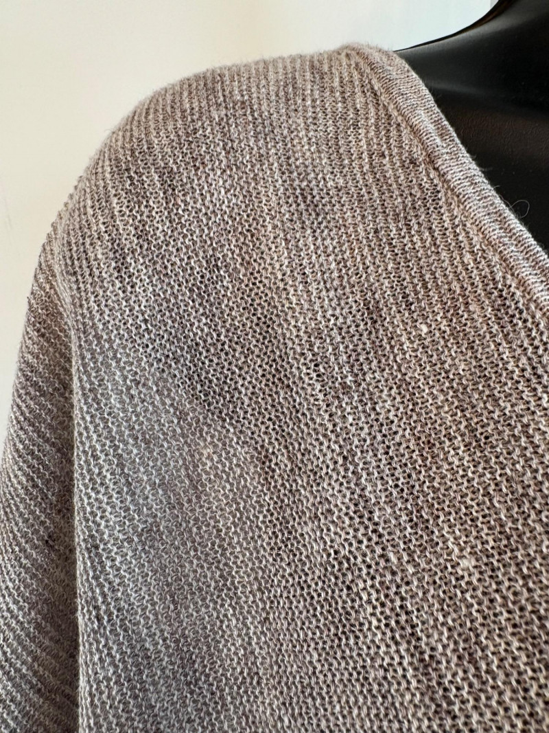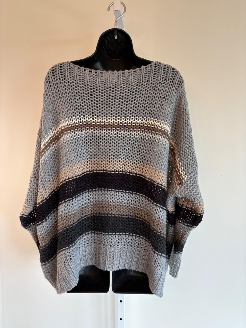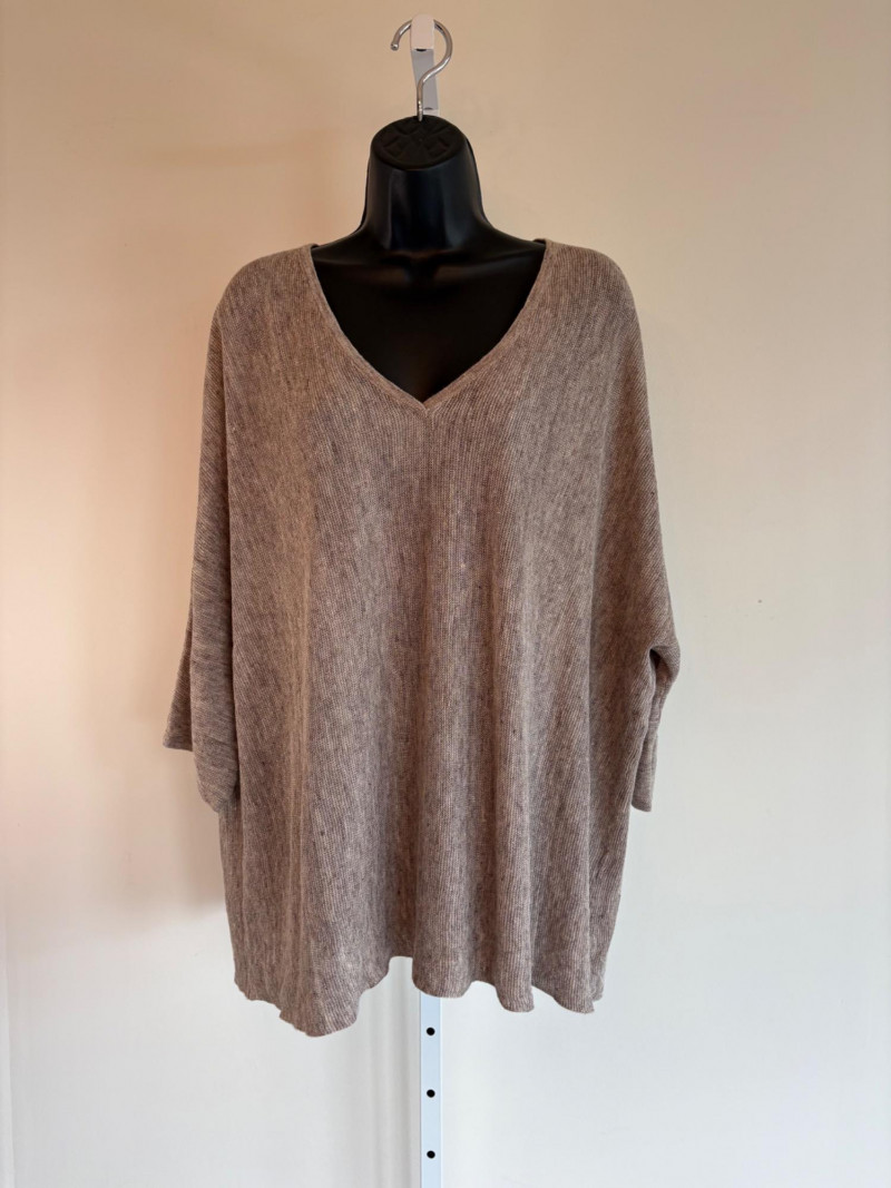 Combination lot of sweaters and a comfortable shirt. All pieces measure between 29" and 31” pit to pit, so these are larger than many other pieces in this auction. Variegated beige/brown sweater from Eileen Fisher has elbow length sleeves and ribbing at neckline & sleeve ends. 100% linen. Size tag says XL. Note - naturally occurring slubs in linen often pill - a date with your sweater shaver will make this look new again. Beige oversize sweater from D&Co. has V-neck, ribbed sleeves with dropped shoulder seams, angled front patch pockets, and curved back hem that is longer than front. Acrylic. Size tag says XL, but we think it is more generous. Old Navy striped sweater has curved neckline, dropped shoulder seams, and ribbing at cuffs and lower hem. Stripes are variable shades of brown, gray, and cream in a loose weave. Polyester/acrylic/wool blend. Size tag says XL. Clara Sun Woo red and black super stretchy casual shirt with dropped shoulder seams, short sleeves, curved neckline, and shark bite hem. Polyester/rayon/spandex blend. Size tag says XL.