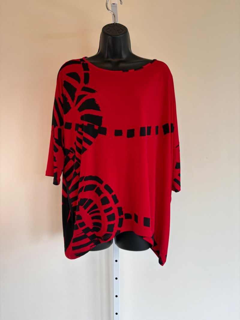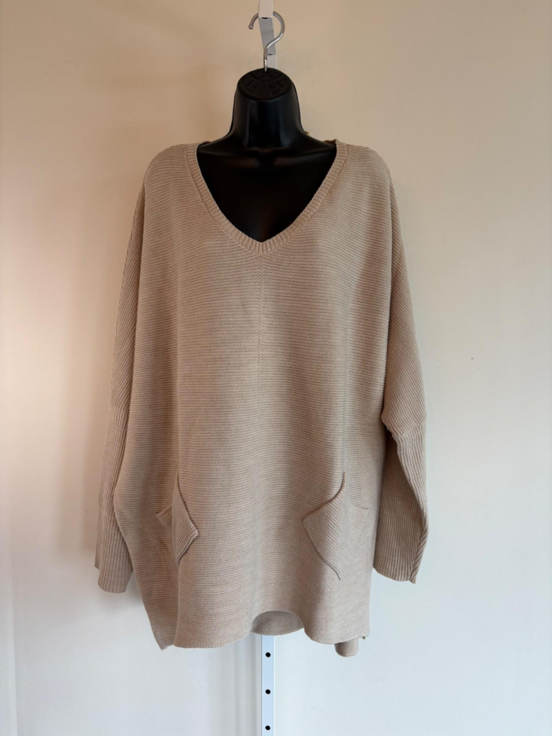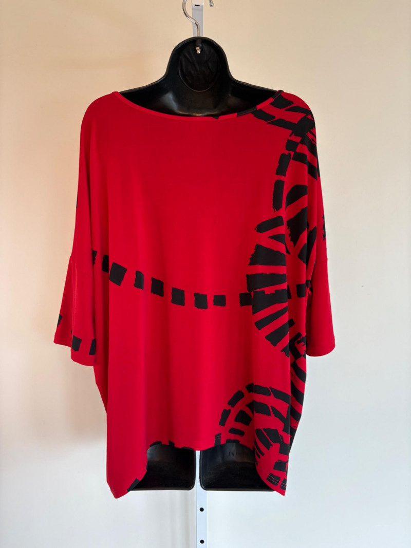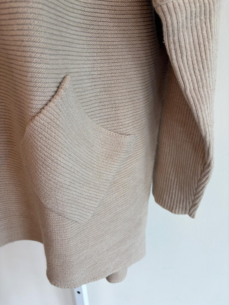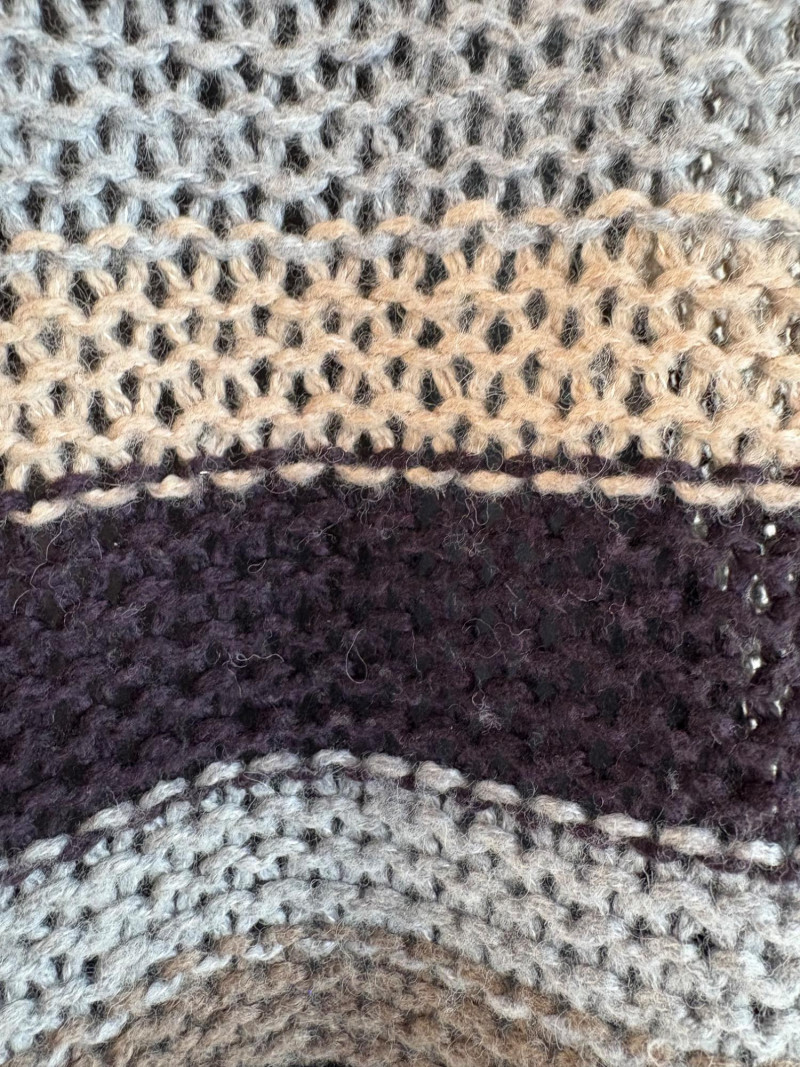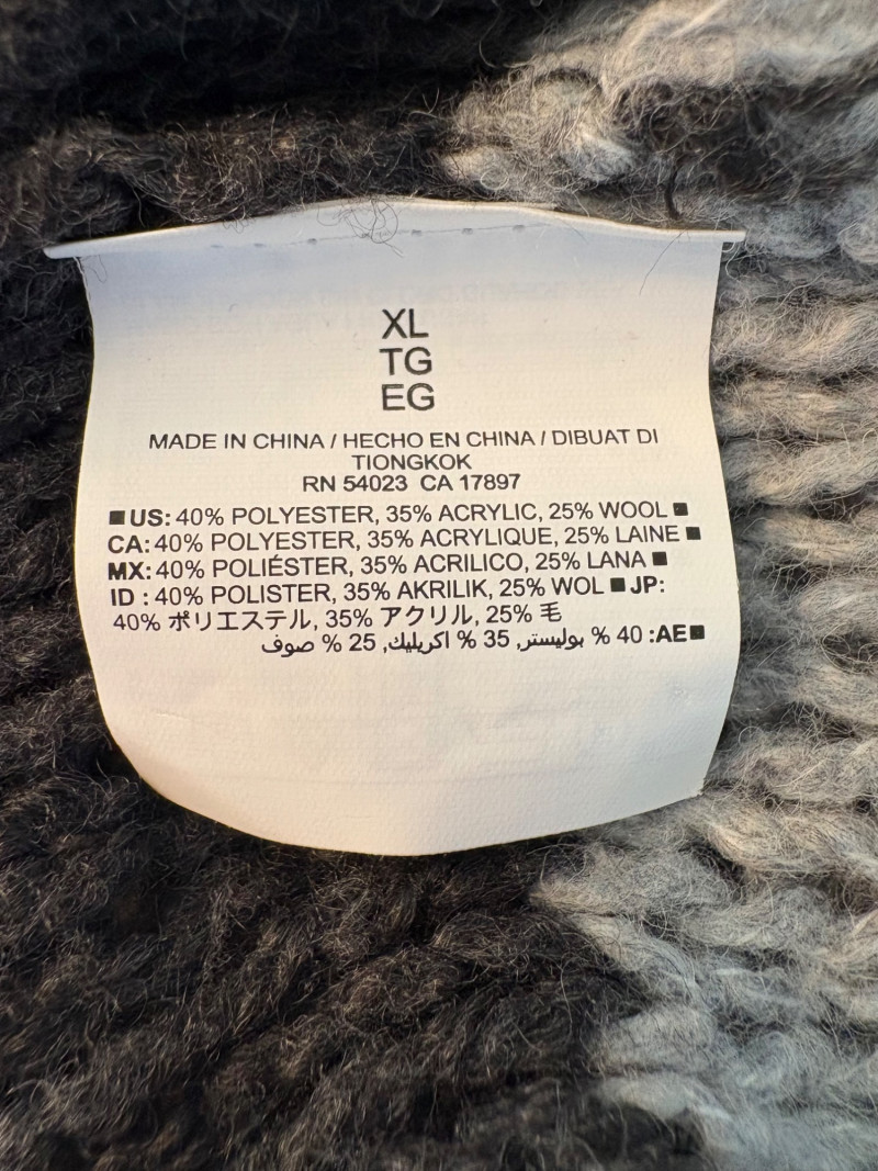 Combination lot of sweaters and a comfortable shirt. All pieces measure between 29" and 31” pit to pit, so these are larger than many other pieces in this auction. Variegated beige/brown sweater from Eileen Fisher has elbow length sleeves and ribbing at neckline & sleeve ends. 100% linen. Size tag says XL. Note - naturally occurring slubs in linen often pill - a date with your sweater shaver will make this look new again. Beige oversize sweater from D&Co. has V-neck, ribbed sleeves with dropped shoulder seams, angled front patch pockets, and curved back hem that is longer than front. Acrylic. Size tag says XL, but we think it is more generous. Old Navy striped sweater has curved neckline, dropped shoulder seams, and ribbing at cuffs and lower hem. Stripes are variable shades of brown, gray, and cream in a loose weave. Polyester/acrylic/wool blend. Size tag says XL. Clara Sun Woo red and black super stretchy casual shirt with dropped shoulder seams, short sleeves, curved neckline, and shark bite hem. Polyester/rayon/spandex blend. Size tag says XL.