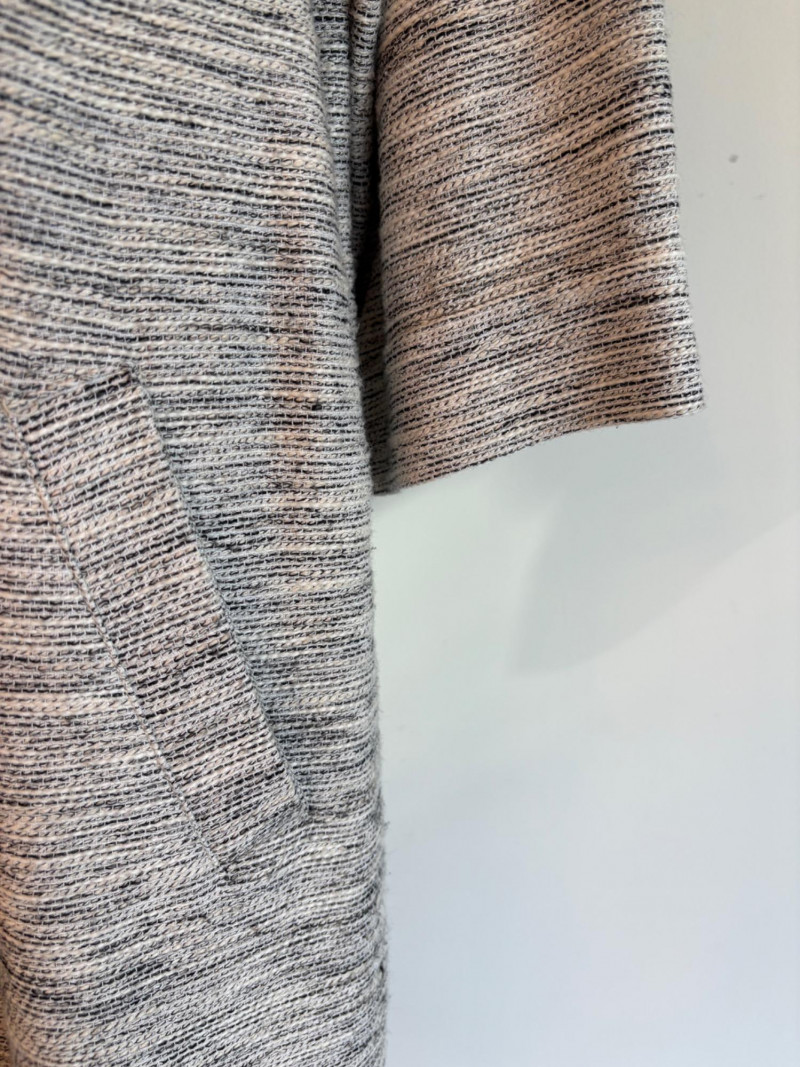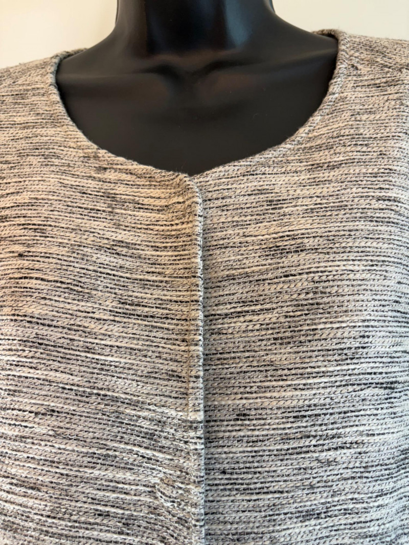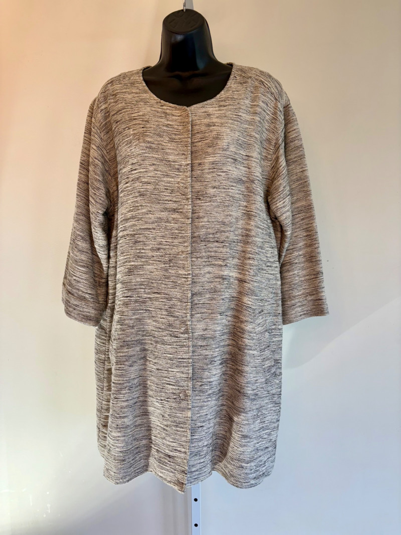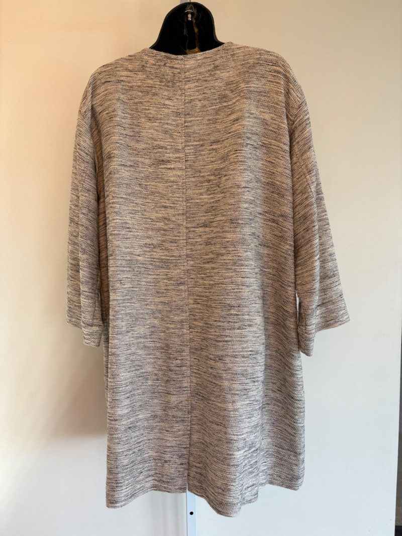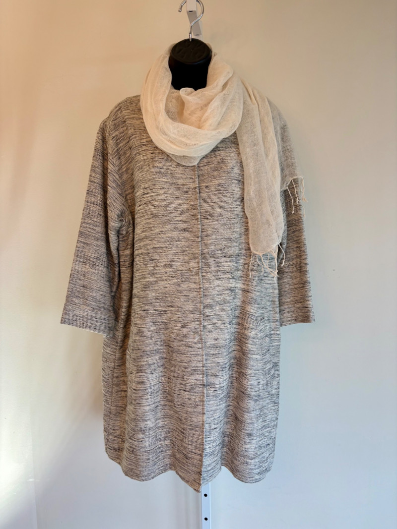 Sleek minimalist coat & scarf from Eileen Fisher. This jacket fabric is terrific - variegated cream, light/dark grey, and black threads make an otherwise minimalist coat "pop". Coat has curved neckline, hidden snap front closure, welted slash pockets, cuffed sleeves, and back vent with bound seam finishing inside. Cotton/polyester blend. Measures 24" pit to pit and 34" from back neckline to hem. Size tag says XL. Paired with creamy white 100% linen scarf in a loose weave from Poetry. Measures approximately 23" x 72" with fringe on the short edges.