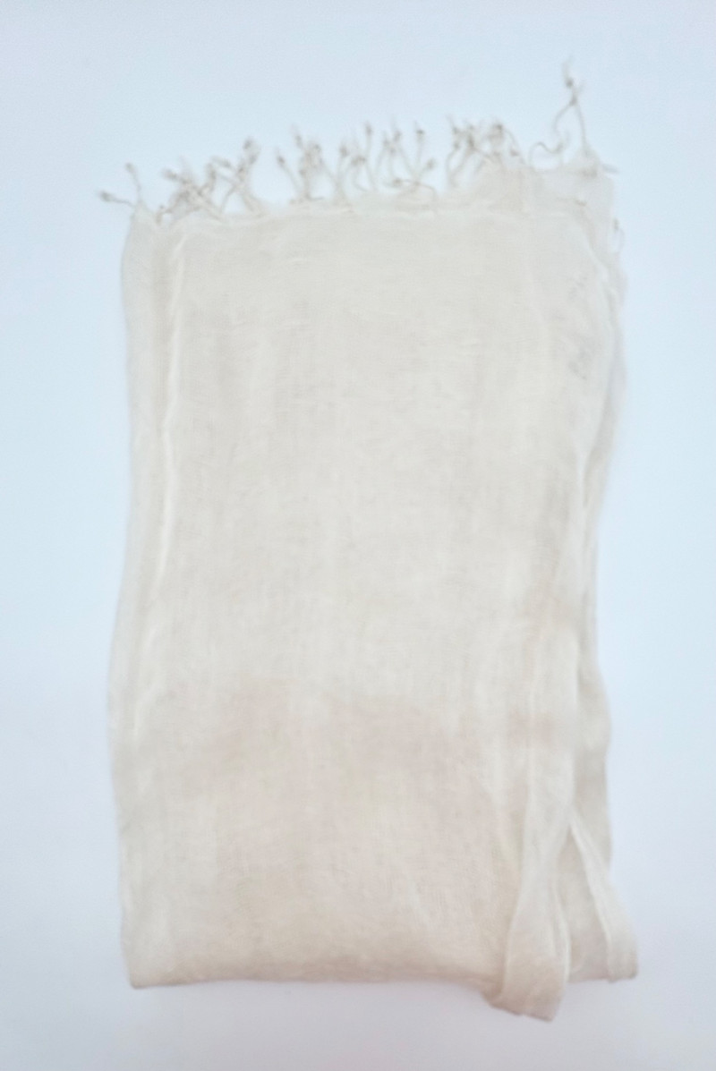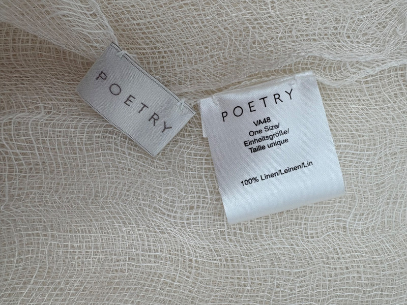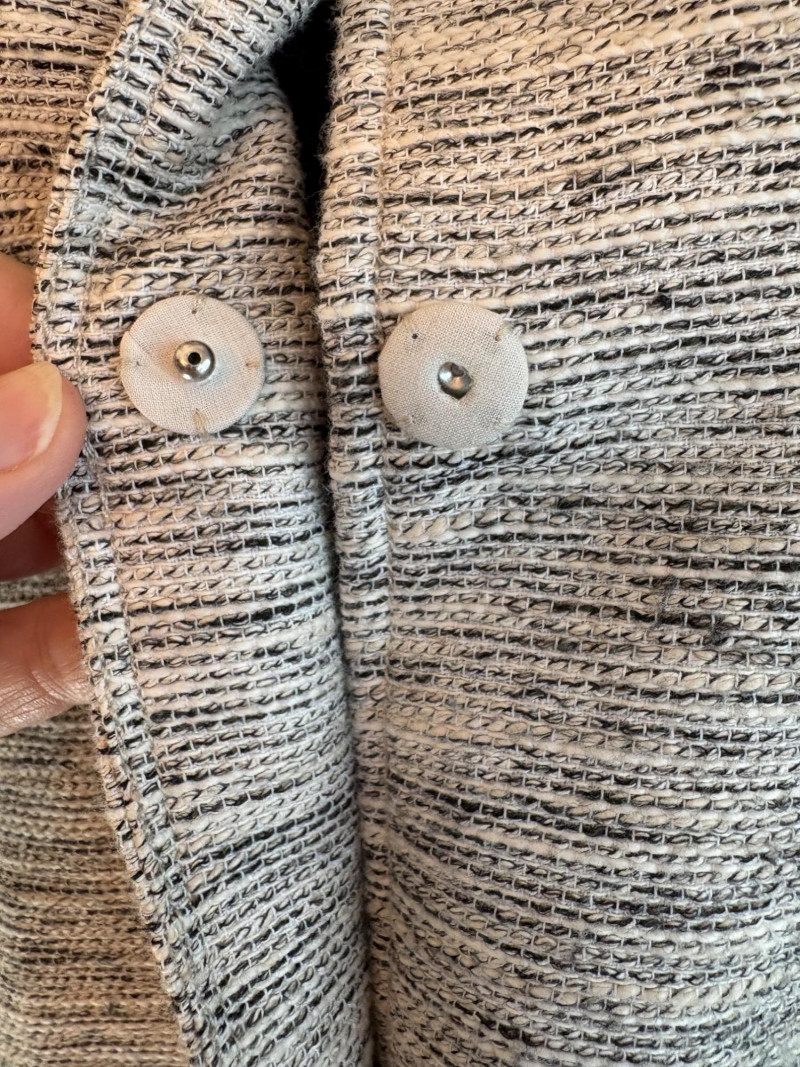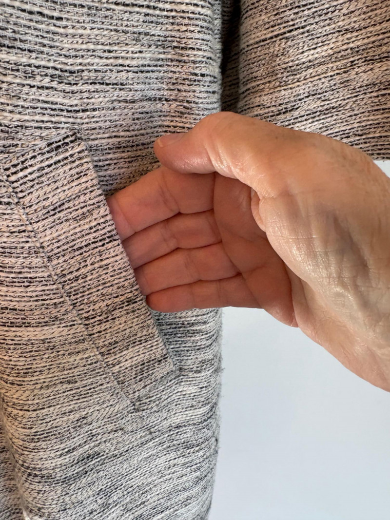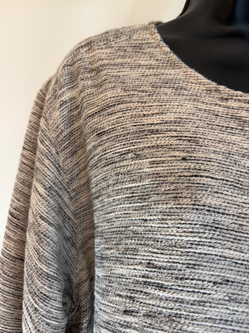 Sleek minimalist coat & scarf from Eileen Fisher. This jacket fabric is terrific - variegated cream, light/dark grey, and black threads make an otherwise minimalist coat "pop". Coat has curved neckline, hidden snap front closure, welted slash pockets, cuffed sleeves, and back vent with bound seam finishing inside. Cotton/polyester blend. Measures 24" pit to pit and 34" from back neckline to hem. Size tag says XL. Paired with creamy white 100% linen scarf in a loose weave from Poetry. Measures approximately 23" x 72" with fringe on the short edges.