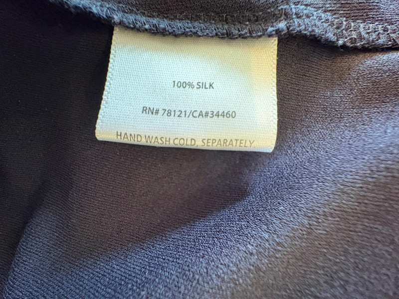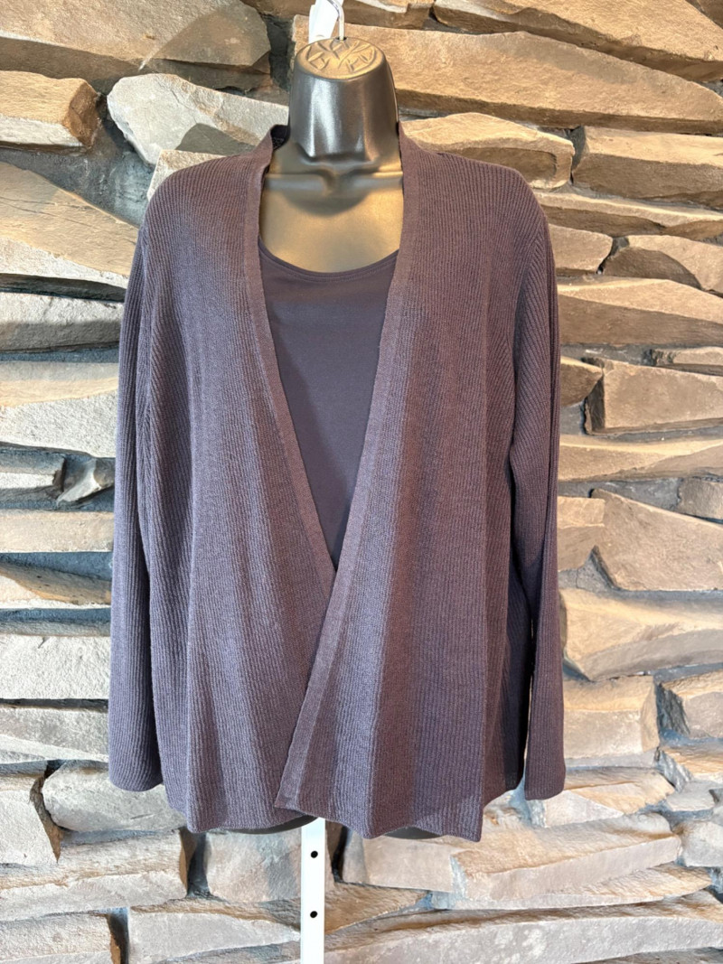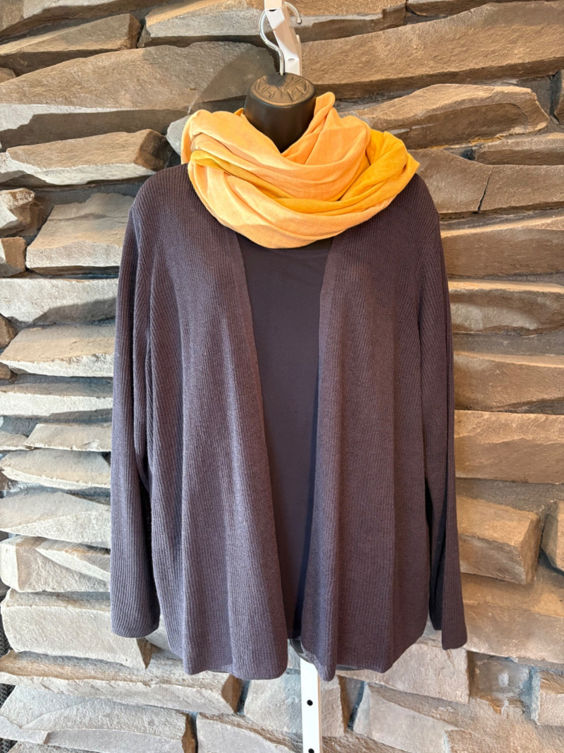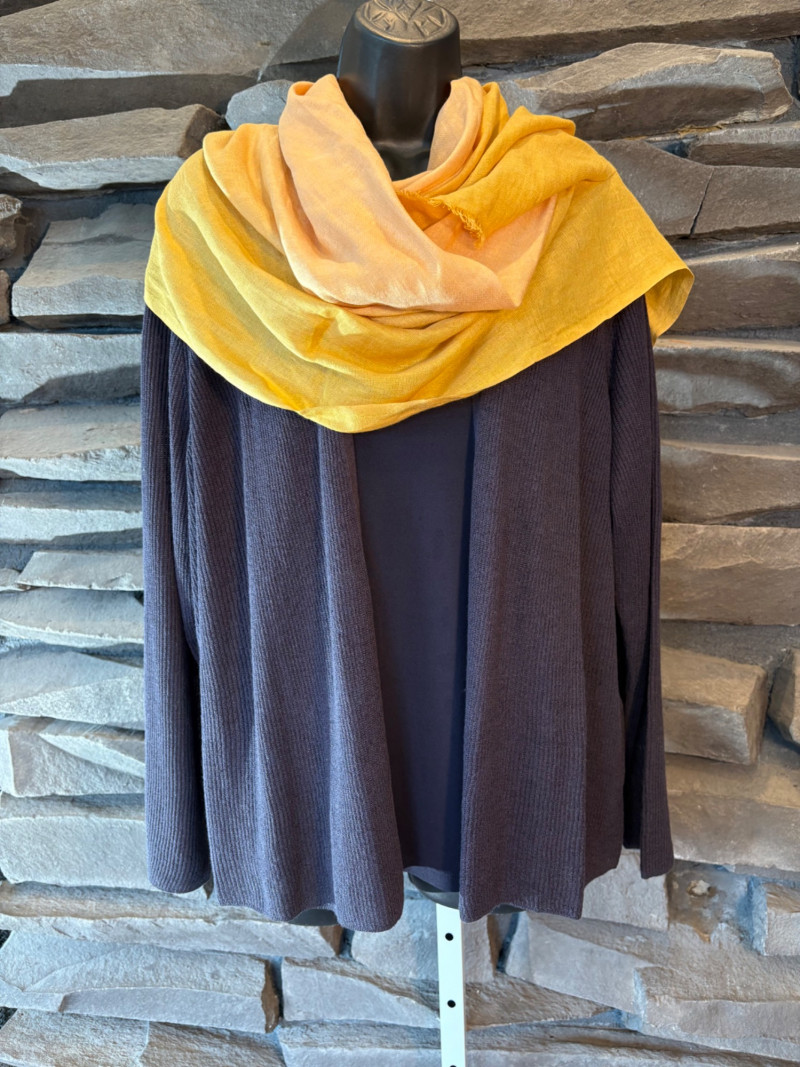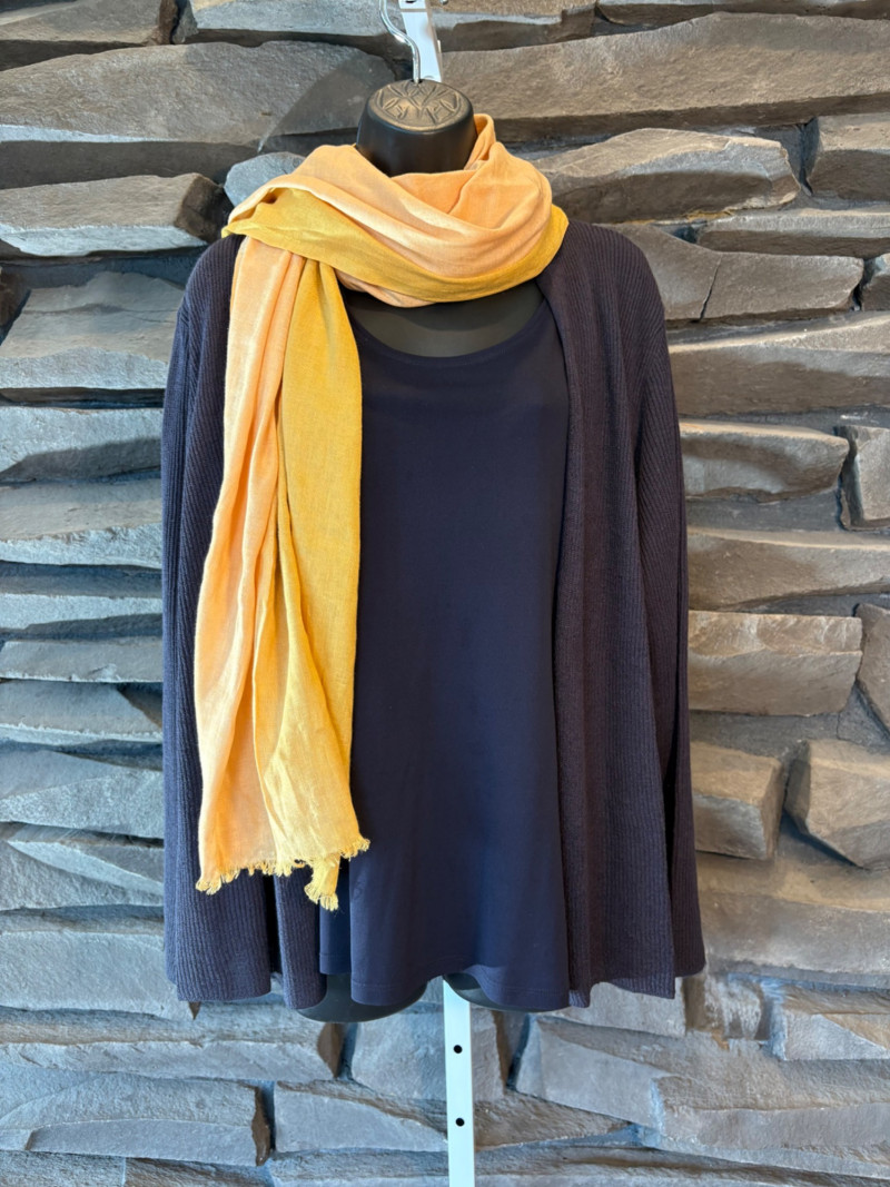 Great separates from Eileen Fisher. Deep midnight blue knit silk shell is very light in weight. 100% silk. Measures 20" pit to pit and 25" from back neckline to hem. Size tag says L. Deep midnight blue lightweight sweater has vertical rib pattern, long sleeves, and an open front. New with tag. About as minimal as it gets! Organic linen/organic cotton blend. Measures 25" pit to pit. Size tag says 2X, but we think it's not quite that generous. Paired with golden yellow scarf with slight ombre effect & fringe on short ends. Measures approximately 25" x 74". No maker or fabric tag, but feels like super fine cotton.