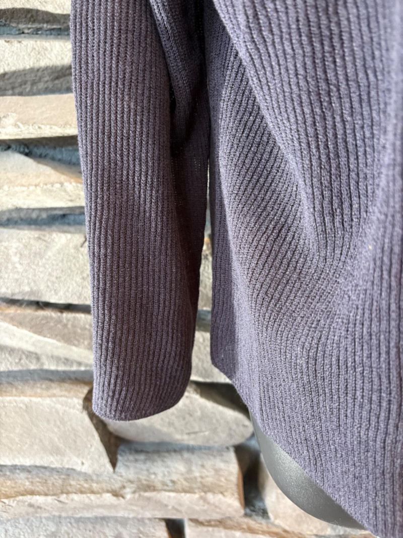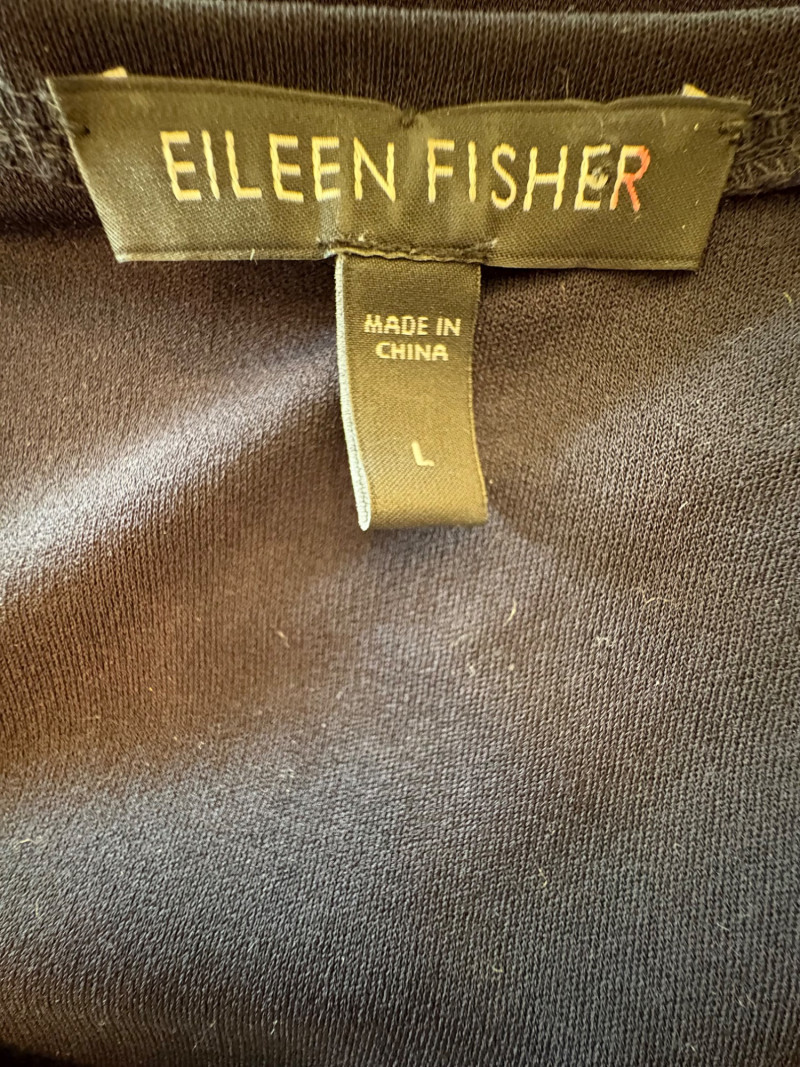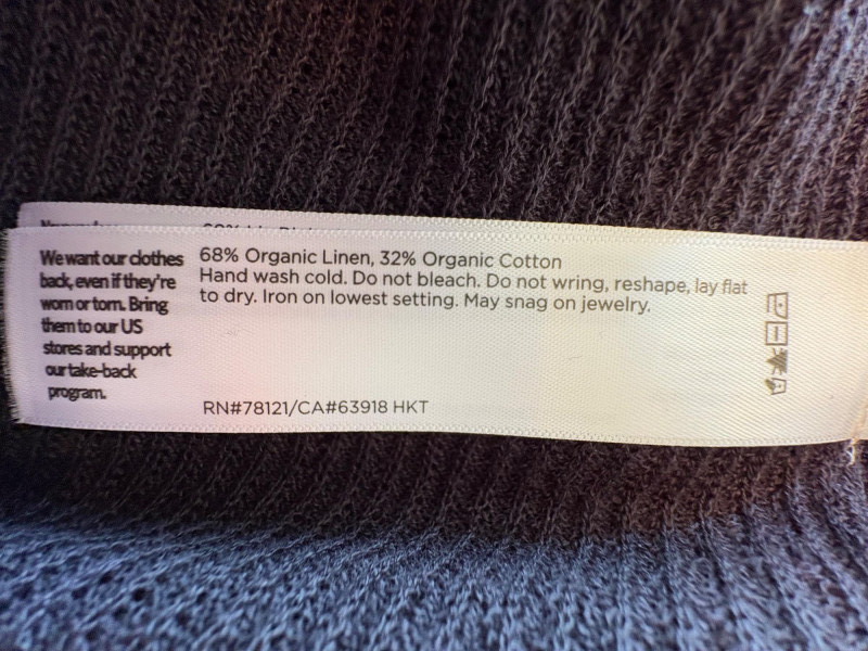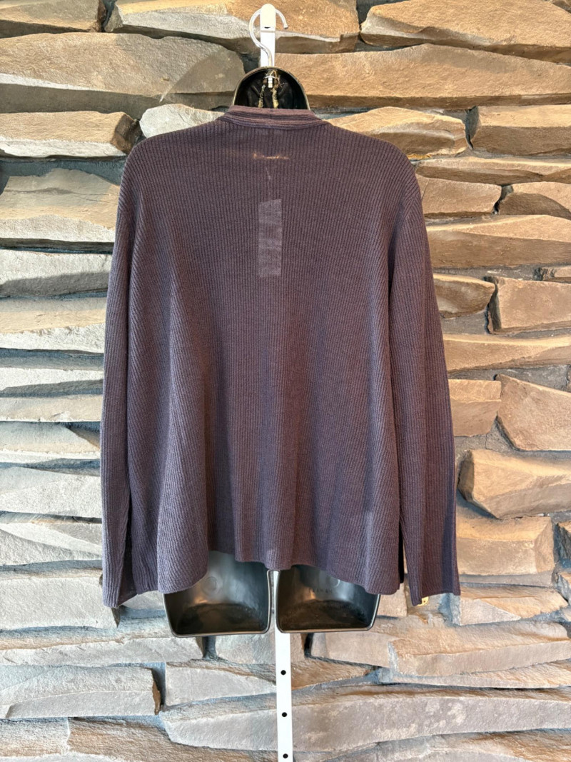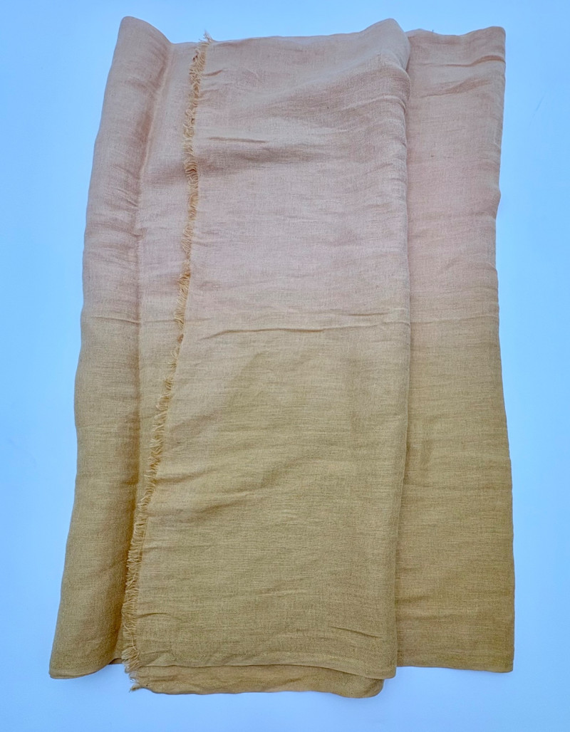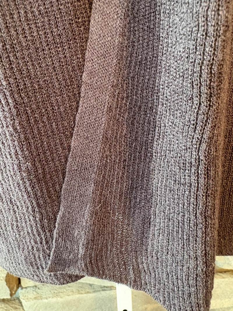 Great separates from Eileen Fisher. Deep midnight blue knit silk shell is very light in weight. 100% silk. Measures 20" pit to pit and 25" from back neckline to hem. Size tag says L. Deep midnight blue lightweight sweater has vertical rib pattern, long sleeves, and an open front. New with tag. About as minimal as it gets! Organic linen/organic cotton blend. Measures 25" pit to pit. Size tag says 2X, but we think it's not quite that generous. Paired with golden yellow scarf with slight ombre effect & fringe on short ends. Measures approximately 25" x 74". No maker or fabric tag, but feels like super fine cotton.