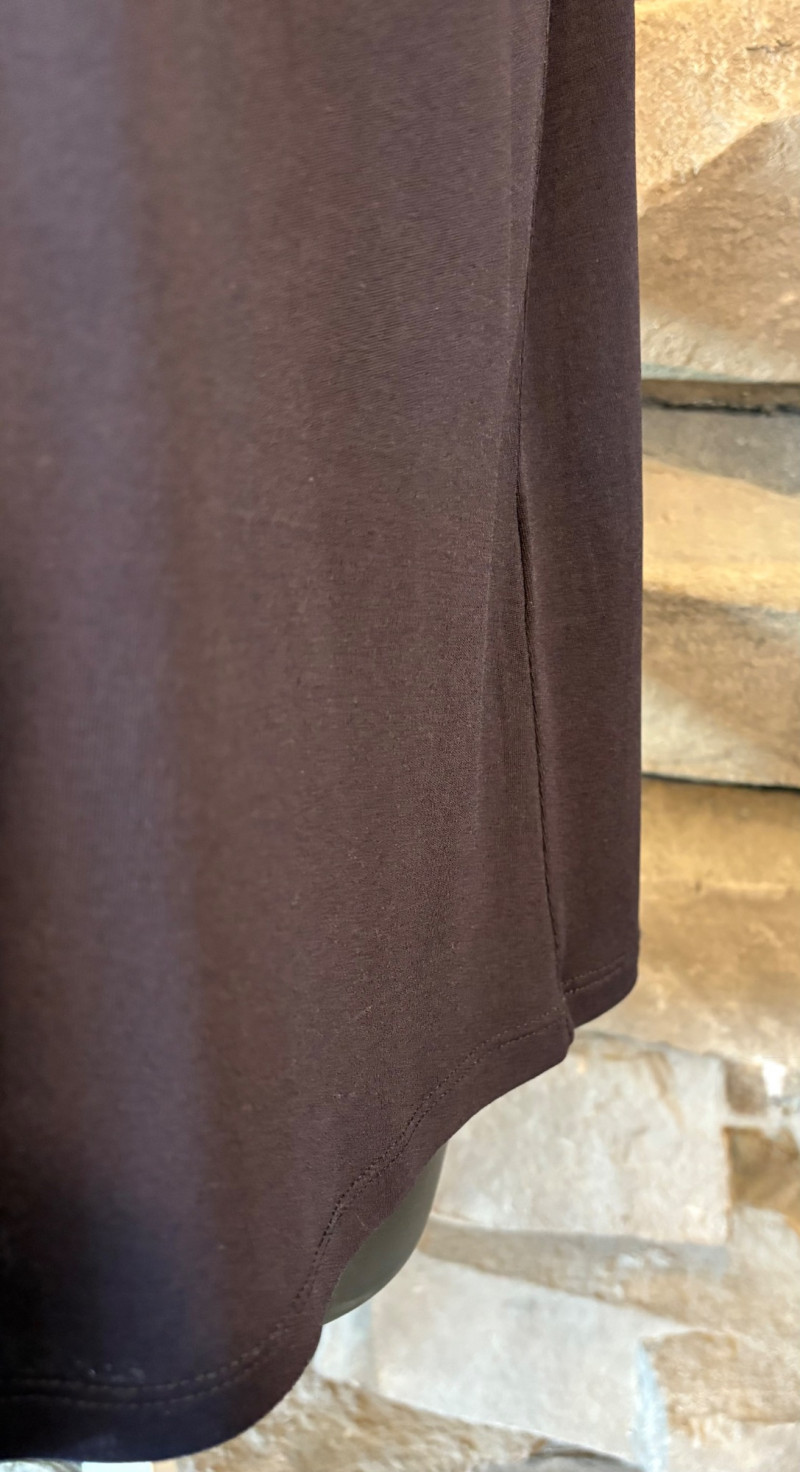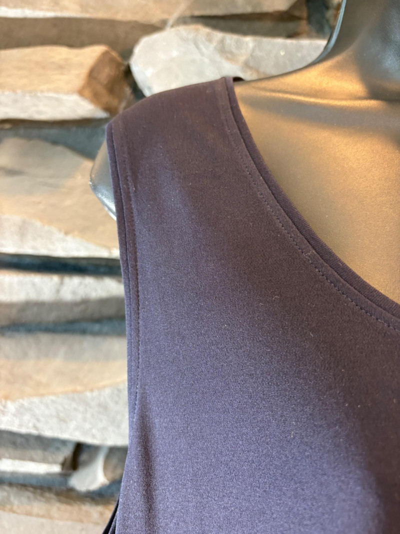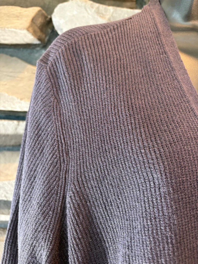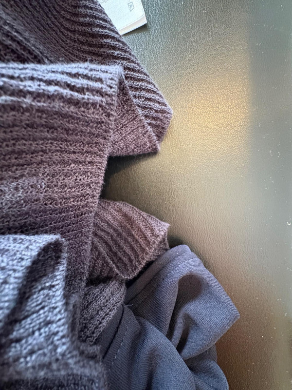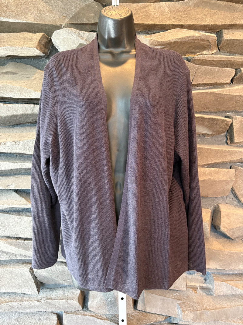 Great separates from Eileen Fisher. Deep midnight blue knit silk shell is very light in weight. 100% silk. Measures 20" pit to pit and 25" from back neckline to hem. Size tag says L. Deep midnight blue lightweight sweater has vertical rib pattern, long sleeves, and an open front. New with tag. About as minimal as it gets! Organic linen/organic cotton blend. Measures 25" pit to pit. Size tag says 2X, but we think it's not quite that generous. Paired with golden yellow scarf with slight ombre effect & fringe on short ends. Measures approximately 25" x 74". No maker or fabric tag, but feels like super fine cotton.