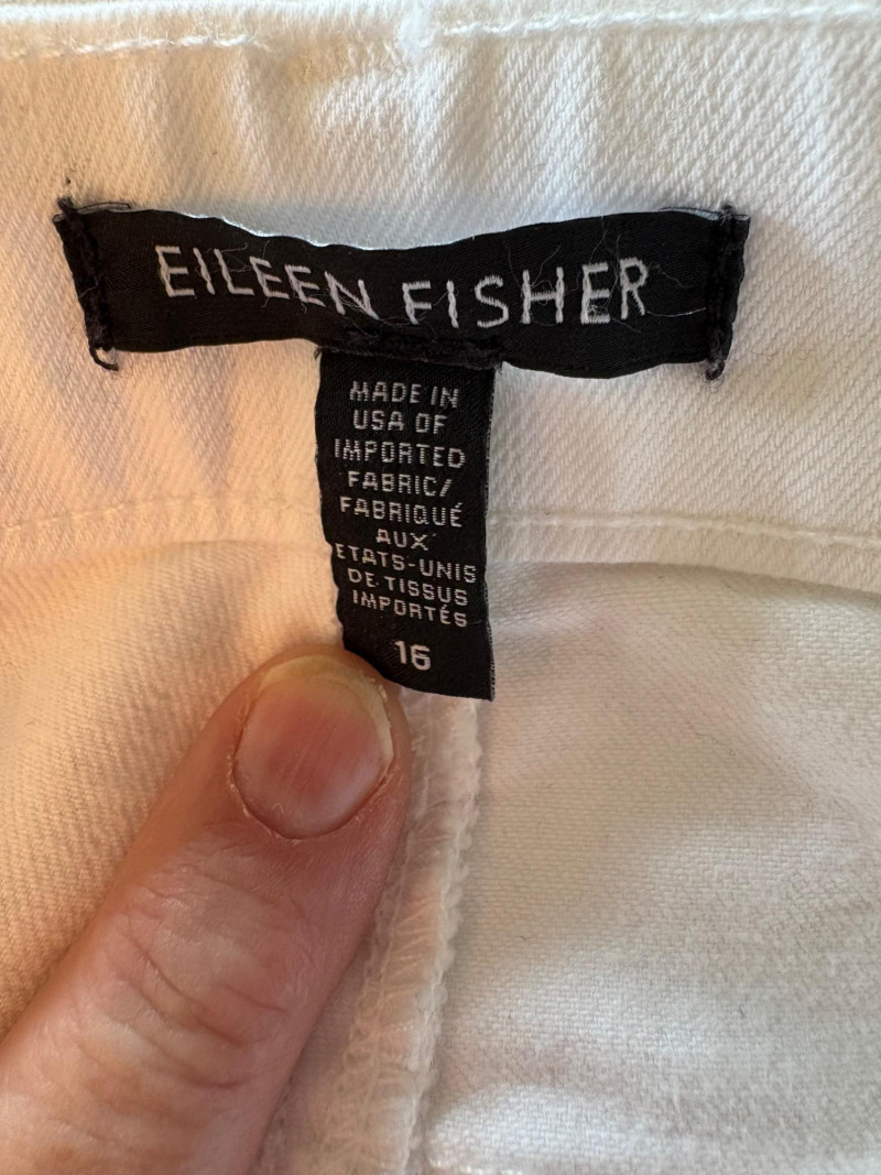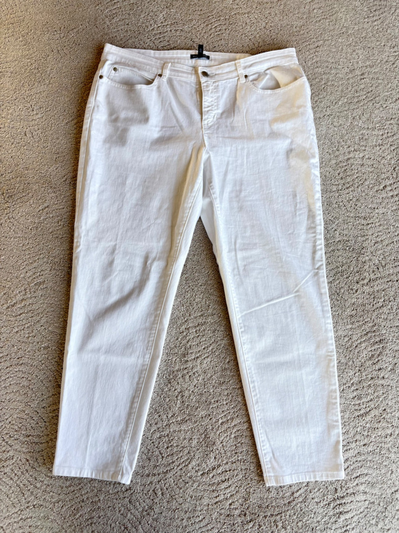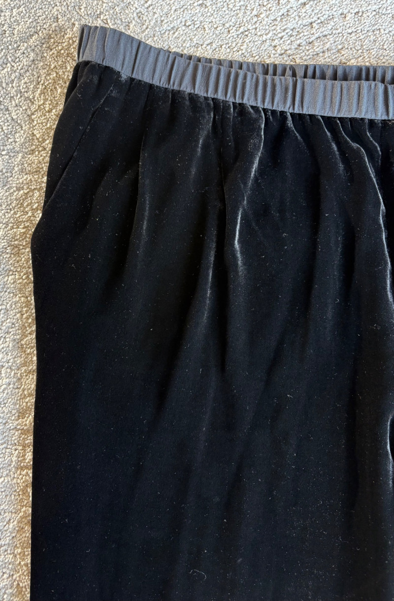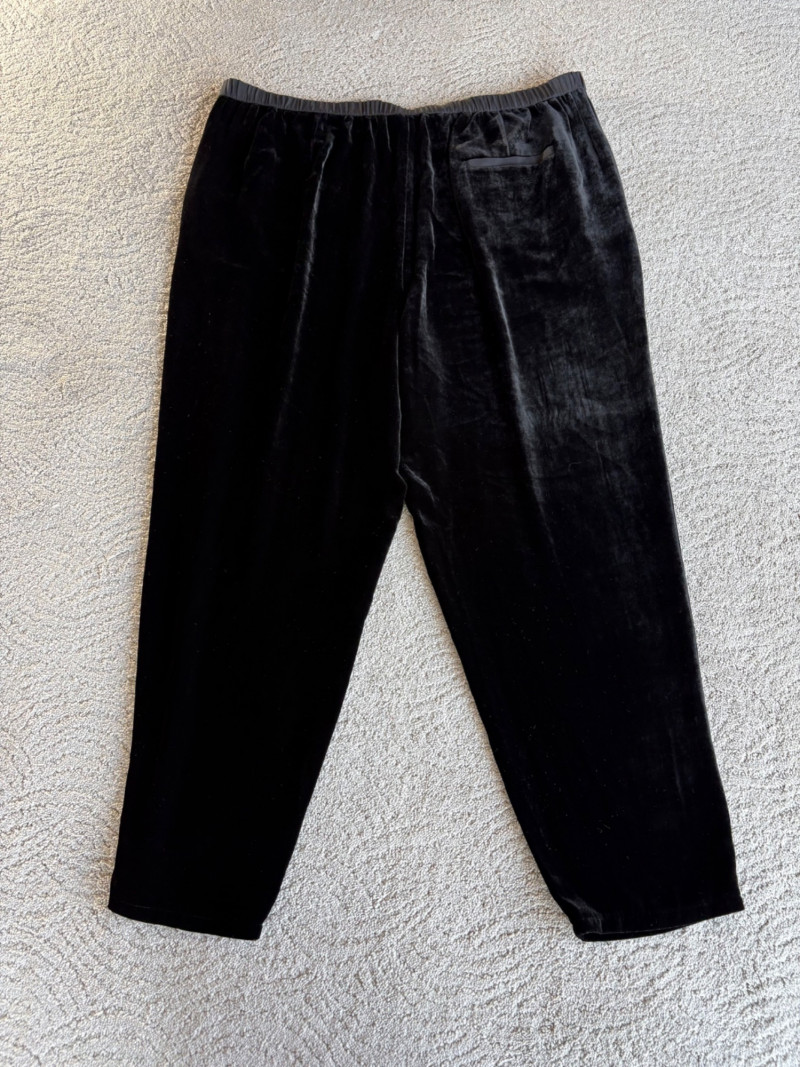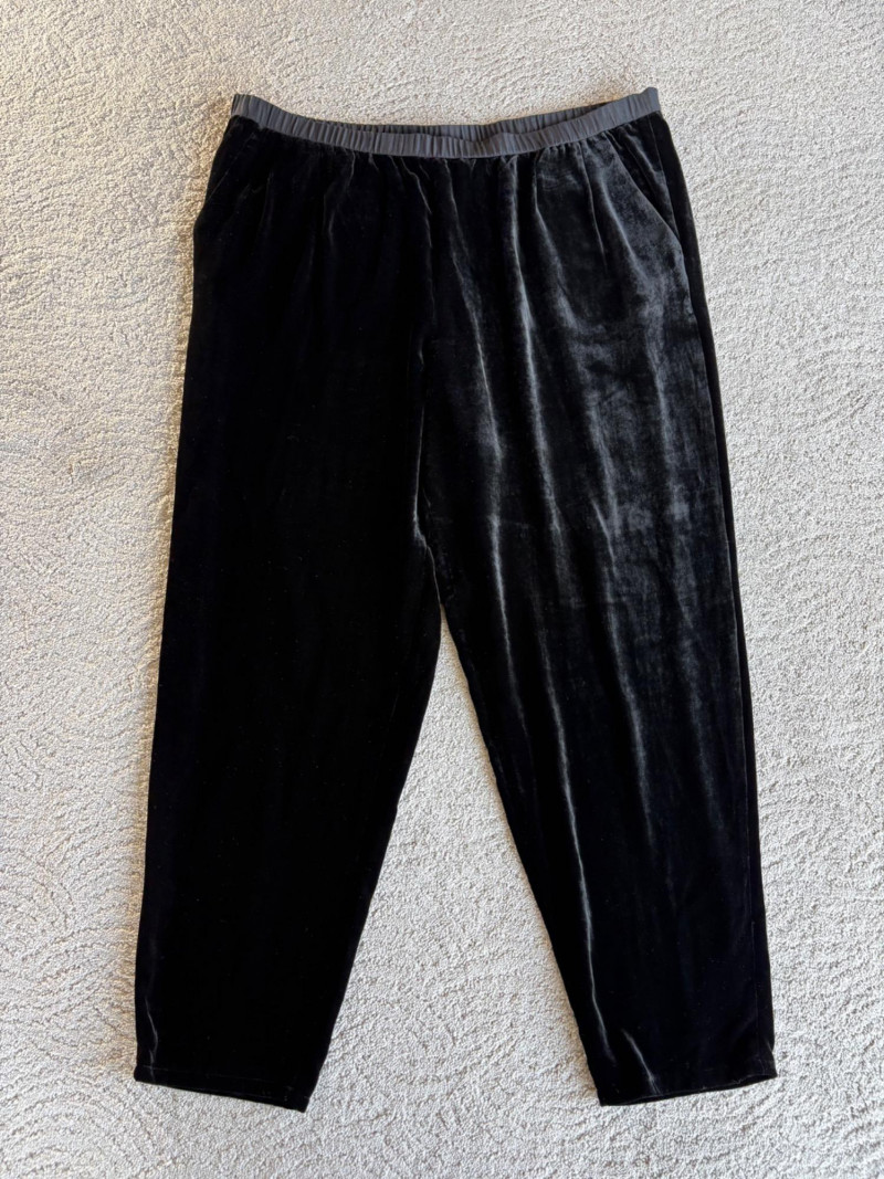 3 pairs of pants for very different occasions from Eileen Fisher. All measure 19" side to side at waist. Black velvet pants have elasticated satin waistband and satin welted back right pocket in addition to set-in front pockets with a tapered leg. Rayon/silk blend. Size tag says XL. Note that the velvet is in fine condition - there is no wear on the fabric as some of the photos seems to show given our poor lighting! Brown-green woven wool pants have elasticated flat waist band, front pleats, in-seam side pockets, back darts, and wide legs with a slight lantern shape. 100% wool. Size tag says XL. White pants have classic five pocket jeans styling with tapered leg. Cotton/spandex blend. Size tag says 16.