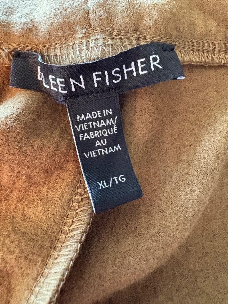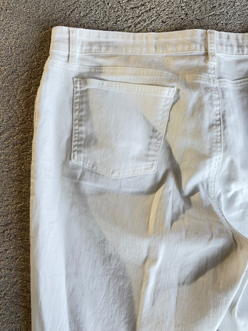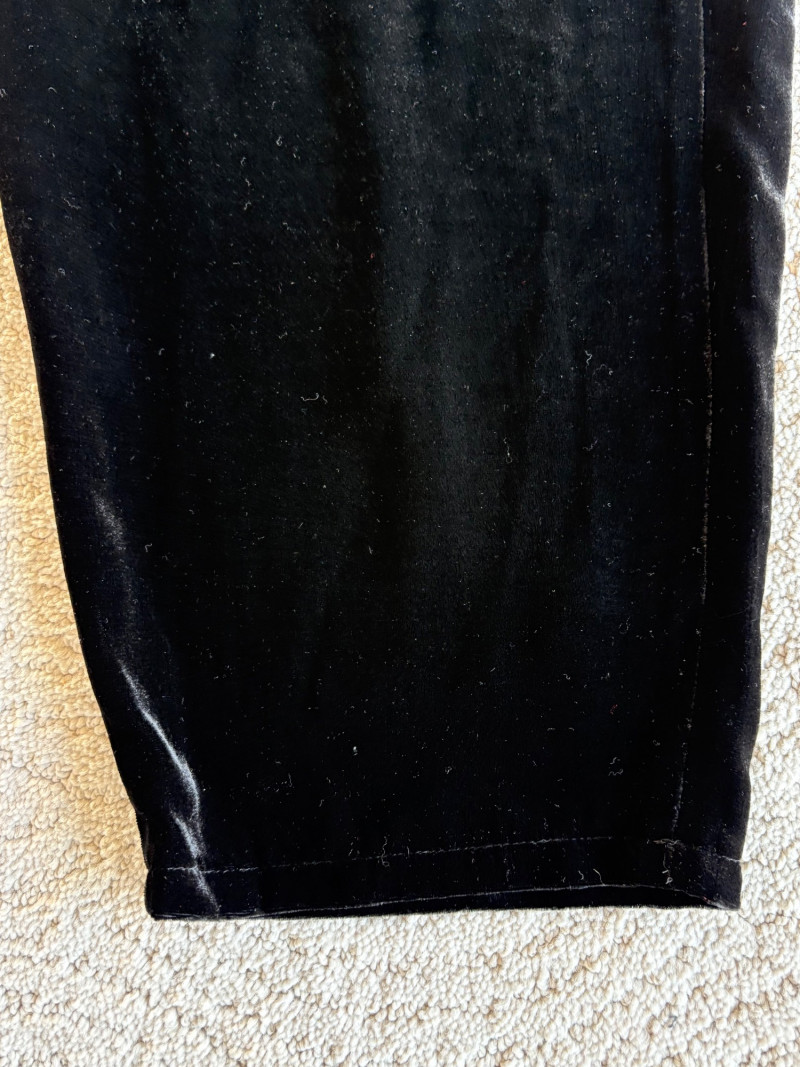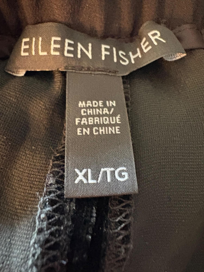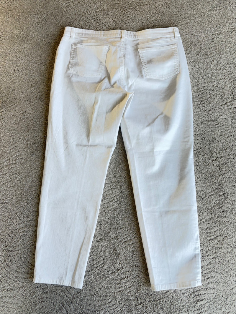 3 pairs of pants for very different occasions from Eileen Fisher. All measure 19" side to side at waist. Black velvet pants have elasticated satin waistband and satin welted back right pocket in addition to set-in front pockets with a tapered leg. Rayon/silk blend. Size tag says XL. Note that the velvet is in fine condition - there is no wear on the fabric as some of the photos seems to show given our poor lighting! Brown-green woven wool pants have elasticated flat waist band, front pleats, in-seam side pockets, back darts, and wide legs with a slight lantern shape. 100% wool. Size tag says XL. White pants have classic five pocket jeans styling with tapered leg. Cotton/spandex blend. Size tag says 16.