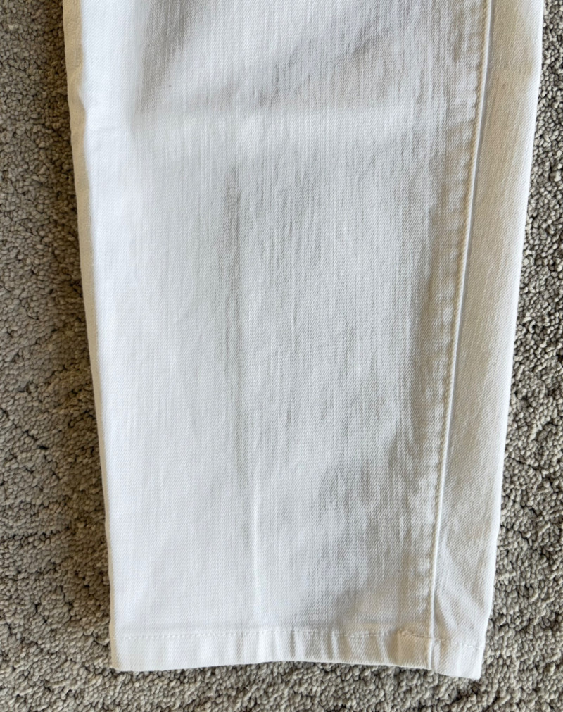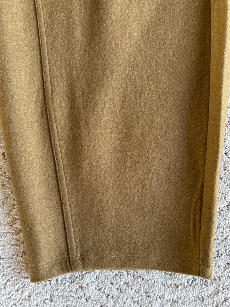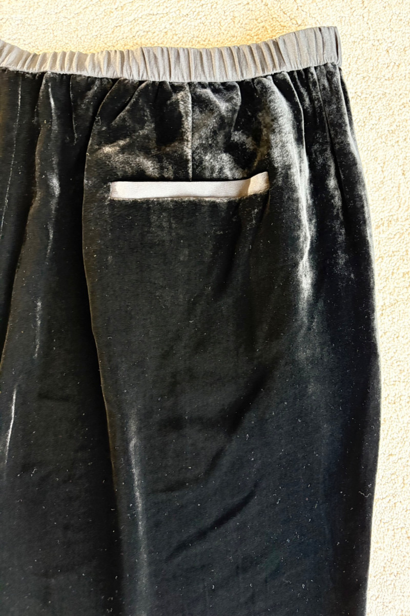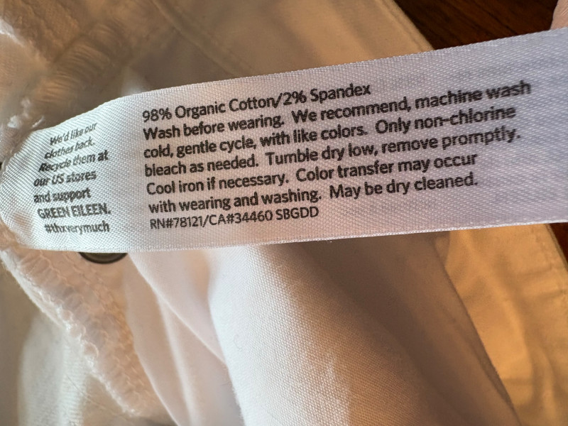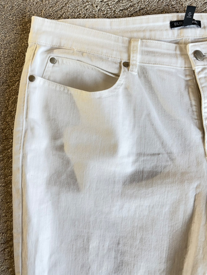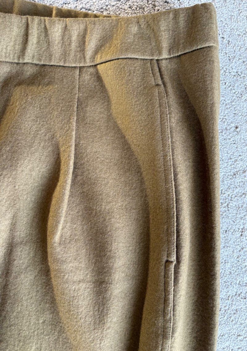 3 pairs of pants for very different occasions from Eileen Fisher. All measure 19" side to side at waist. Black velvet pants have elasticated satin waistband and satin welted back right pocket in addition to set-in front pockets with a tapered leg. Rayon/silk blend. Size tag says XL. Note that the velvet is in fine condition - there is no wear on the fabric as some of the photos seems to show given our poor lighting! Brown-green woven wool pants have elasticated flat waist band, front pleats, in-seam side pockets, back darts, and wide legs with a slight lantern shape. 100% wool. Size tag says XL. White pants have classic five pocket jeans styling with tapered leg. Cotton/spandex blend. Size tag says 16.