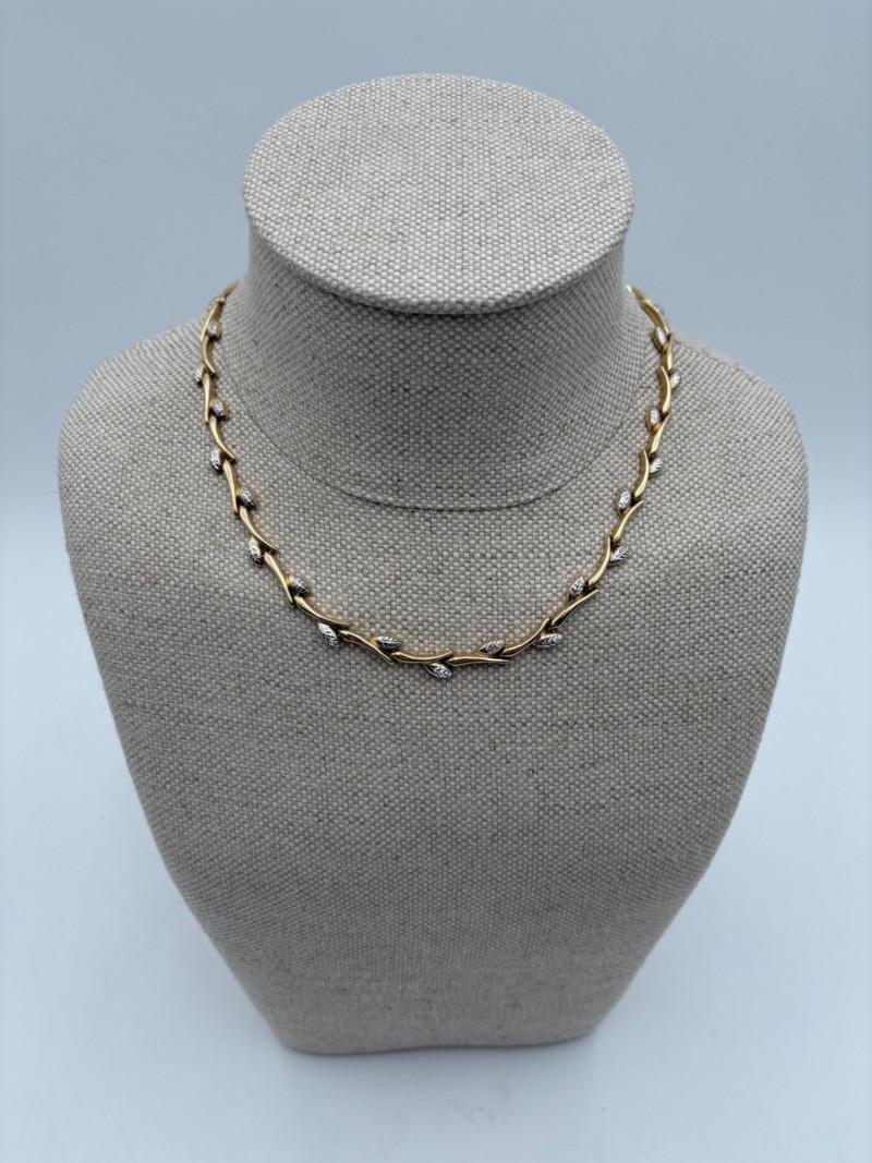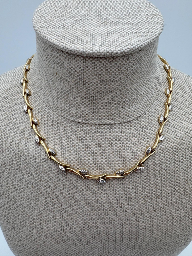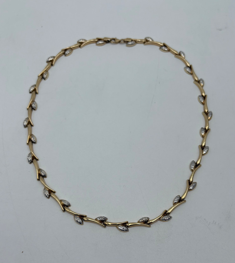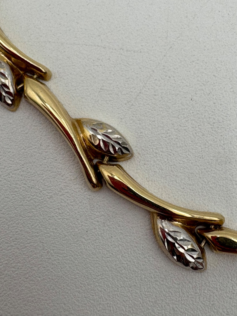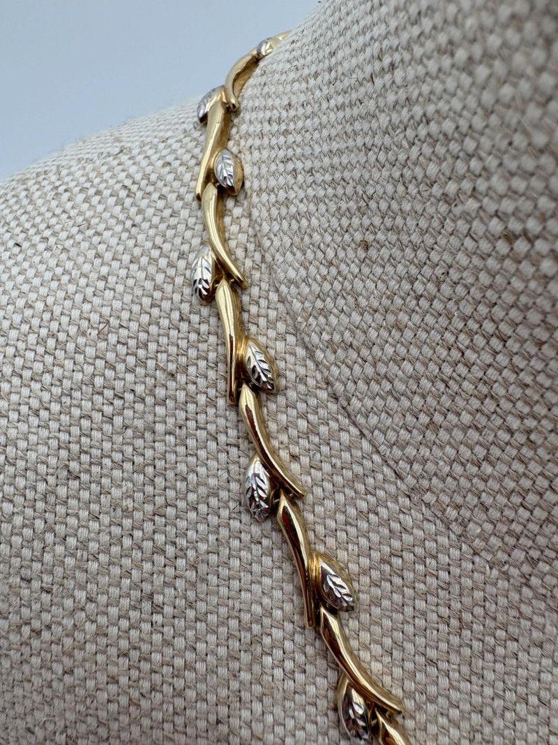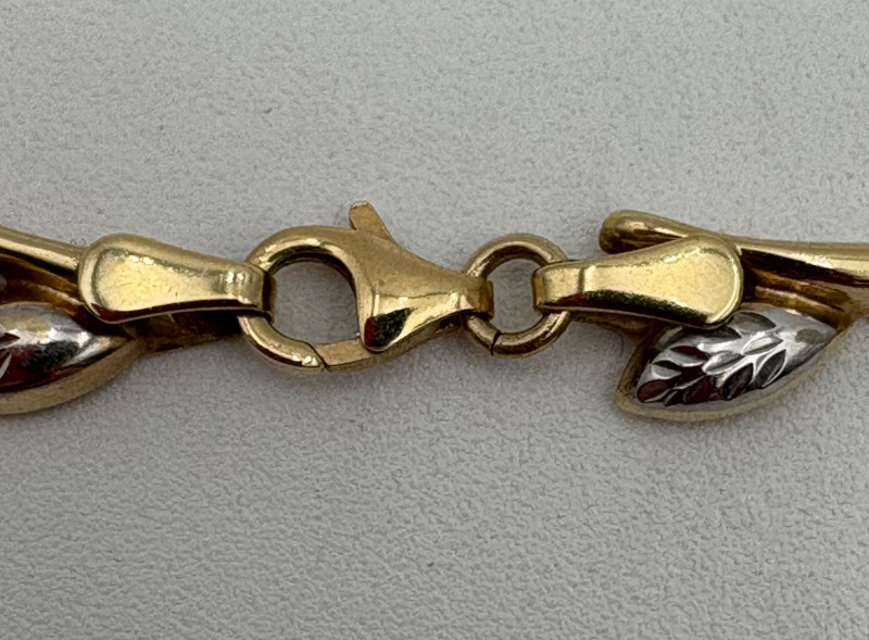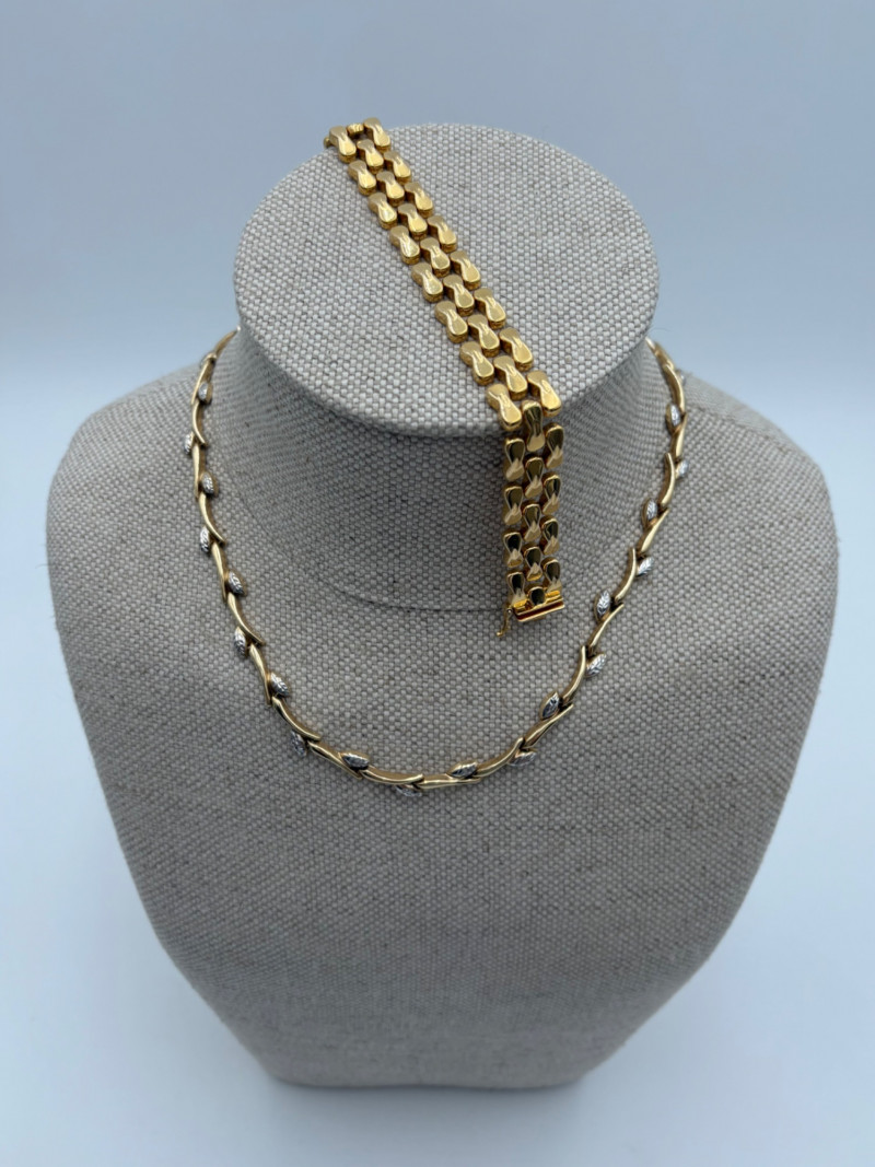2 lovely pieces of jewelry. Necklace has delicate leaf pattern and measures 17" L. The small cuts in the leaf pattern give the illusion of sparkly stones at a distance. Marked "AK 10K" and "Turkey" near clasp. Bracelet has interlocking links and a slide closure with wire post clasp. Measures 7.75" L. Marked "ITAOR Italy .925" on clasp.
