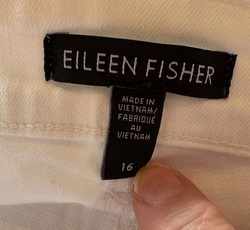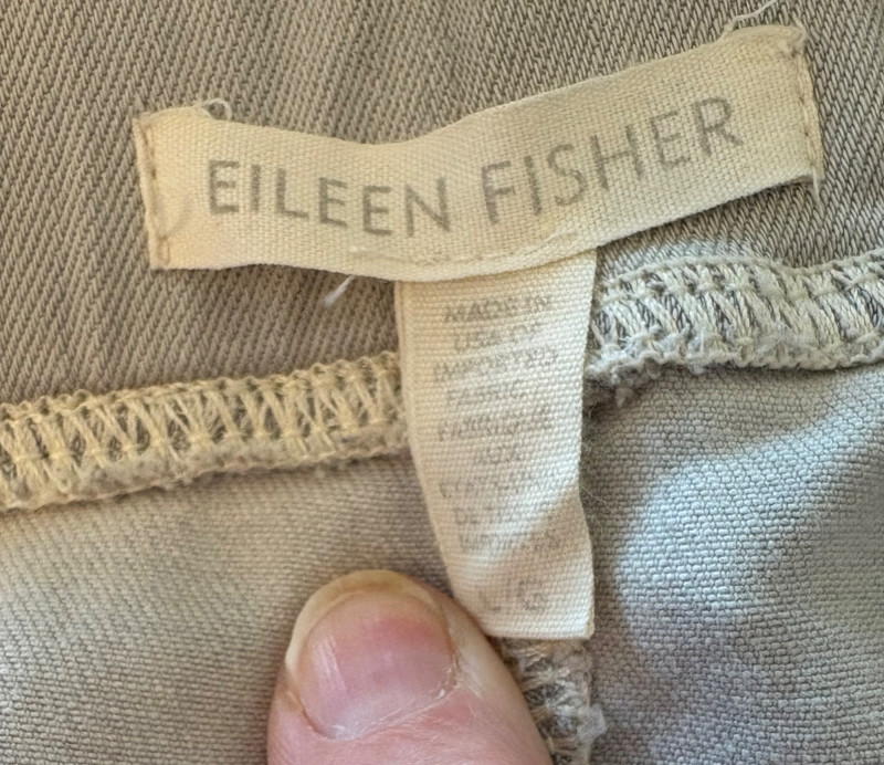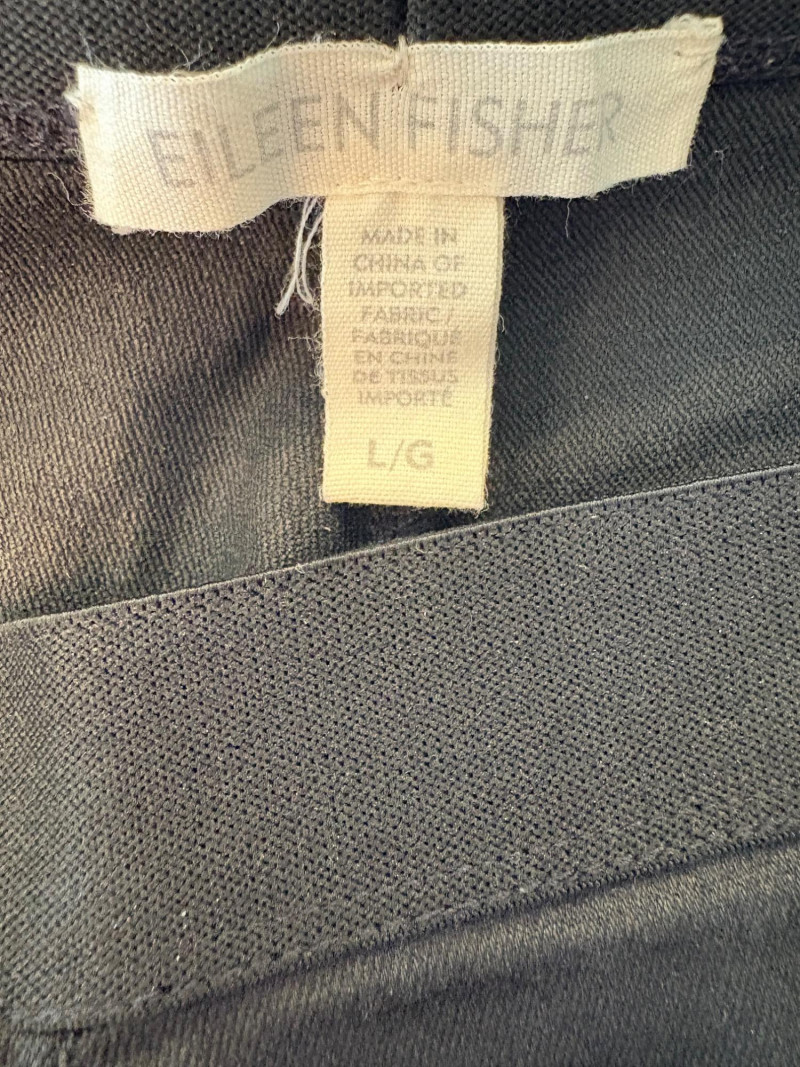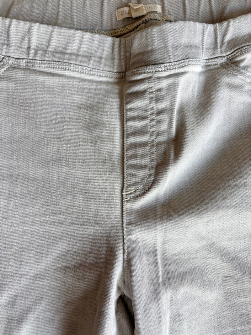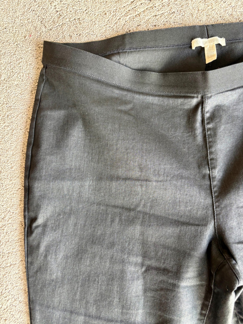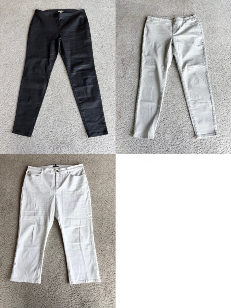 3 terrific pairs of neutral pants from Eileen Fisher. All measure 18.5" side to side at waist. Black slightly iridescent pair have black elastic waistband and no detailing - great for under an oversized top. Organic cotton/polyester/lycra blend. Size tag says L. Pearl grey pants have flat elastic waistband, faux fly, faux front pockets, back patch pockets, and tapered leg. Organic cotton/polyester/spandex blend. Size tag says L. White pants appear to be slightly cropped and have classic 5-pocket jeans styling with straight legs. Organic cotton/spandex. Size tag says 16.
