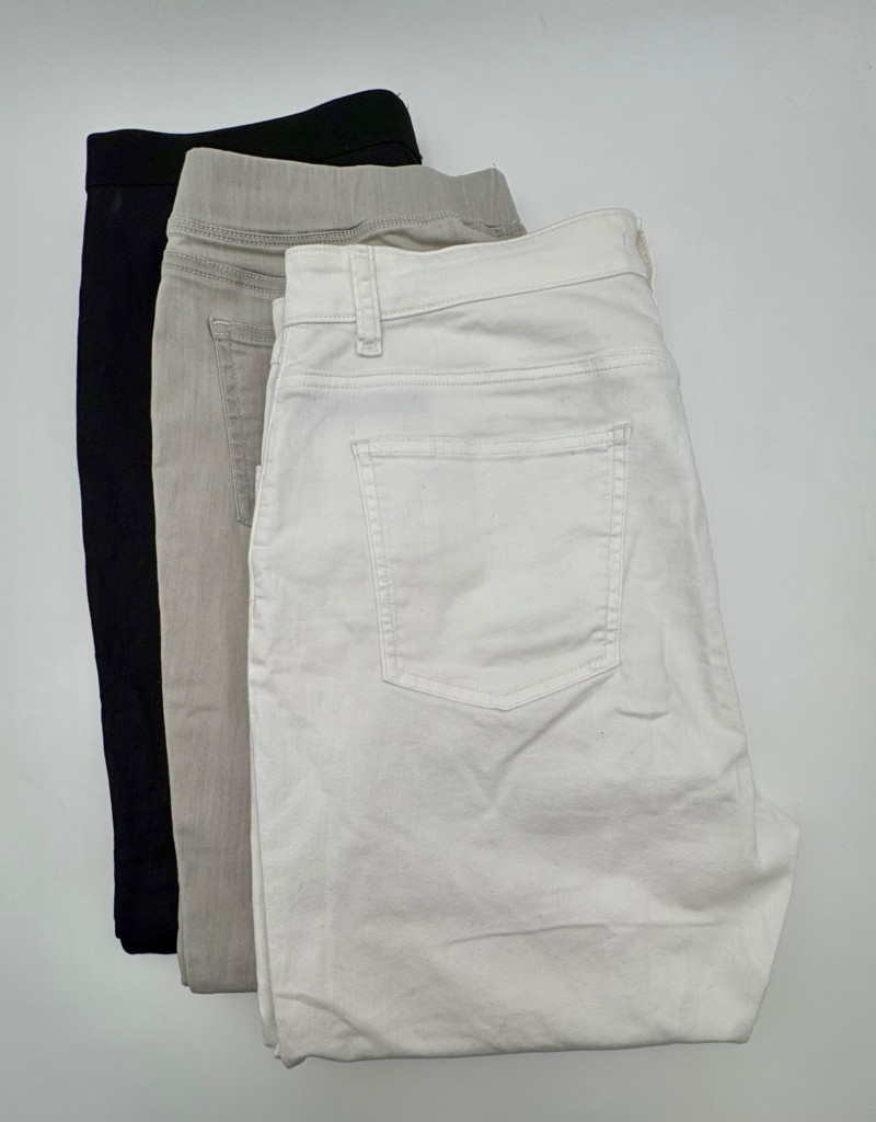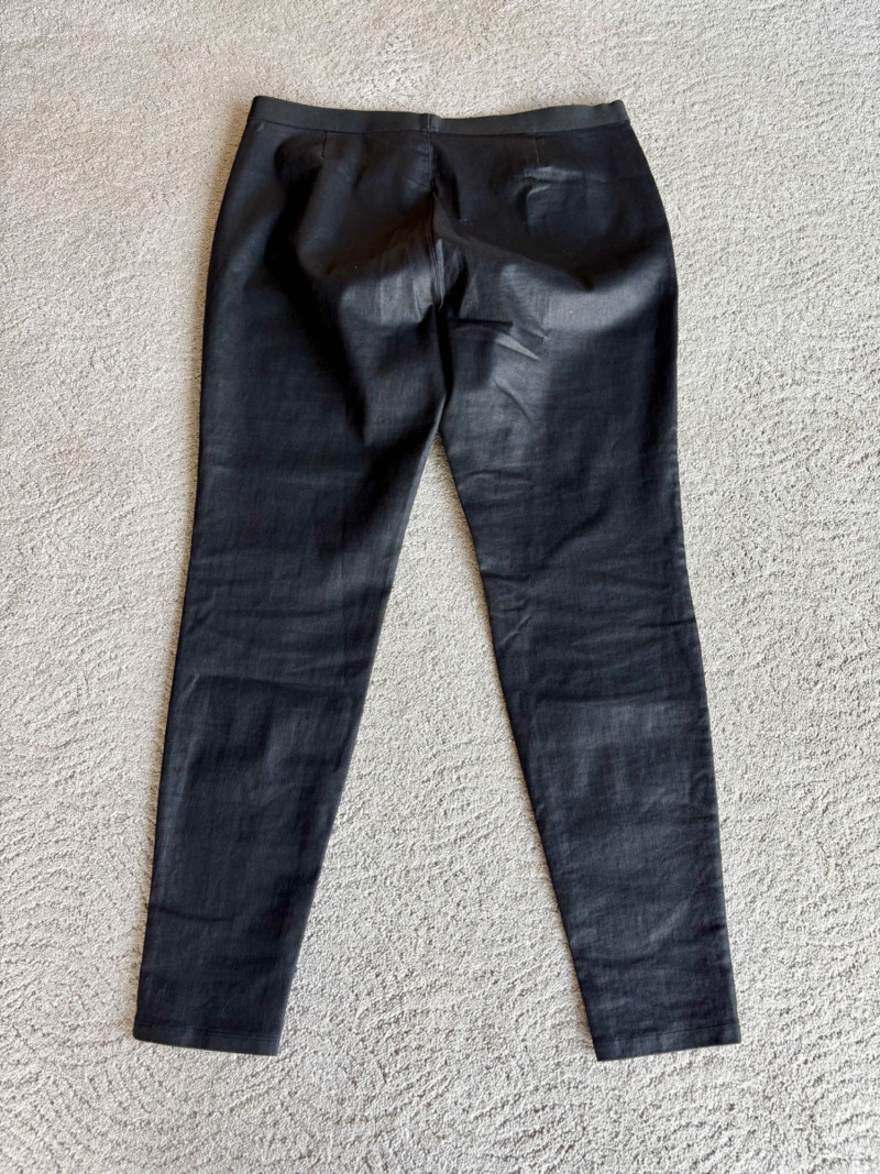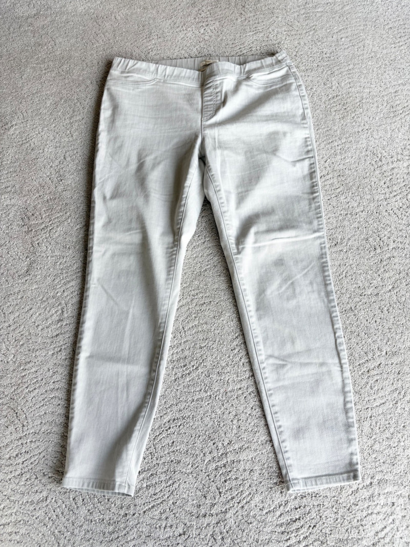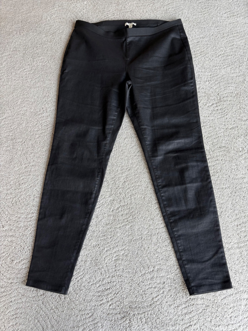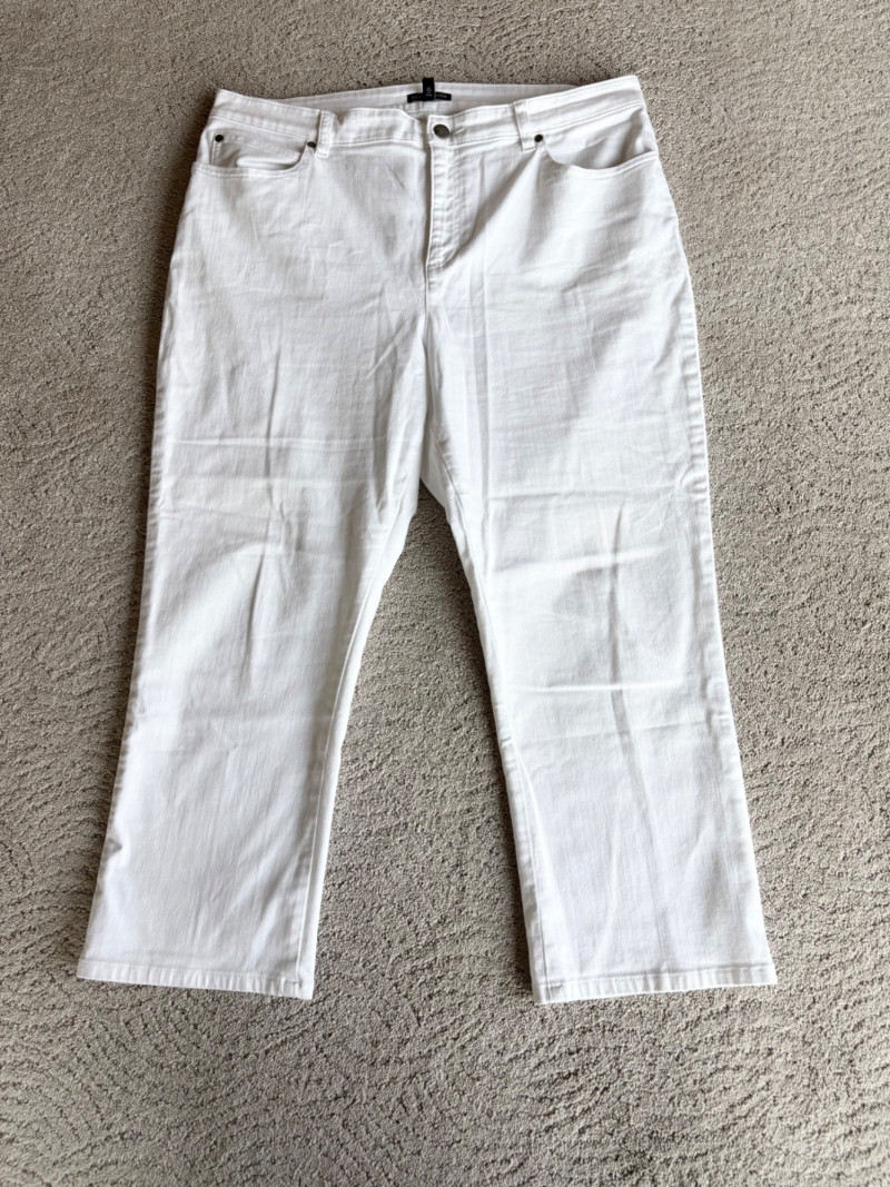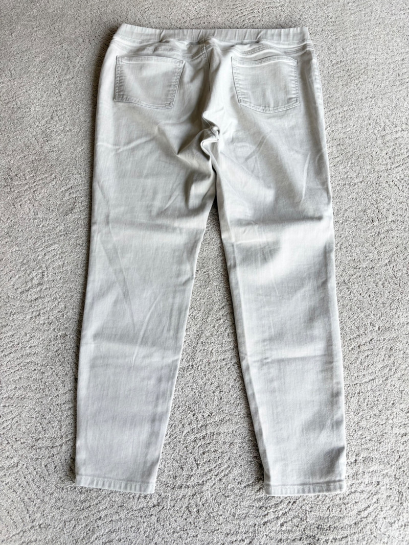 3 terrific pairs of neutral pants from Eileen Fisher. All measure 18.5" side to side at waist. Black slightly iridescent pair have black elastic waistband and no detailing - great for under an oversized top. Organic cotton/polyester/lycra blend. Size tag says L. Pearl grey pants have flat elastic waistband, faux fly, faux front pockets, back patch pockets, and tapered leg. Organic cotton/polyester/spandex blend. Size tag says L. White pants appear to be slightly cropped and have classic 5-pocket jeans styling with straight legs. Organic cotton/spandex. Size tag says 16.