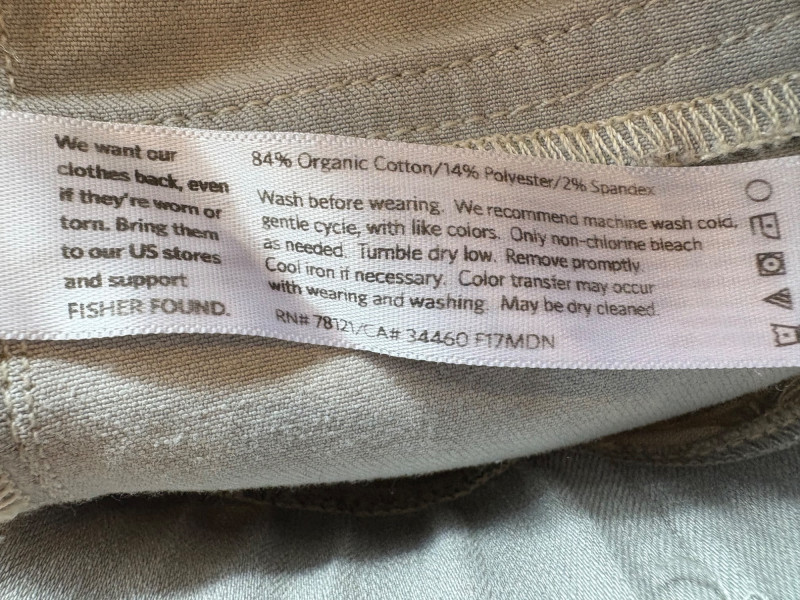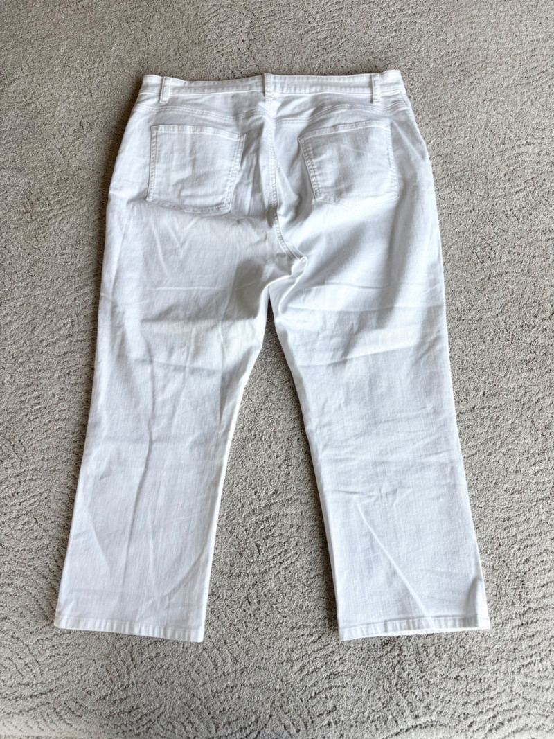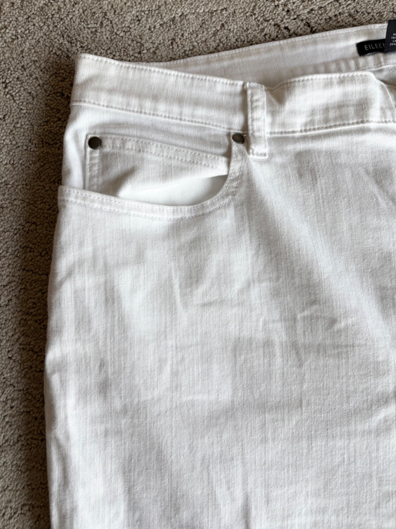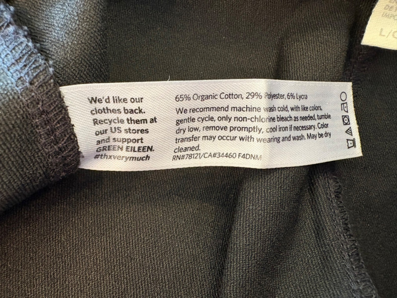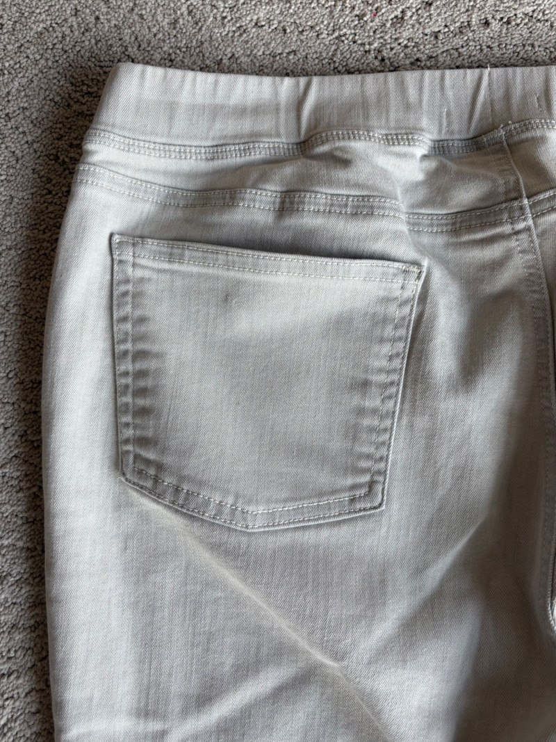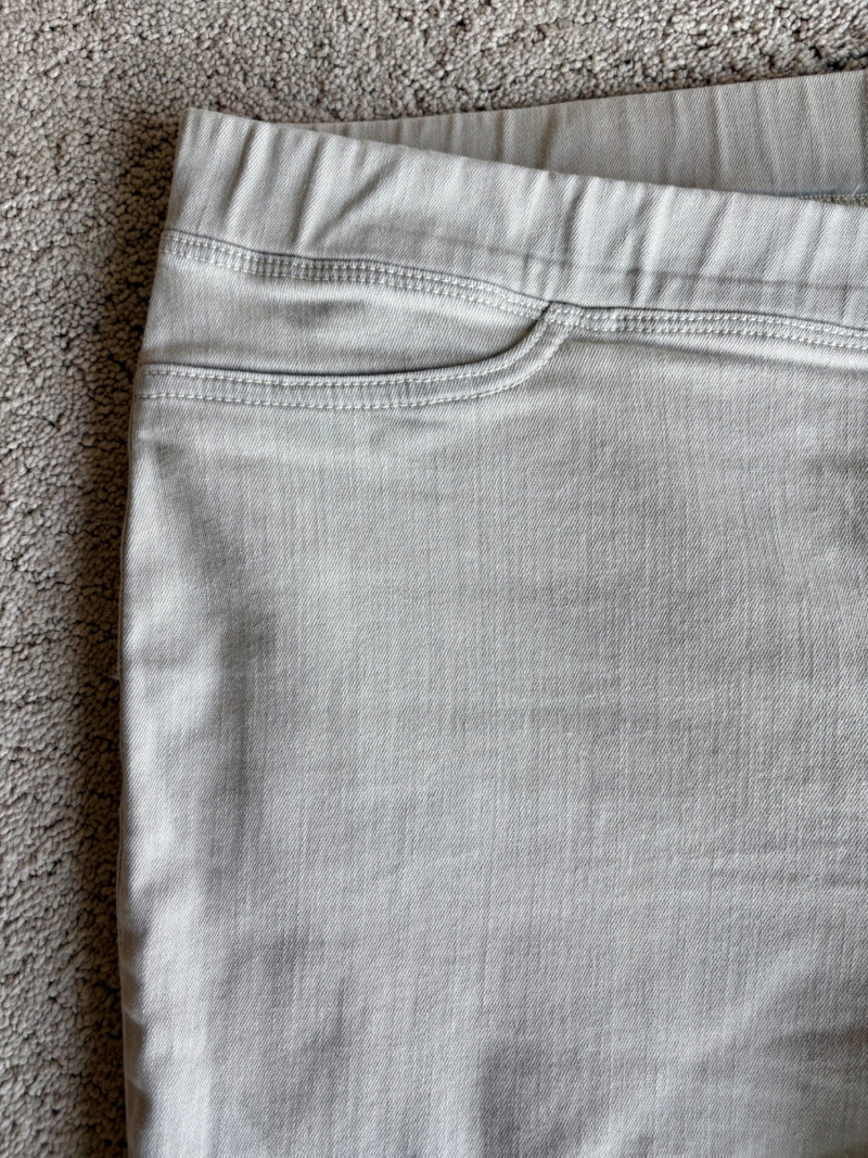 3 terrific pairs of neutral pants from Eileen Fisher. All measure 18.5" side to side at waist. Black slightly iridescent pair have black elastic waistband and no detailing - great for under an oversized top. Organic cotton/polyester/lycra blend. Size tag says L. Pearl grey pants have flat elastic waistband, faux fly, faux front pockets, back patch pockets, and tapered leg. Organic cotton/polyester/spandex blend. Size tag says L. White pants appear to be slightly cropped and have classic 5-pocket jeans styling with straight legs. Organic cotton/spandex. Size tag says 16.