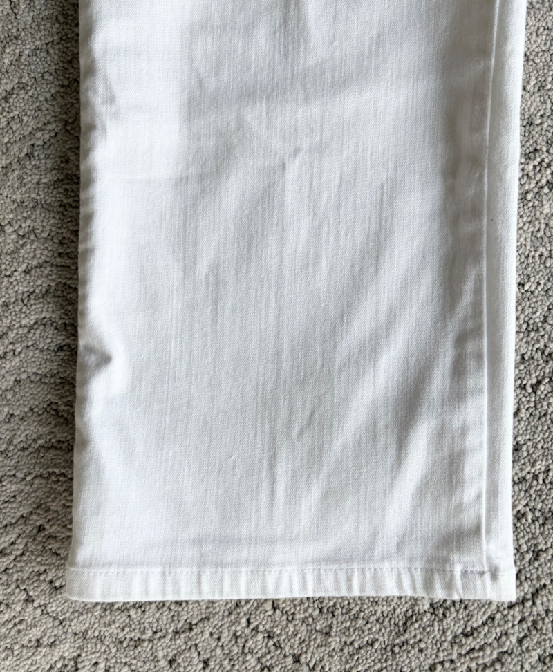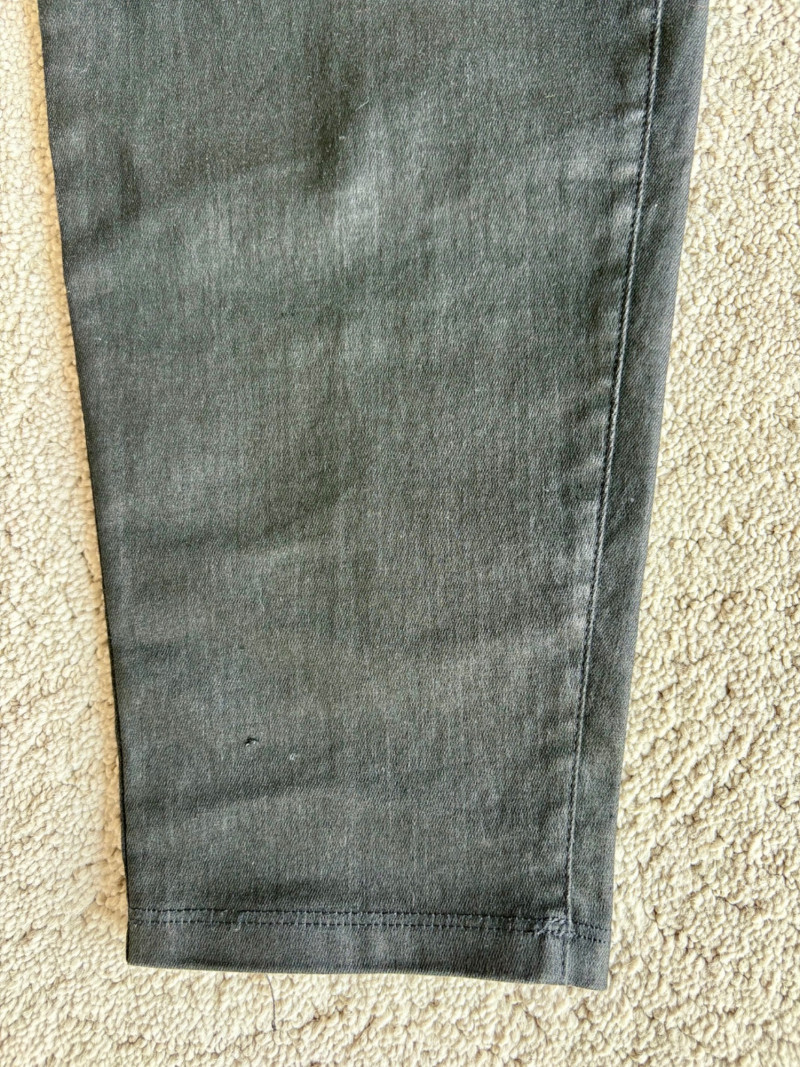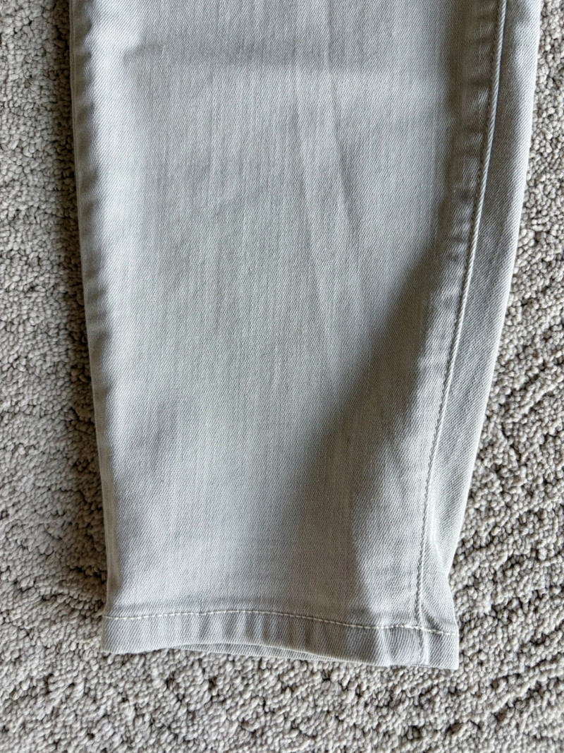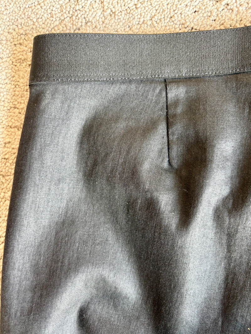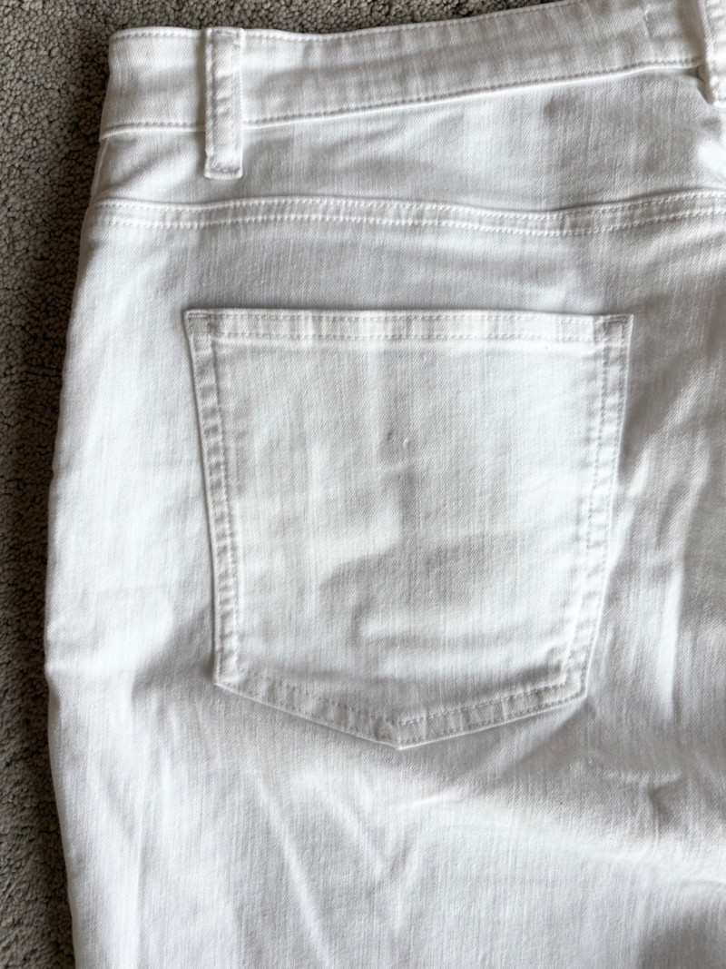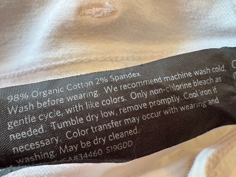 3 terrific pairs of neutral pants from Eileen Fisher. All measure 18.5" side to side at waist. Black slightly iridescent pair have black elastic waistband and no detailing - great for under an oversized top. Organic cotton/polyester/lycra blend. Size tag says L. Pearl grey pants have flat elastic waistband, faux fly, faux front pockets, back patch pockets, and tapered leg. Organic cotton/polyester/spandex blend. Size tag says L. White pants appear to be slightly cropped and have classic 5-pocket jeans styling with straight legs. Organic cotton/spandex. Size tag says 16.