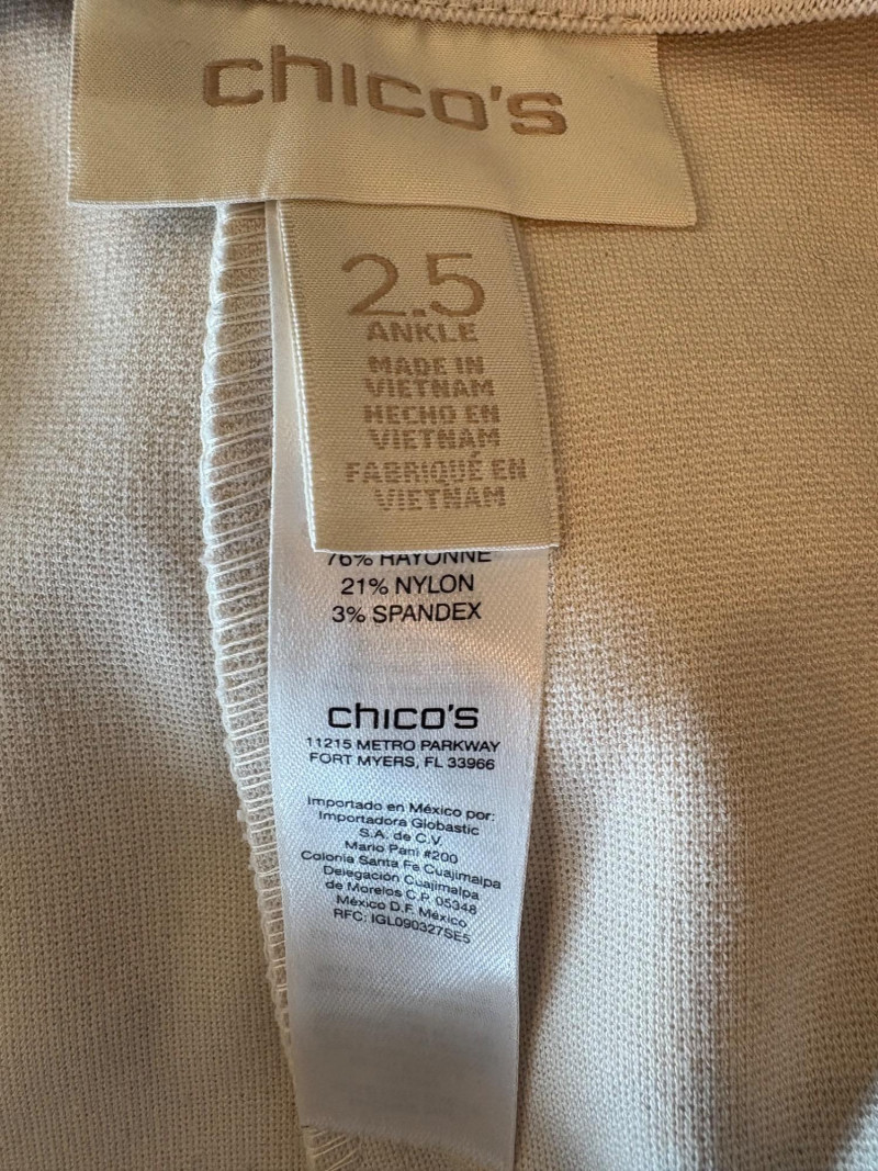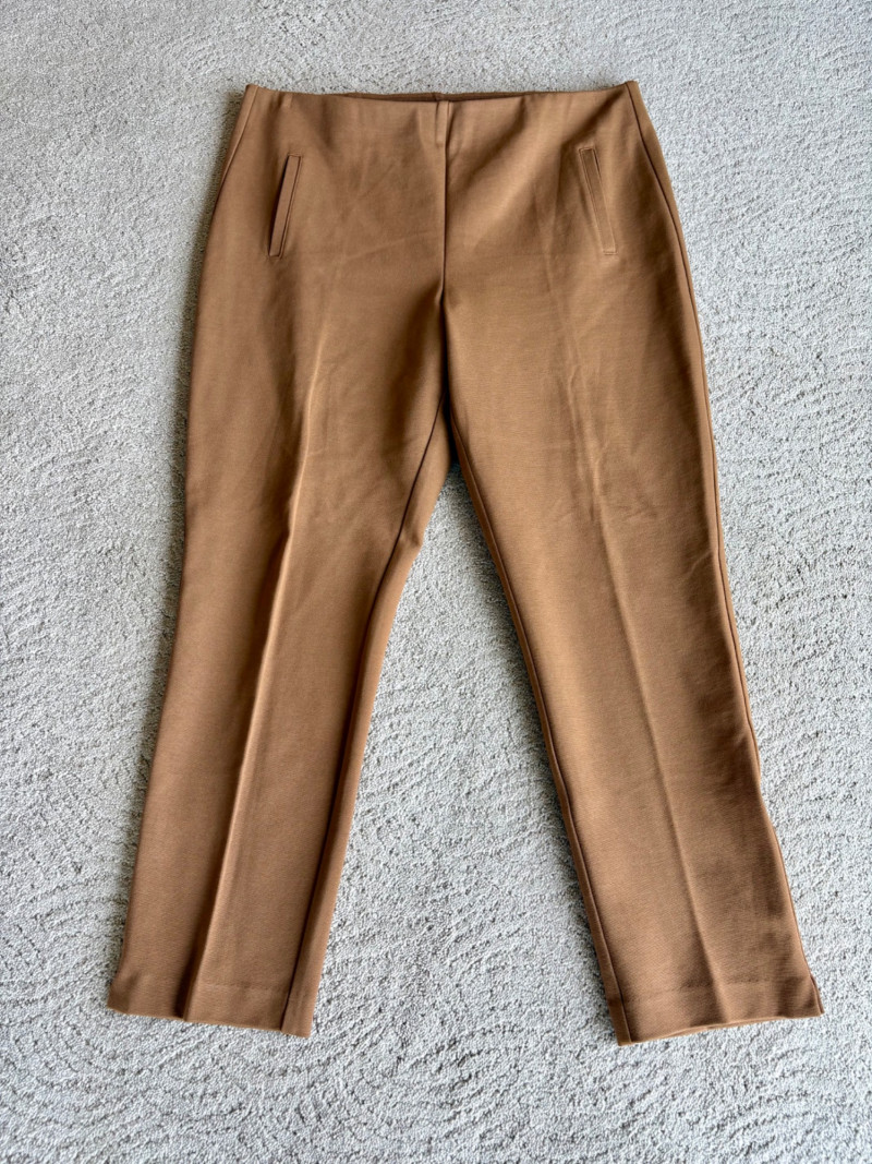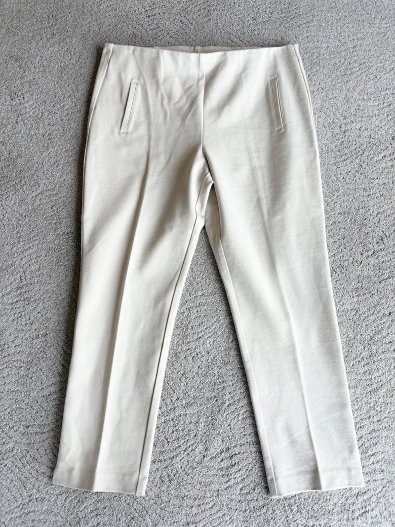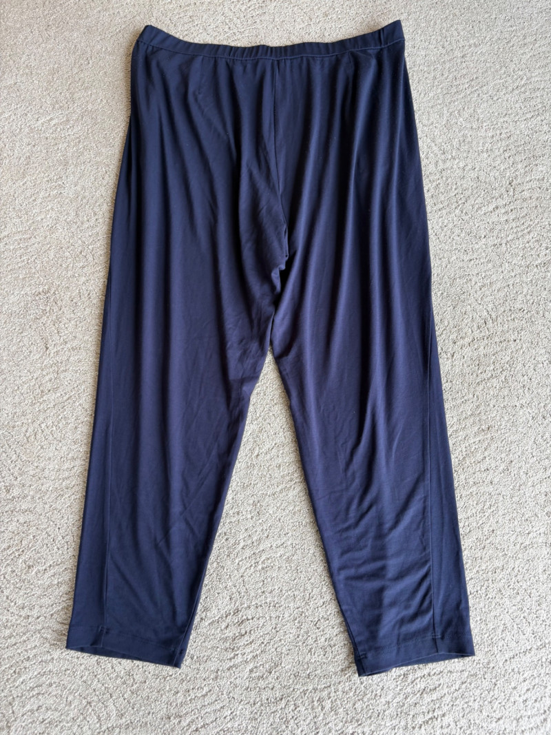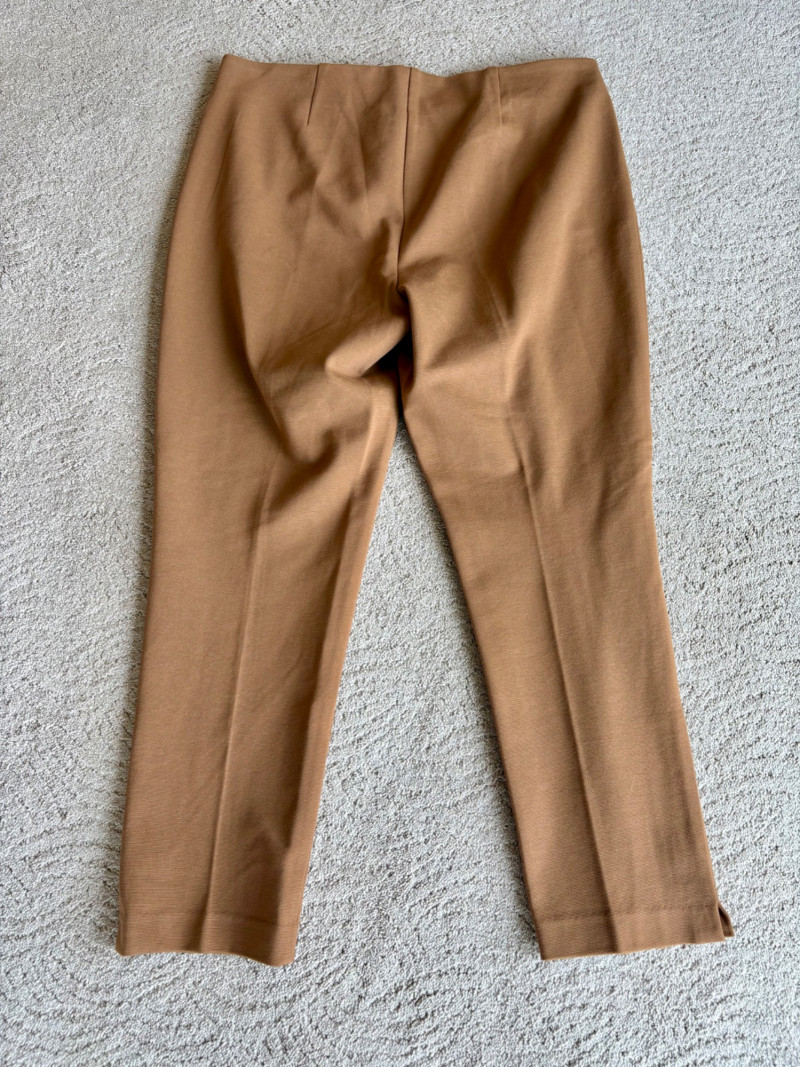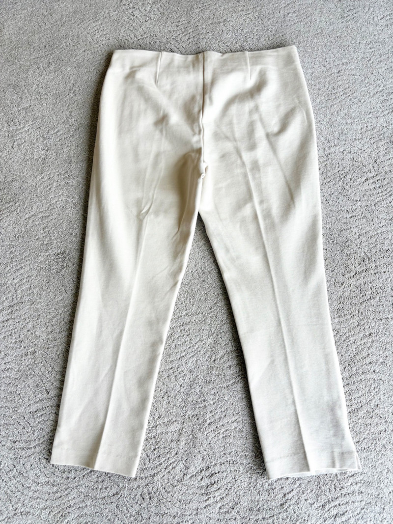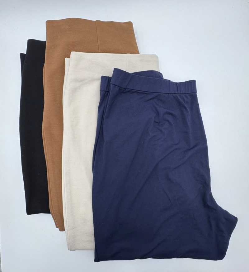 4 pairs of classy knit pants in great mix/match neutral colors. All measure 18.5" side to side at waist. 3 identical pairs of heavy smooth ponte knit pants from Chico's. All have flat hidden elasticated waist, faux welted slash front pockets, back darts, and split hem with 28" inseam. In tan, black, and cream. Rayon/nylon/spandex blend. Size tags say 2.5. Dark navy blue thinner knit pant from Eileen Fisher has elasticated waistband, in-seam side pockets, and great body to the fabric. Viscose/spandex blend. 27" inseam. Size tag says XL. Note that these pants have a bit of pilling that needs the sweater shaver's attention.