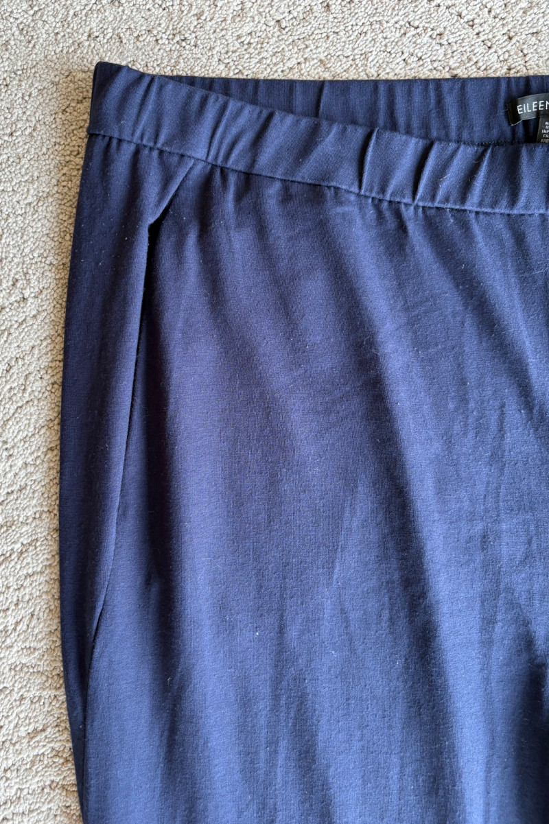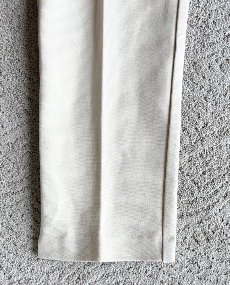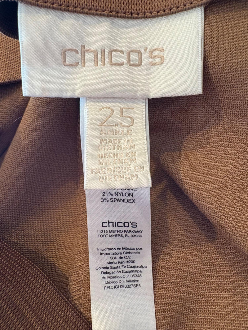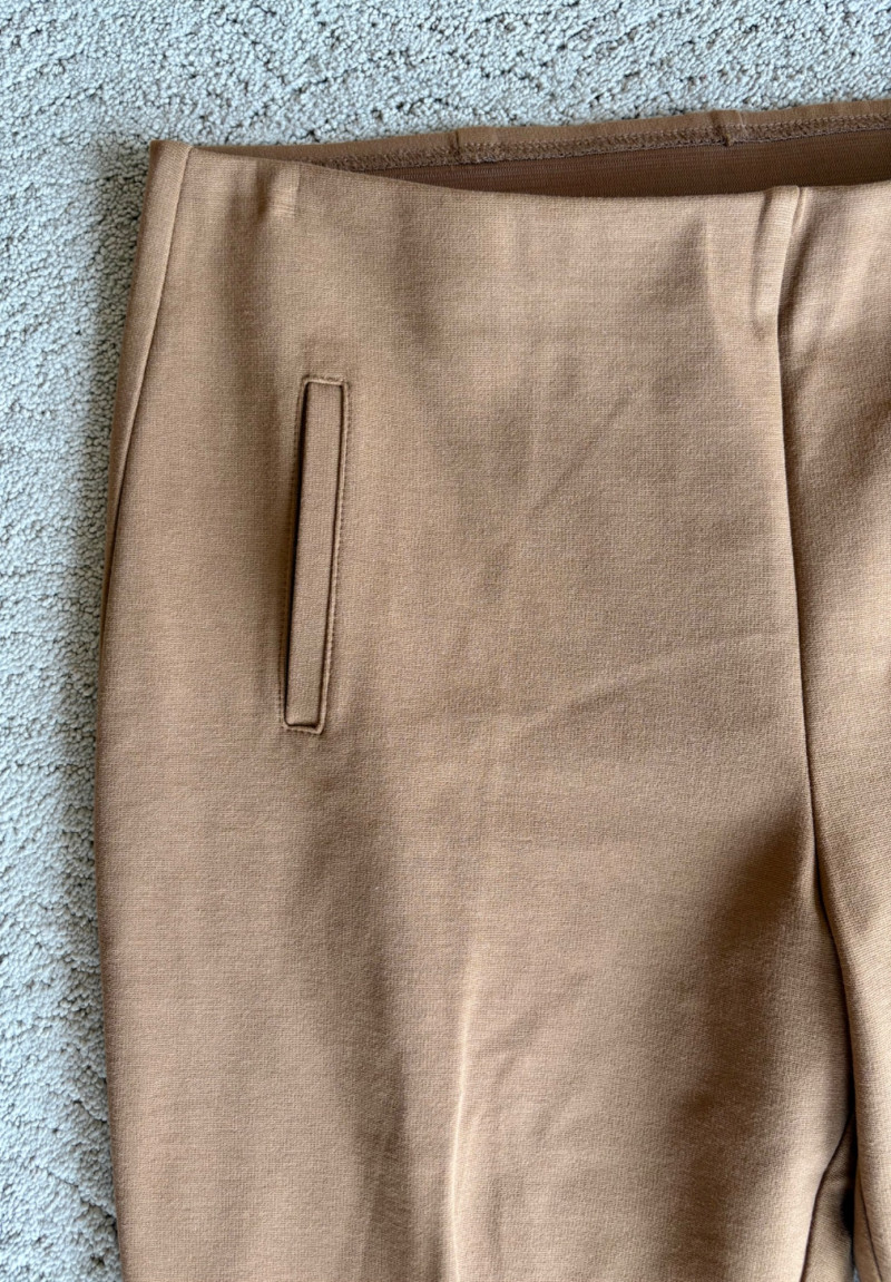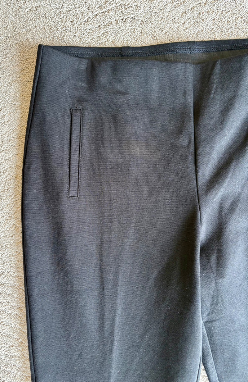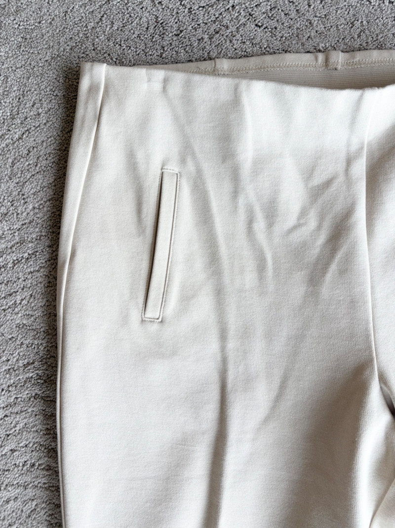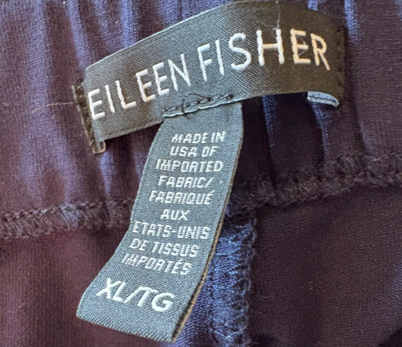 4 pairs of classy knit pants in great mix/match neutral colors. All measure 18.5" side to side at waist. 3 identical pairs of heavy smooth ponte knit pants from Chico's. All have flat hidden elasticated waist, faux welted slash front pockets, back darts, and split hem with 28" inseam. In tan, black, and cream. Rayon/nylon/spandex blend. Size tags say 2.5. Dark navy blue thinner knit pant from Eileen Fisher has elasticated waistband, in-seam side pockets, and great body to the fabric. Viscose/spandex blend. 27" inseam. Size tag says XL. Note that these pants have a bit of pilling that needs the sweater shaver's attention.