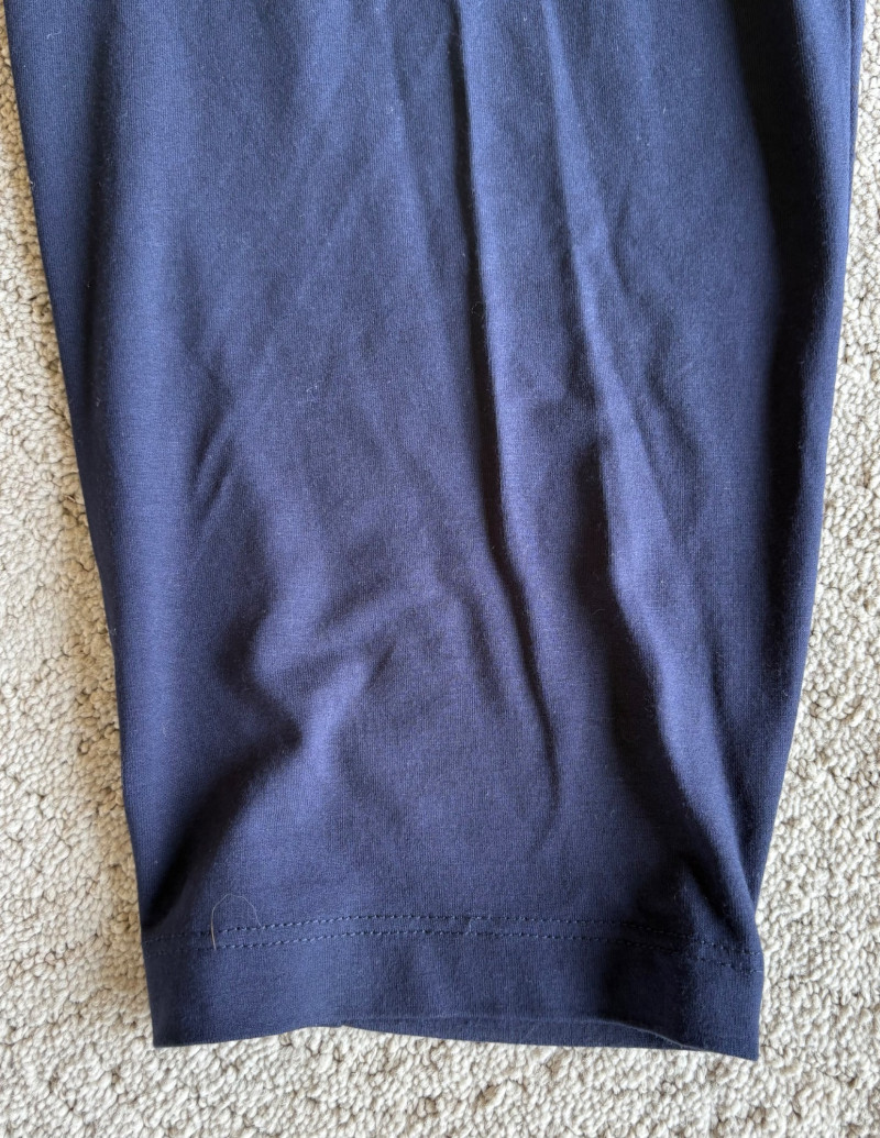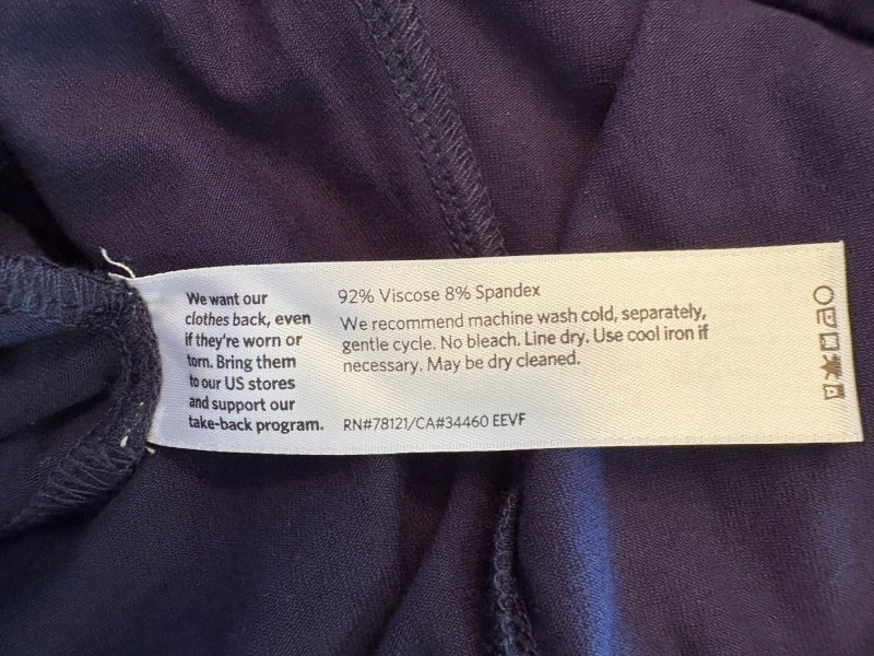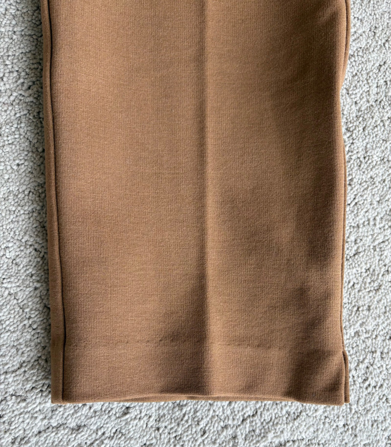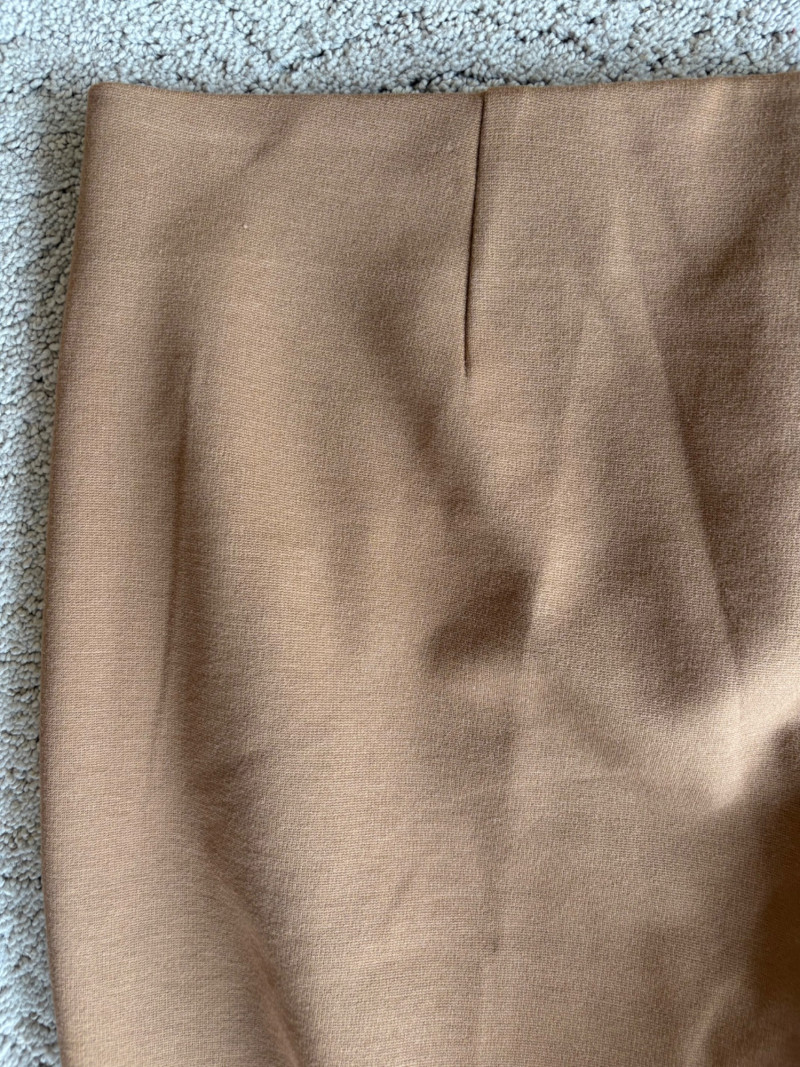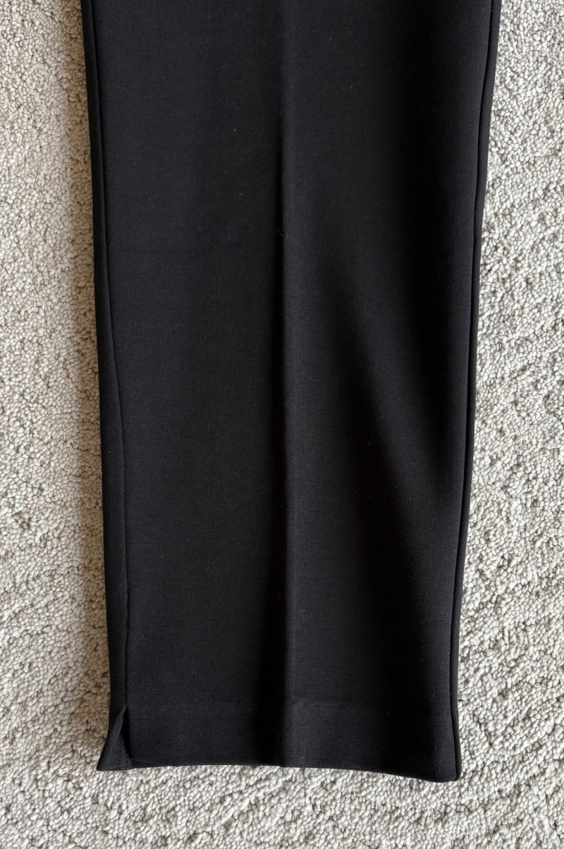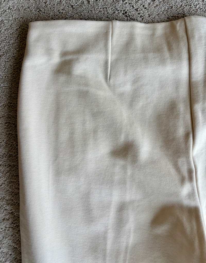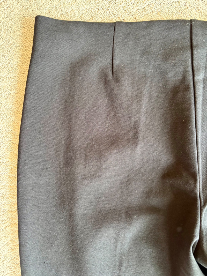 4 pairs of classy knit pants in great mix/match neutral colors. All measure 18.5" side to side at waist. 3 identical pairs of heavy smooth ponte knit pants from Chico's. All have flat hidden elasticated waist, faux welted slash front pockets, back darts, and split hem with 28" inseam. In tan, black, and cream. Rayon/nylon/spandex blend. Size tags say 2.5. Dark navy blue thinner knit pant from Eileen Fisher has elasticated waistband, in-seam side pockets, and great body to the fabric. Viscose/spandex blend. 27" inseam. Size tag says XL. Note that these pants have a bit of pilling that needs the sweater shaver's attention.
